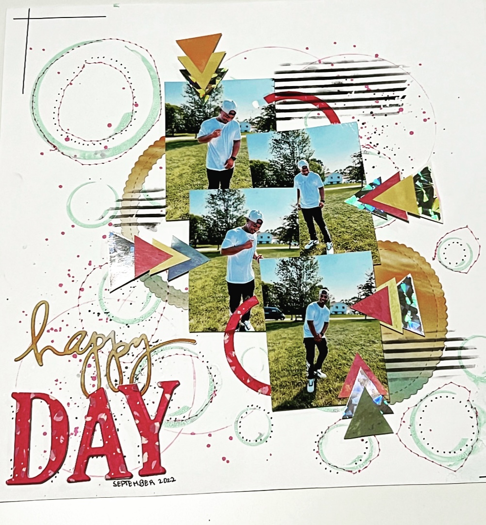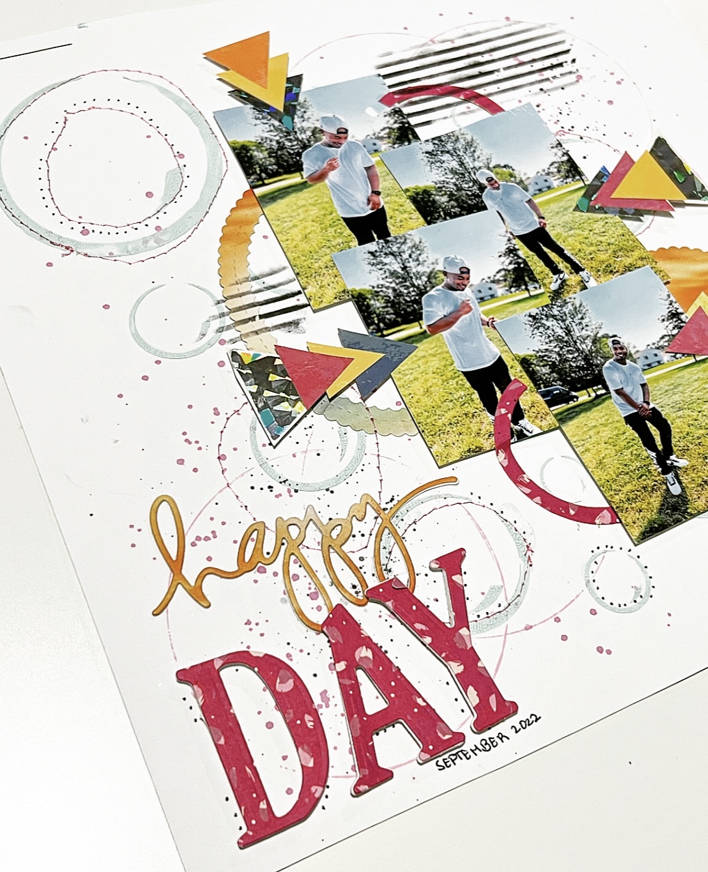 I added some splatters to finish the mixed-media element of my layout. Finally I used some words from my stash to label how I felt. It is worded appropriately : HAPPY DAY. Because it was. ☺️☺️