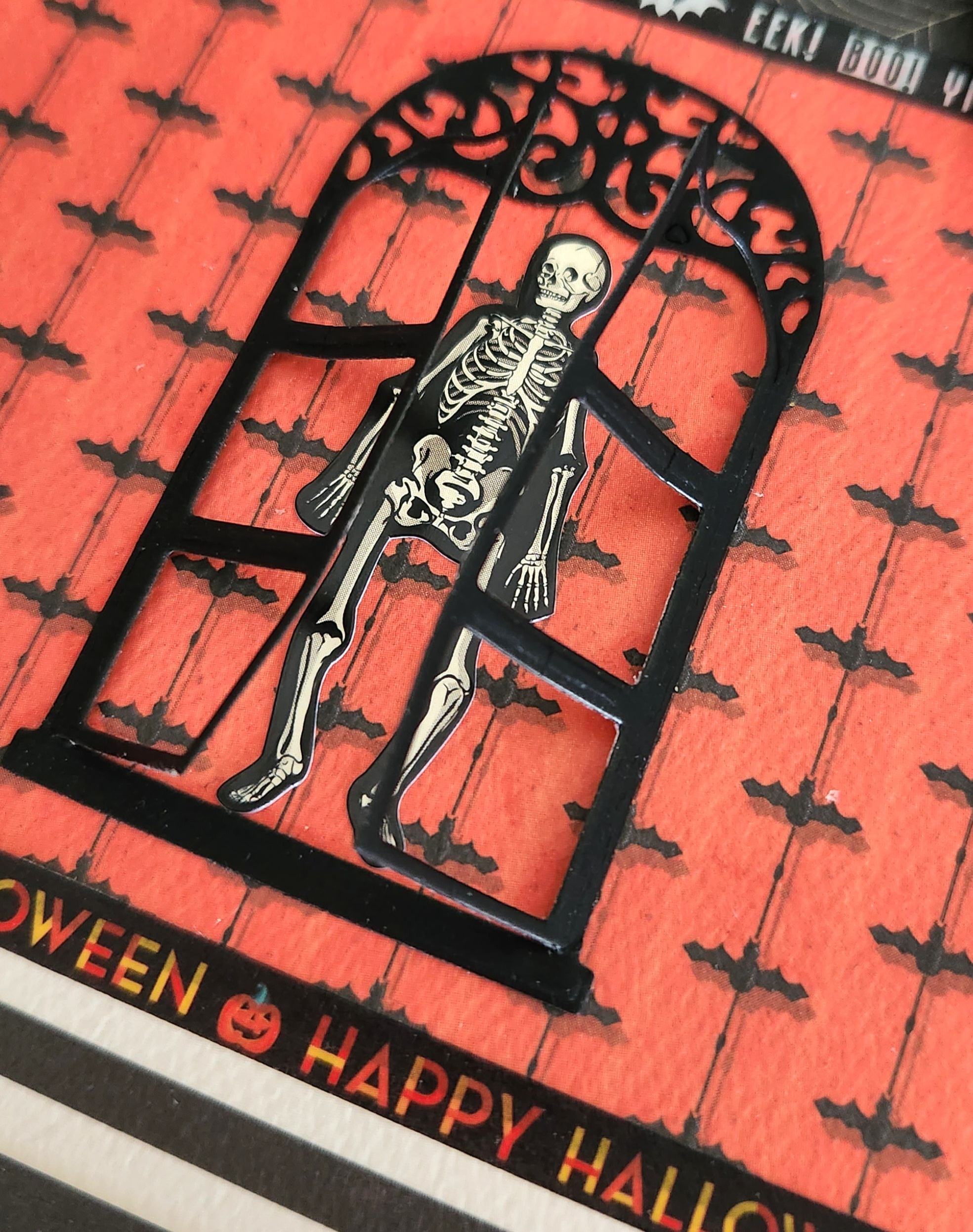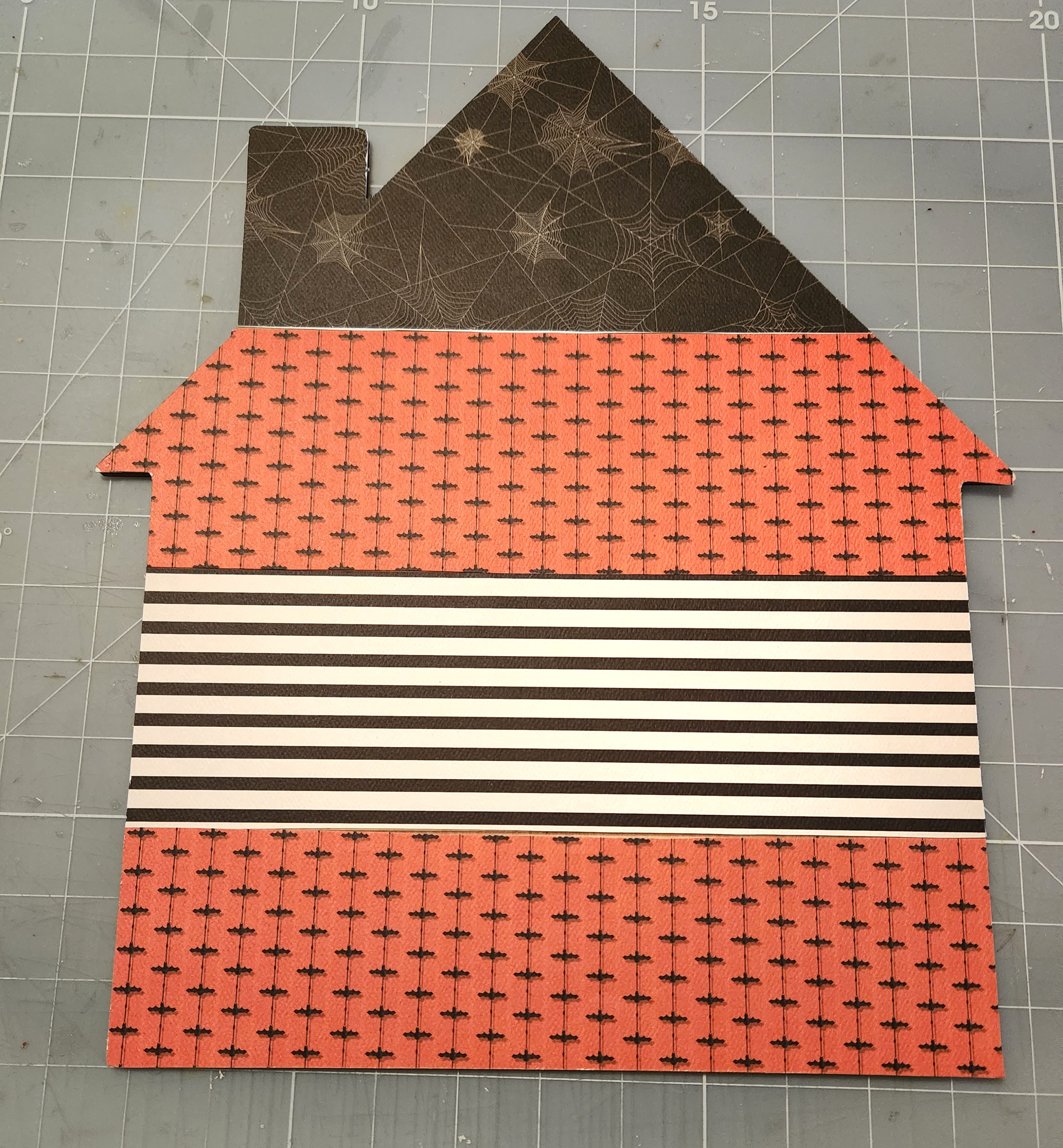 Once all your papers are in place, I took some Halloween sentiment washi tapes and adhered along the bottom edge of each section of my house.