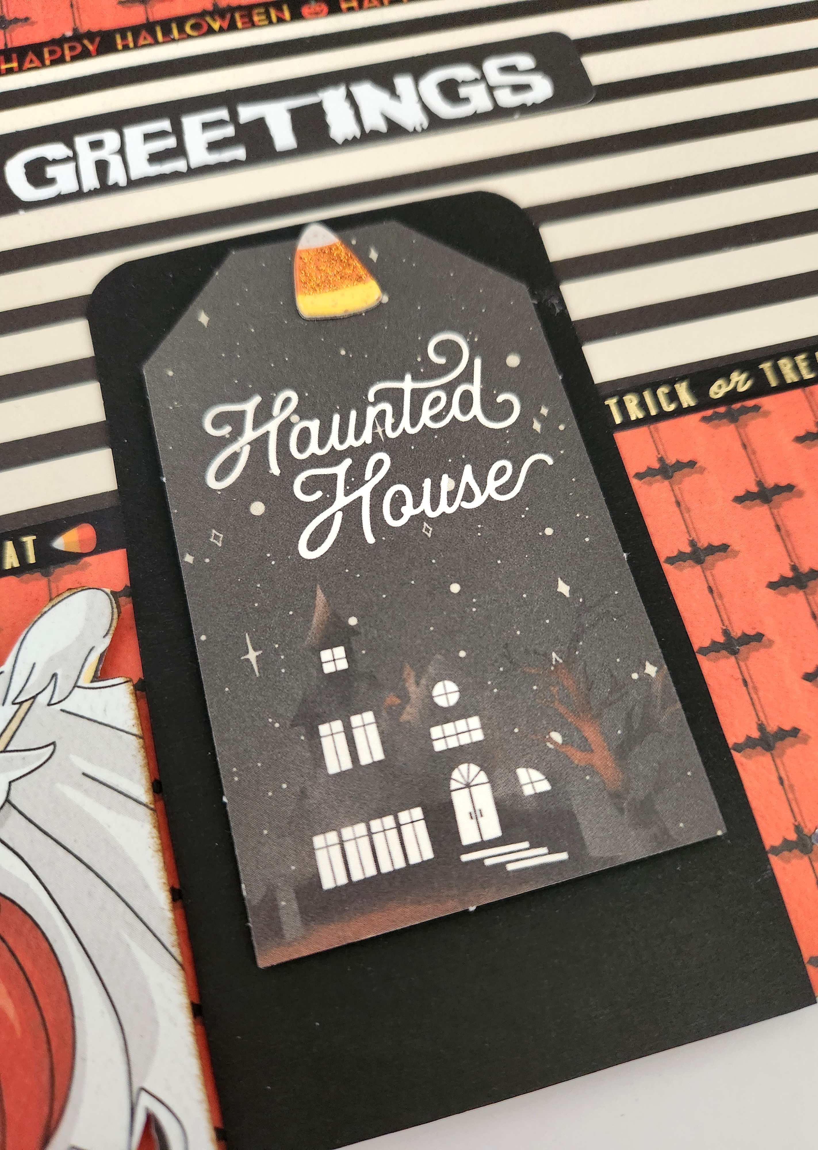 For my door, I just cut out a piece of black cardstock measuring 2 & 1/2 x 4 & 1/2 inches. If you have a diecut for the door, feel free to use that. I rounded the top two upper corners on my door before adhering along the bottom edge of my house. I added an ephemera tag onto my door using foam dots. I added a candy corn chipboard sticker on top to cover up the hole on my tag.
