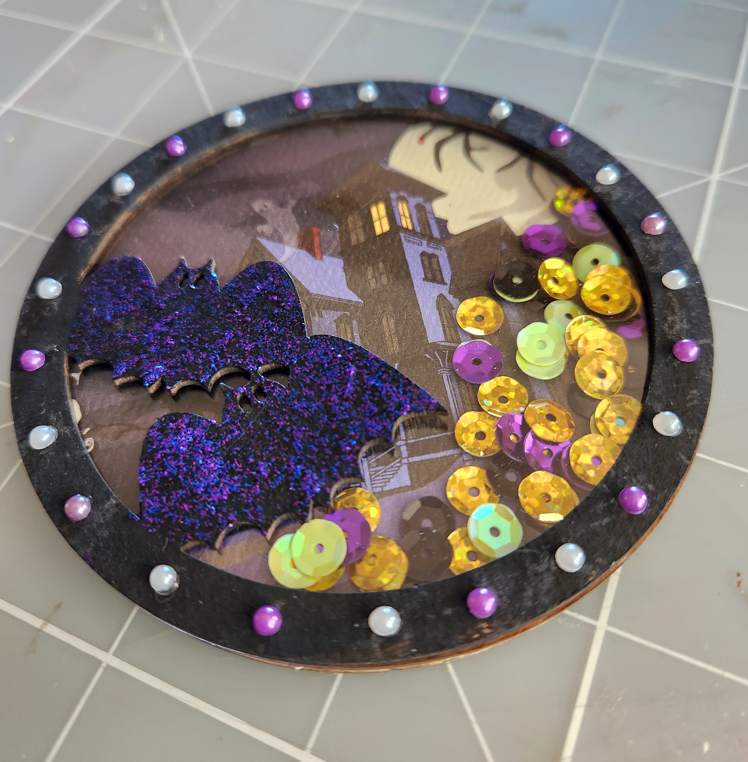 Set your house aside for now. We will start to create our mini shaker next. Remove your shaker pieces from your package. Taking your top shaker piece, I painted the bats and around the circle edge, using black acrylic paint. Let dry. Now taking some Stickles-Dark Blue, I applied some onto my bats using a small brush. This adds a nice purple sparklely touch! Now take your bottom shaker piece, trace onto another coordinating paper. Cut, glue and trim away any excess paper. The smooth away any rough edges using a Distress tool. Now glue the two chipboard shaker pieces in place. Fill your shaker with some sequins, beads, buttons, whatever you prefer. I chose Clear Scraps Spooky sequins, since they match so perfectly with color scheme on my shaker. Next add your acrylic layer, but be sure to peel off the protective film from both sides before adhering. Add your top shaker piece in place. To finish my shaker, I added some purple and white pearls around the circle edge. Let your shaker dry throughly before shaking! Otherwise your sequins will stick to the sides.