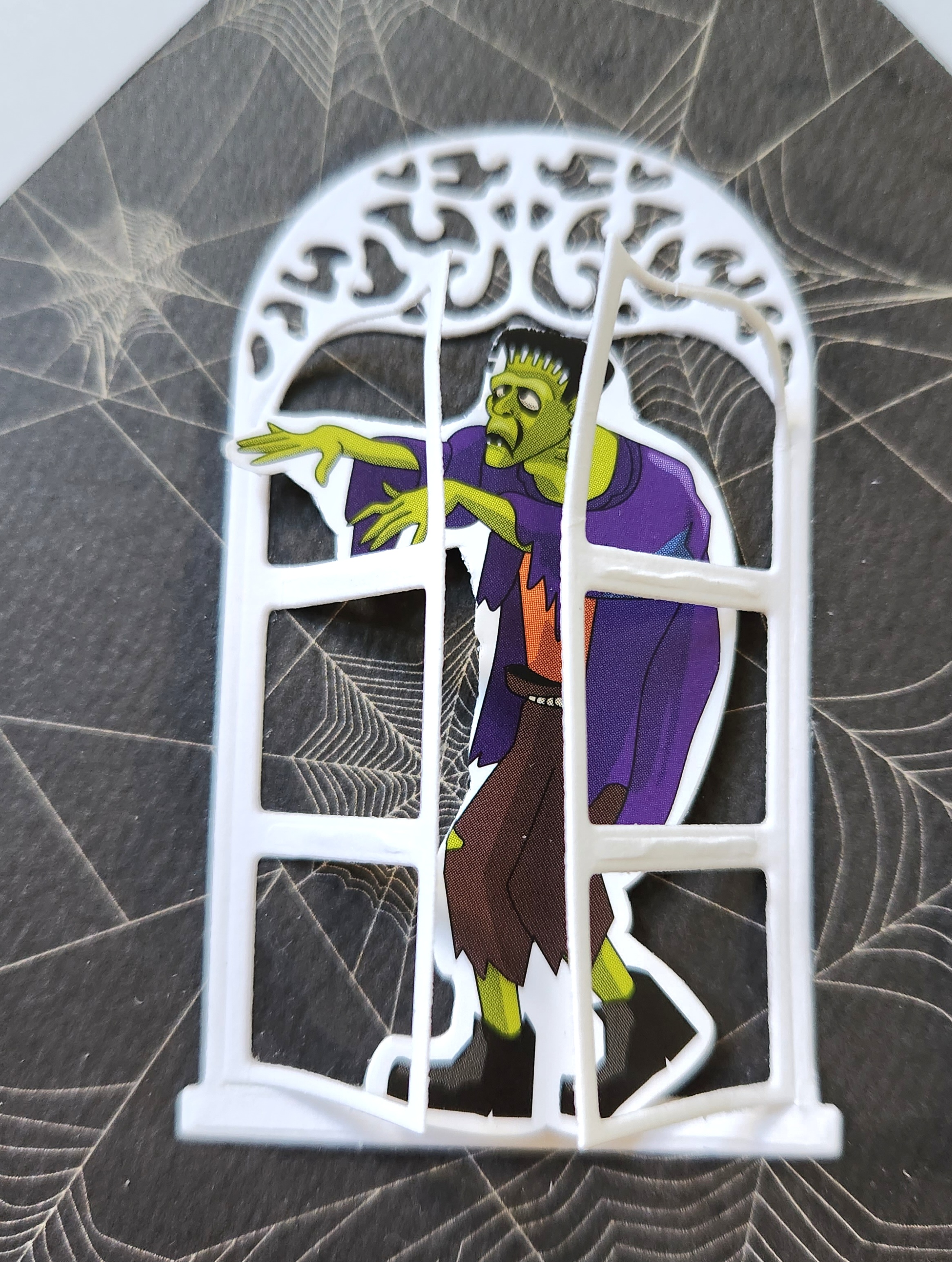 After your shaker has dried, I glued it onto part of the upper right side of my roof! I cut out some images from my stickers, and ephemera tag to adhere behind each window. Adding foam dots to the back of my Frankstein before adhering. I added acouple puffy ghost stickers on each side of the window on the left side.
