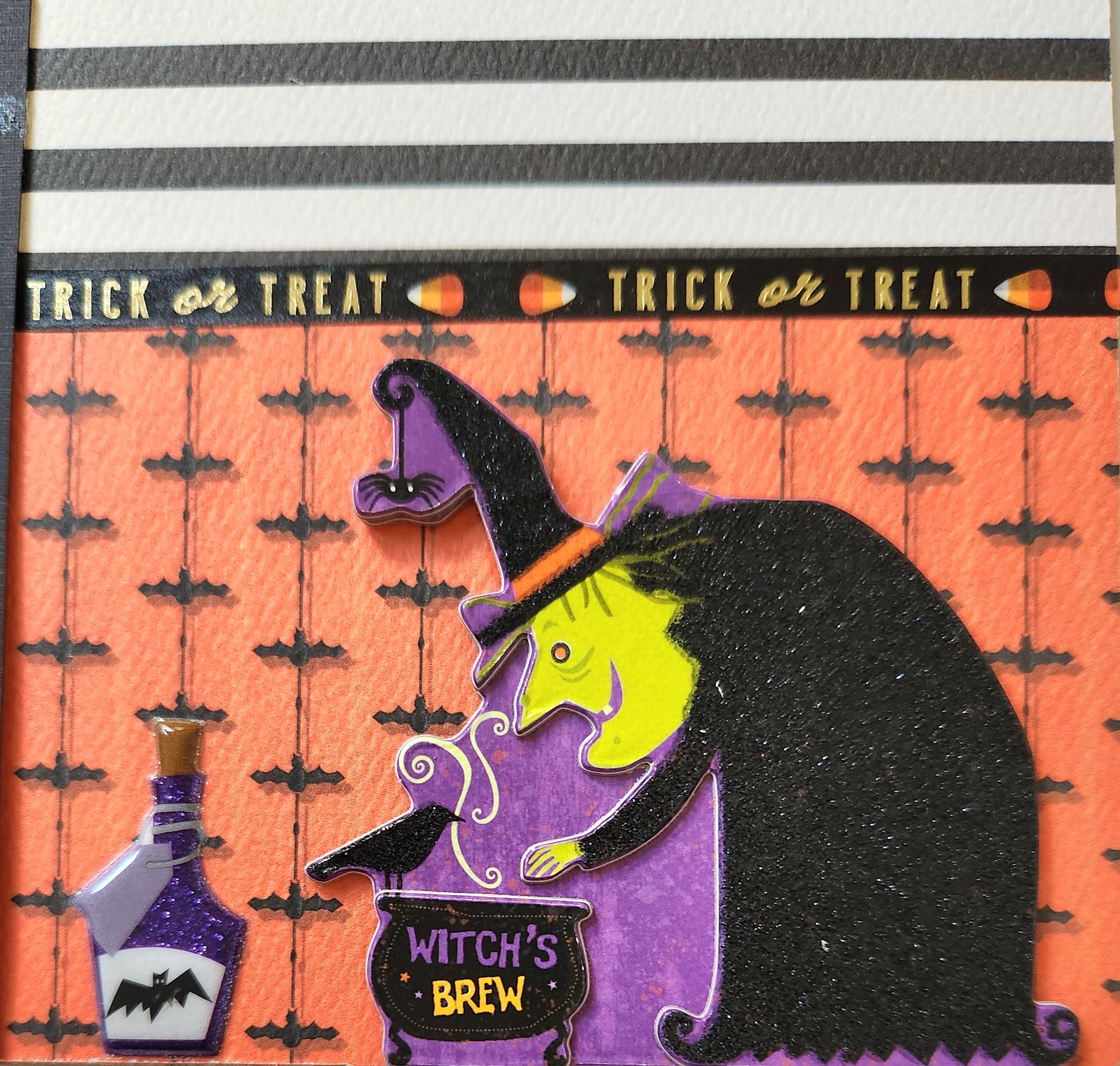 Other Supplies Used: Black and white cardstock, black acrylic paint, Stickles -Dark Blue, Distress tool, xaco knife, scissors, Carta Bella Hocus Pocus paper collection, sequins, Beacon glue, foam dots, pipe cleaners-orange/green/gold, corner rounder, pearl gems in purple and white, Recollection Halloween washi tapes