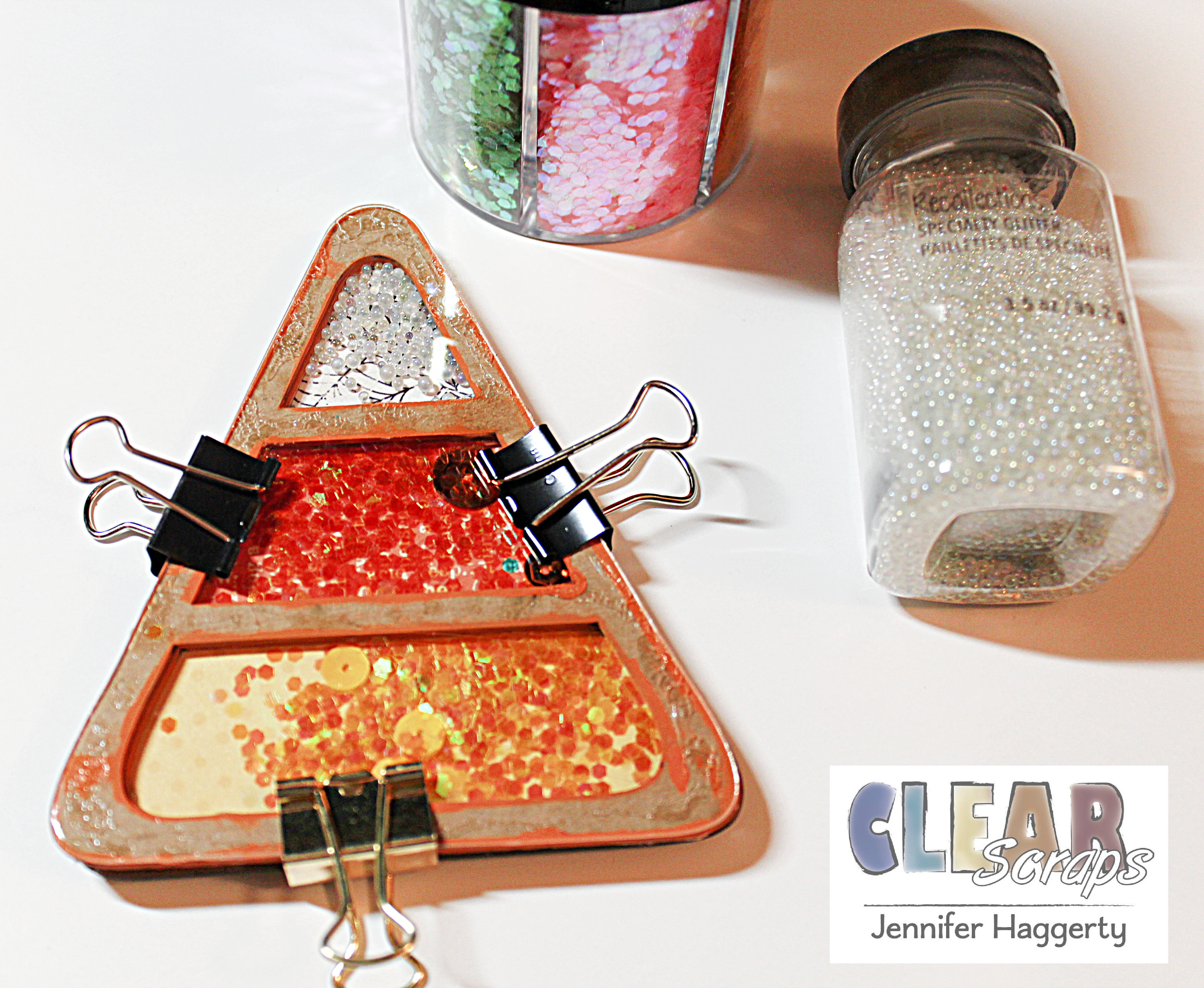 I placed orange, yellow, and white sequins in the appropriate spots and then adhered my acrylic piece. I find it helpful to use clips to hold my pieces together while the adhesive dries.