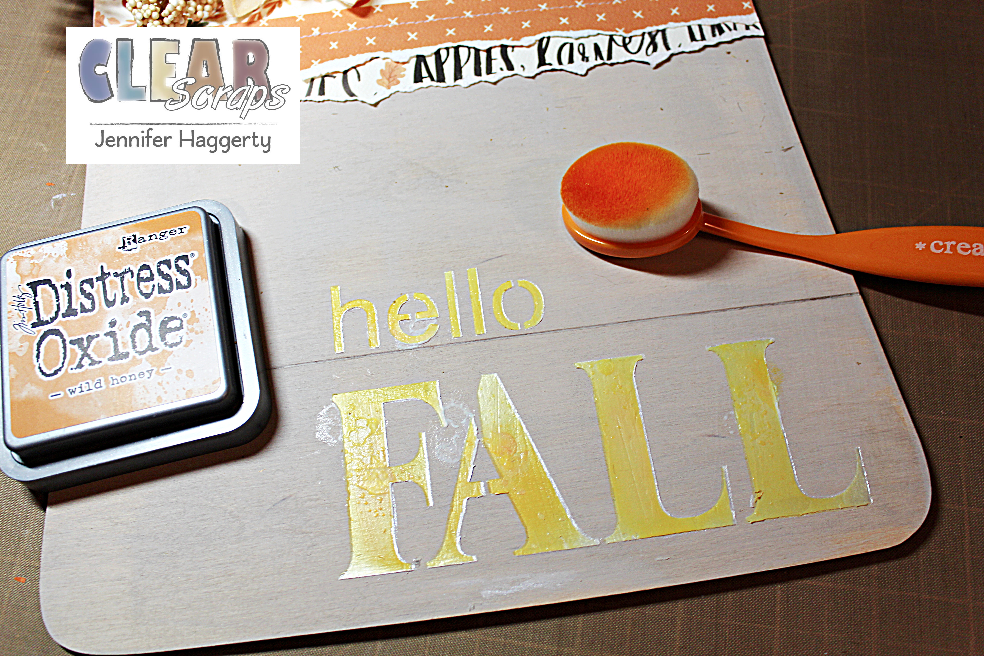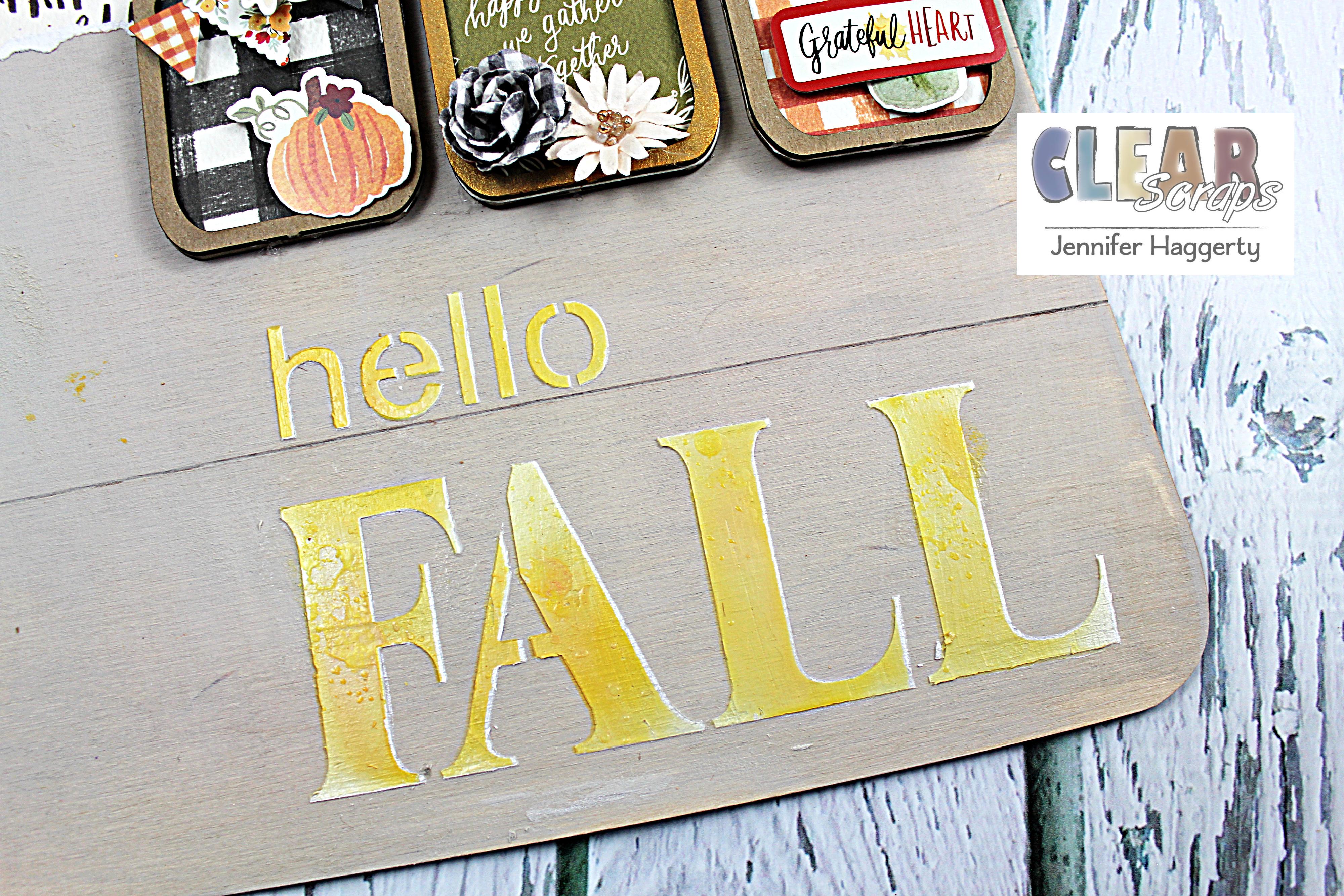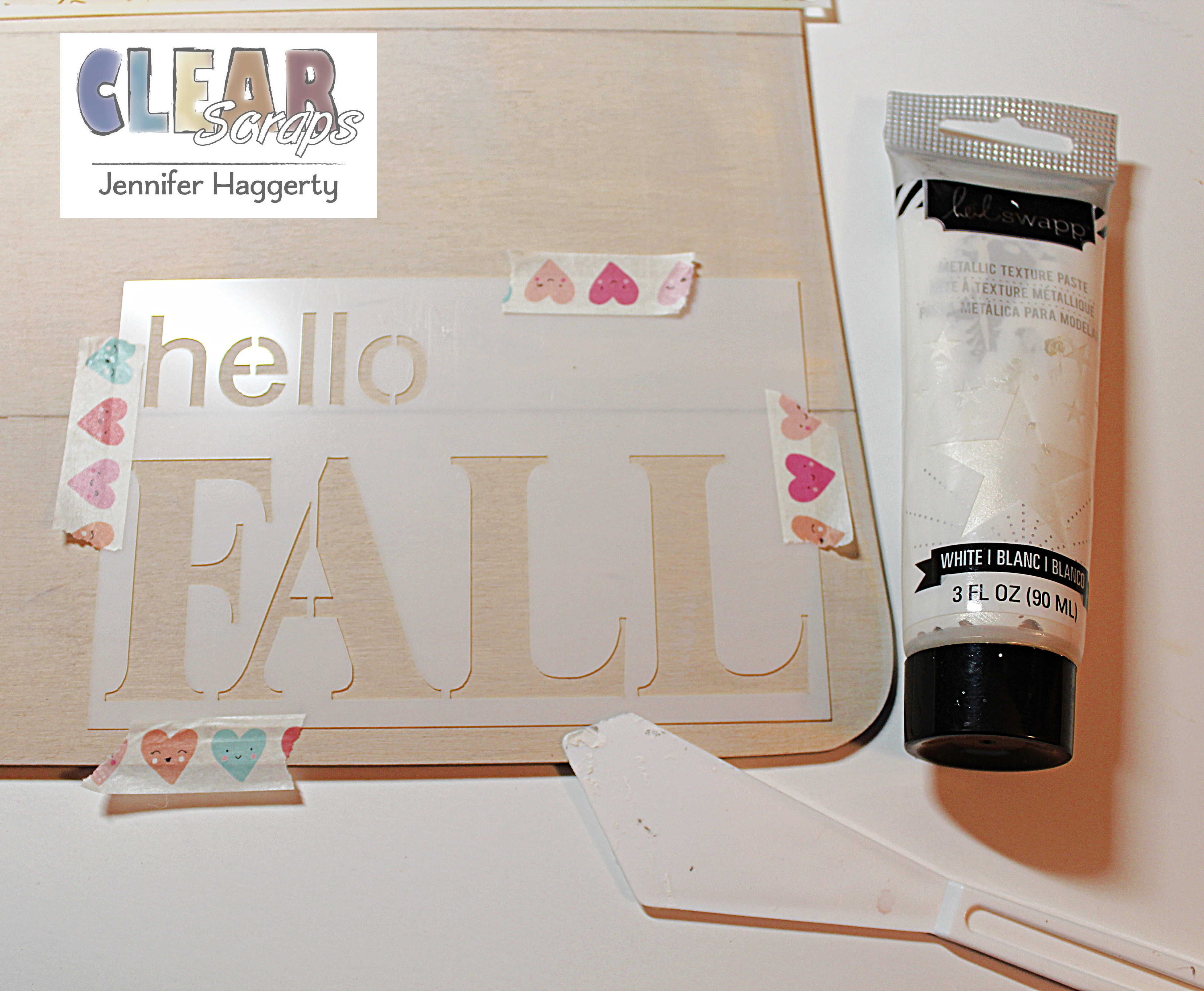 Using the 4×6 Hello Fall Stencil, I secured it to the bottom right hand corner of my Cutting Board. I had just enough of some of my metallic paste left for my project to use and applied with a spatula. I allowed ample time for the paste to dry with my stencil still in place.