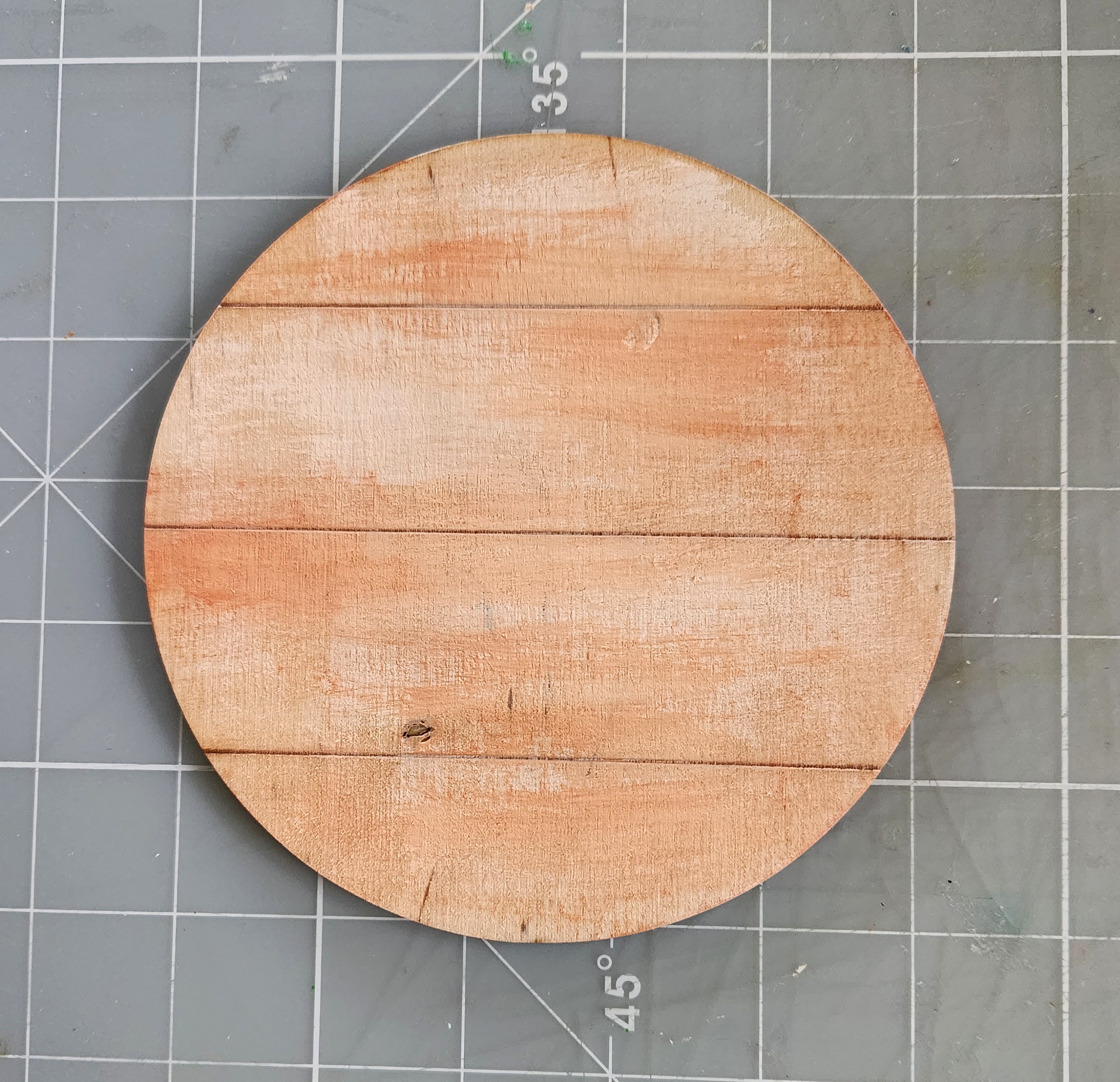 Take your Clear Scraps Shiplap Circle-small I whitewashed some Chalk Paint "Milk Jug " using a paintbrush. Then I applied some Orange Spice paint over top in the same whitewash technique as before. Set aside to dry throughly.