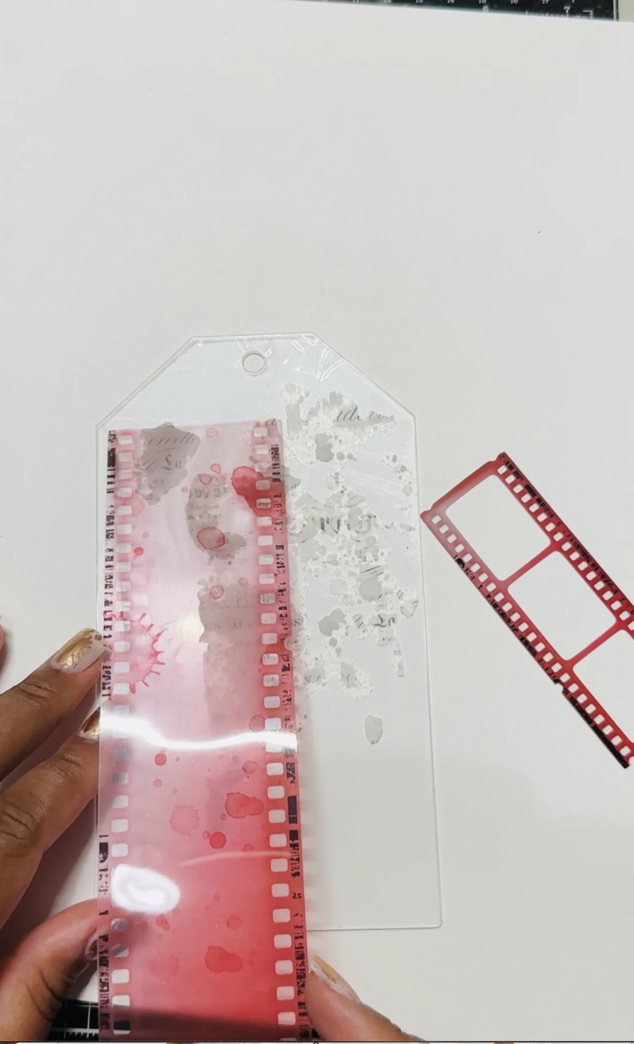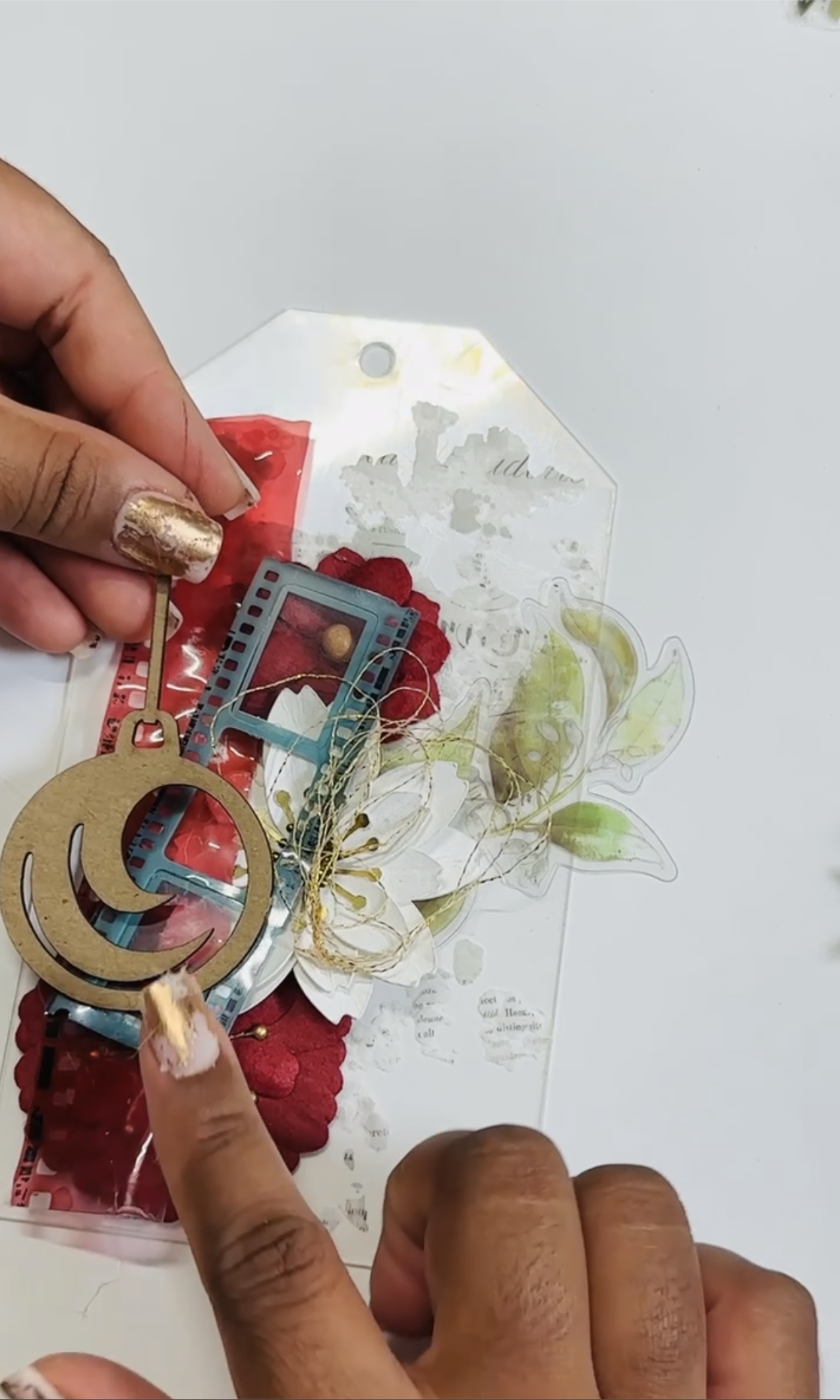 Once that is completed, adhere your chipboard bulb to the tag. From there, layer on more elements. I chose to add heat to some of my acetate elements to add movement. This further added interest to the tag as each element was layered on.
