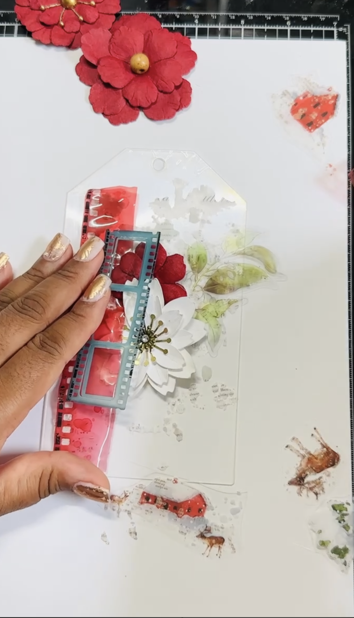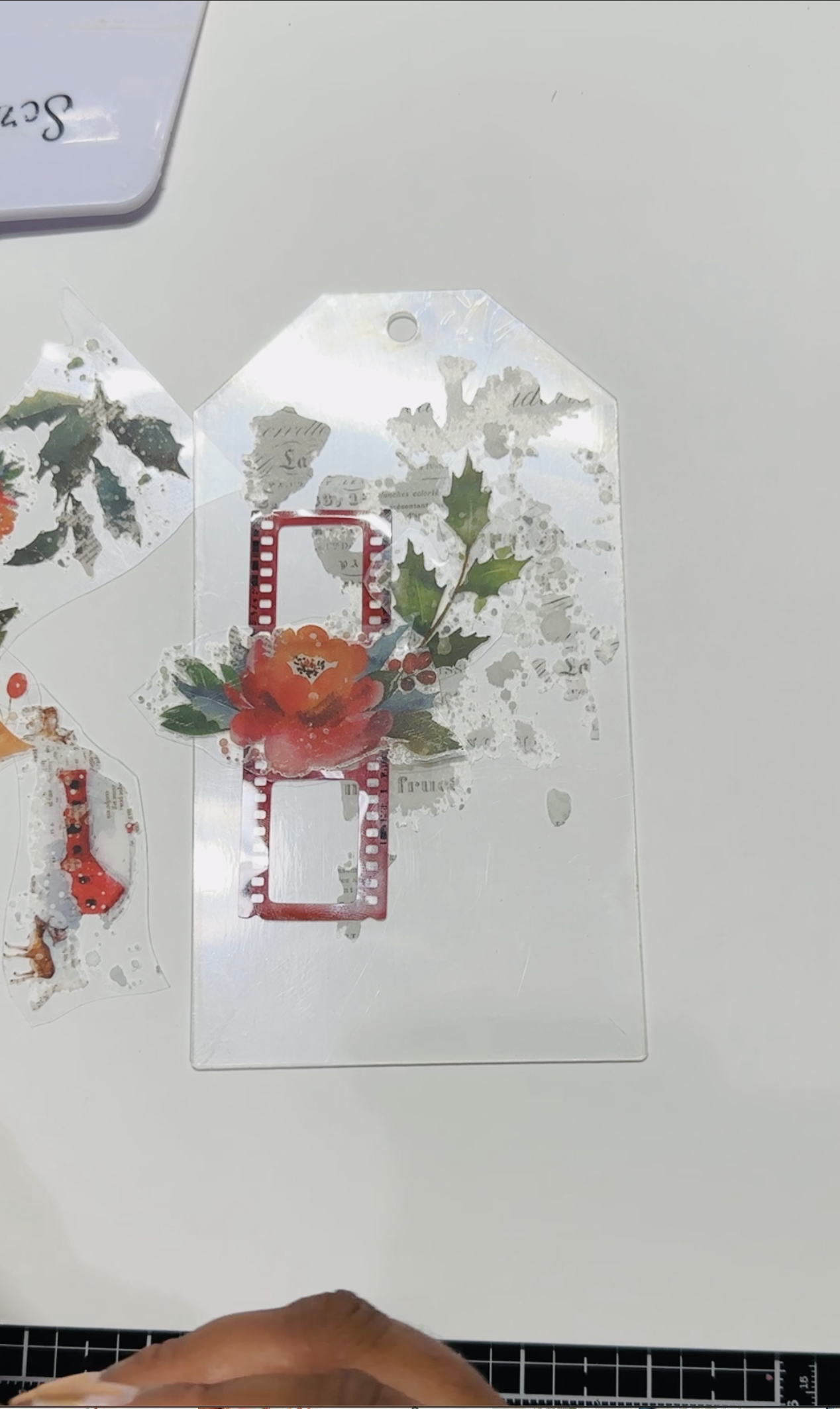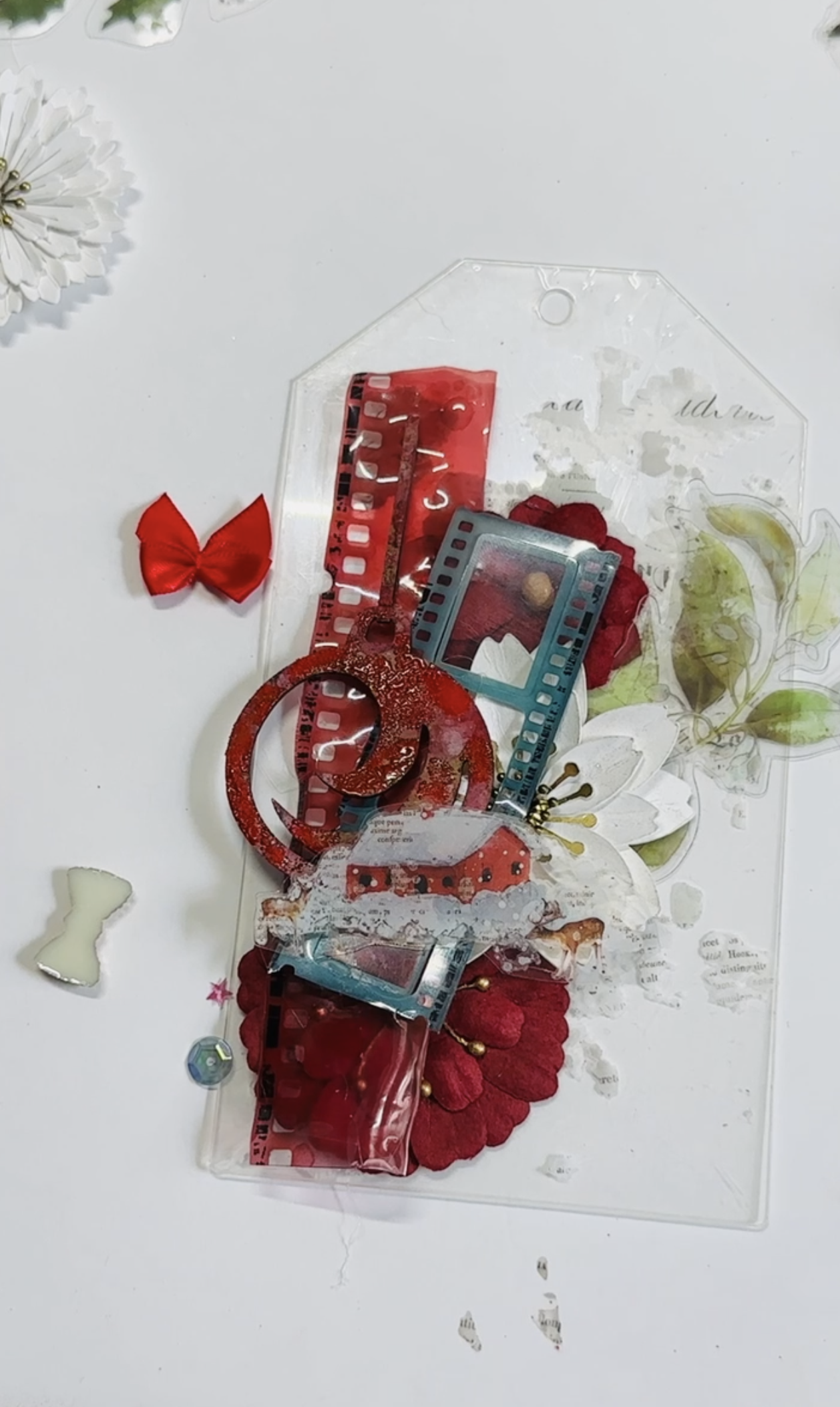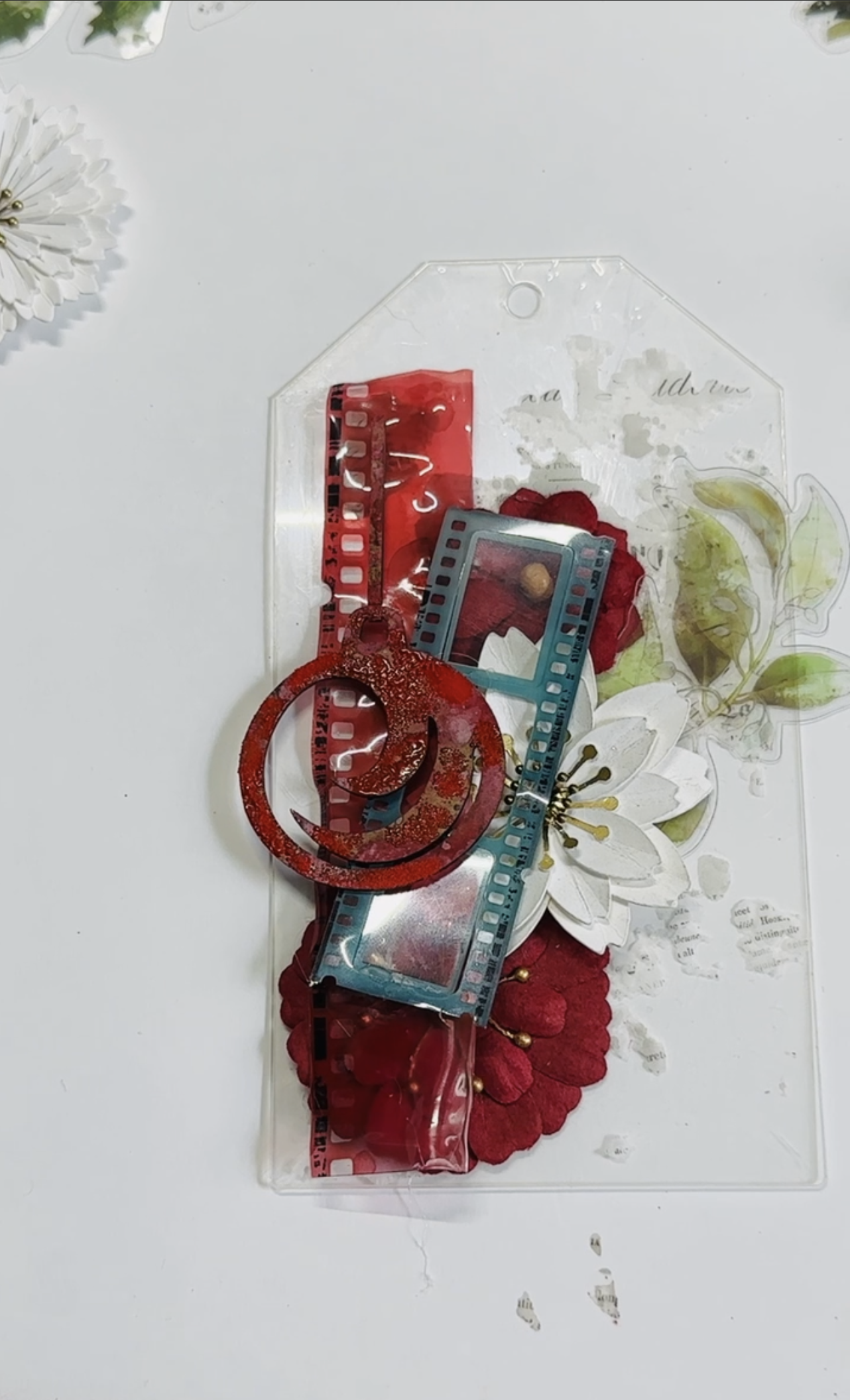 Now grab your ephemera pieces. I chose to use a mix of acetate images and flowers to embellish this tag. Layer those up to form a colorful base.