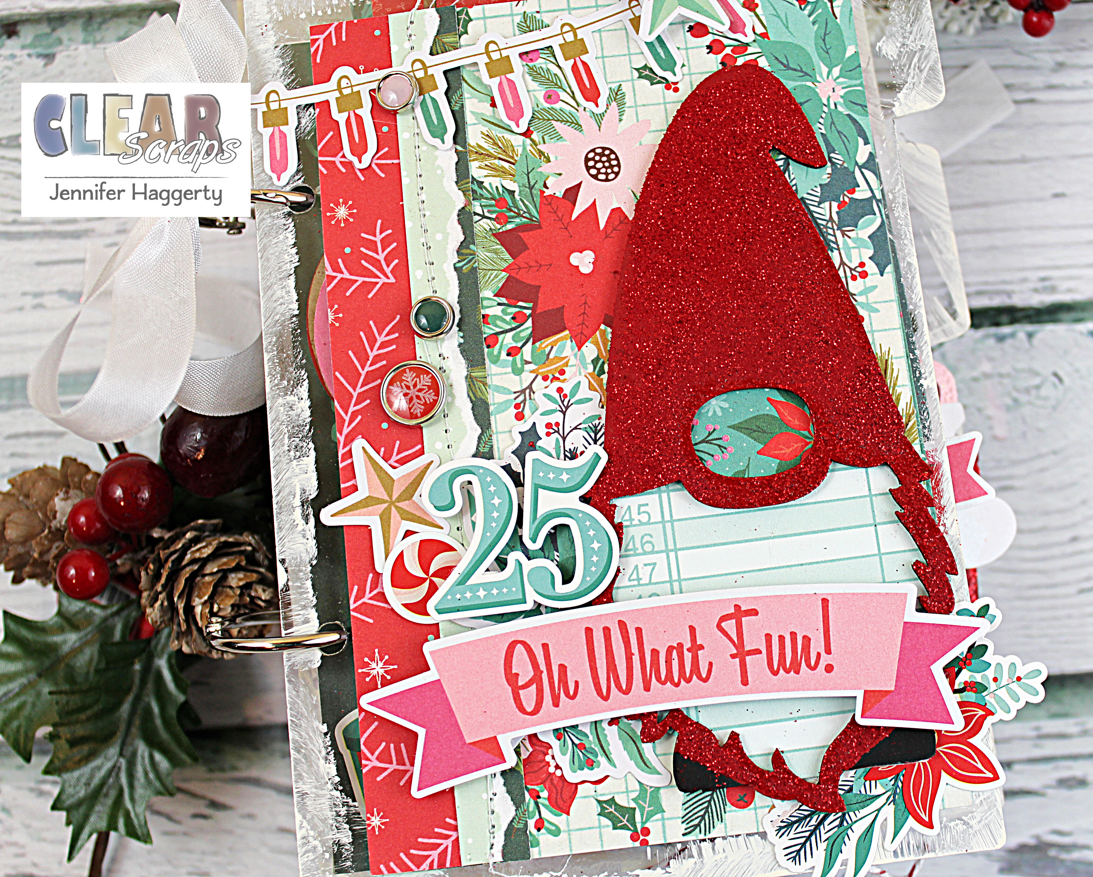 The "star" of the front of my album is the new Gnome Chipboard Embellishment Shape. I painted the chipboard first with red and black chalk paint. Once my paint was dry, I added embossing ink followed by red embossing powder to to give my gnome some shine. Then using my Beacon Adhesive, I backed patterned paper behind the nose and beard.