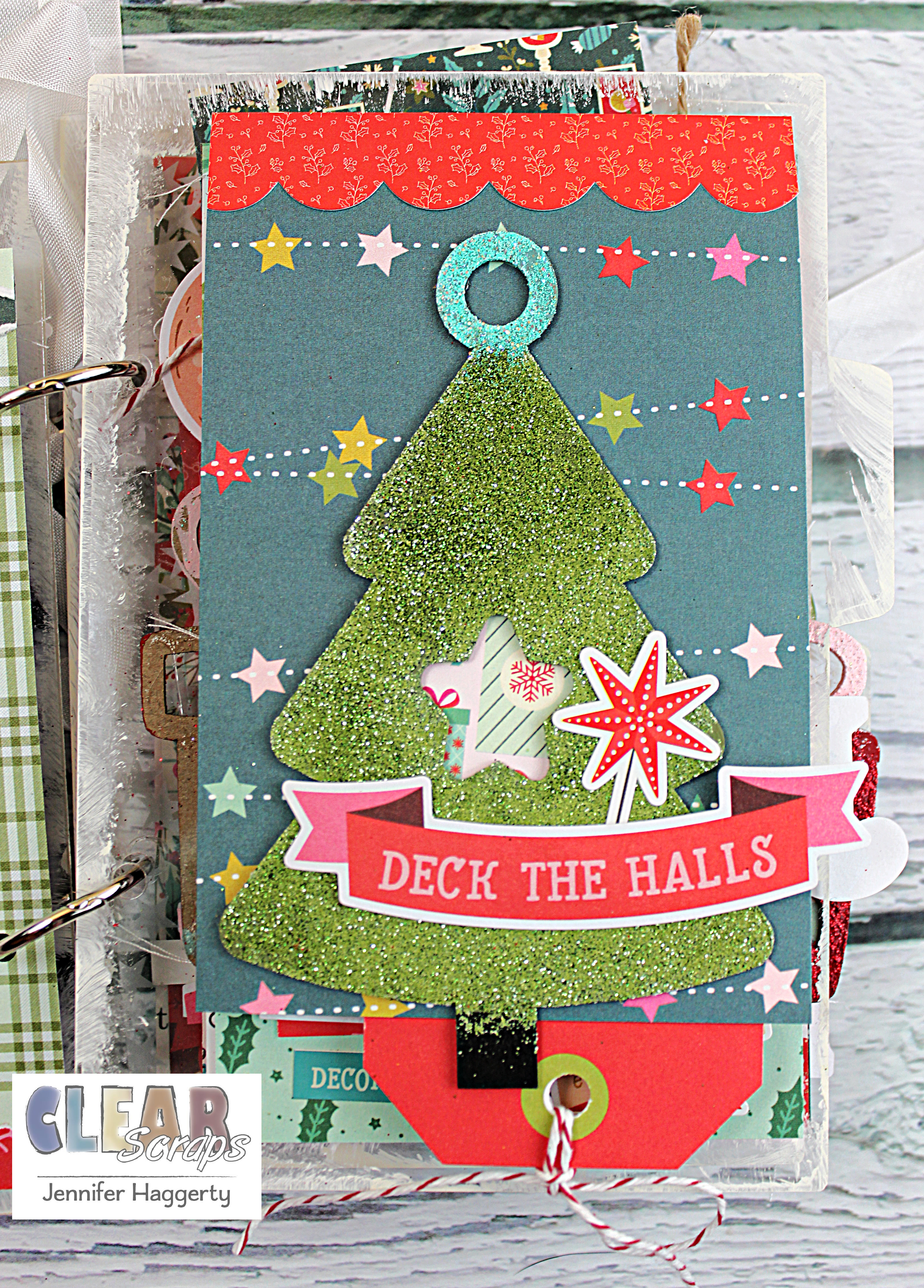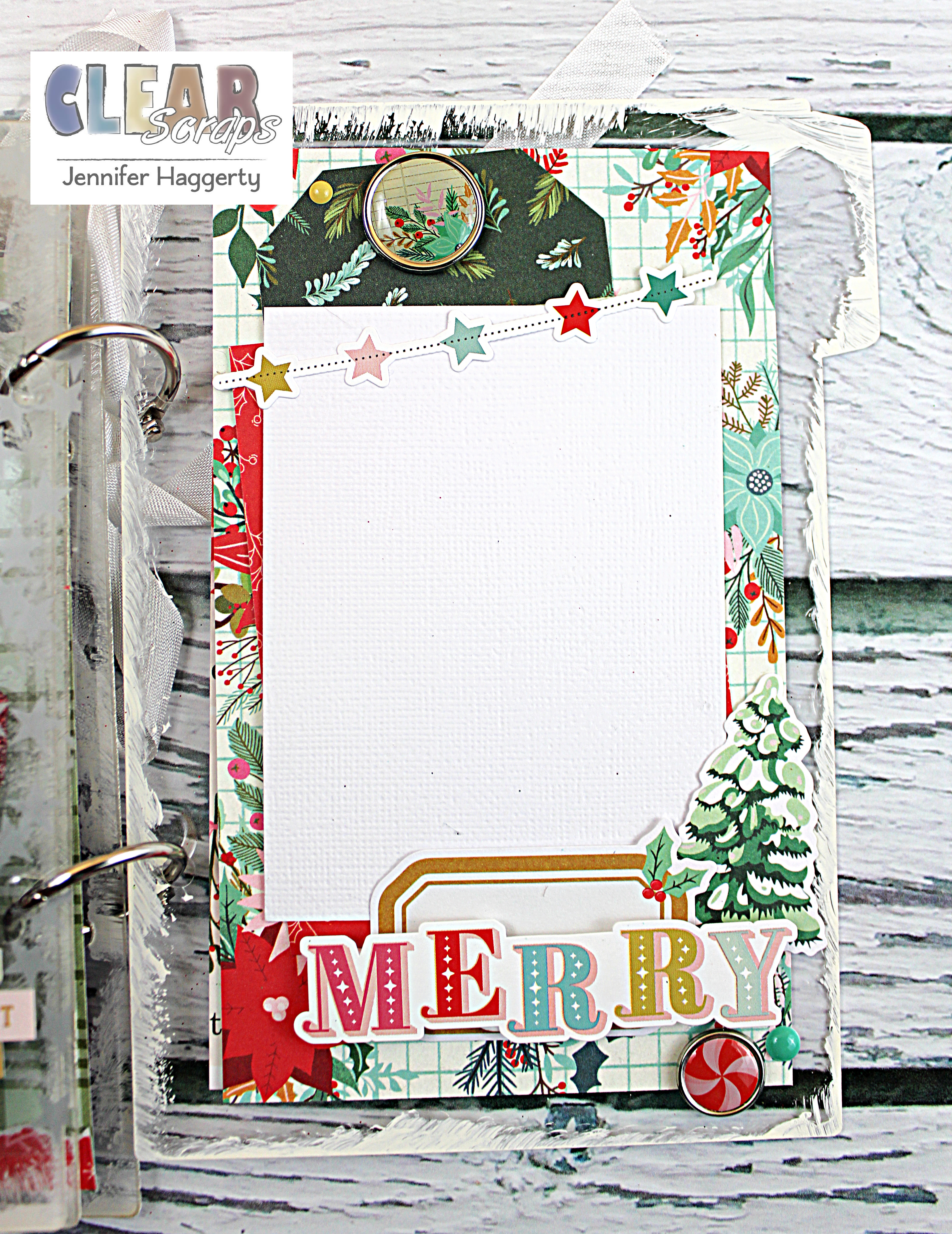 Here, I utilized one of the 4×6 cards from the collection I used as an extra page in my book. I spruced up the tree with coordinating enamel dots as well as added die cut presents at the bottom.