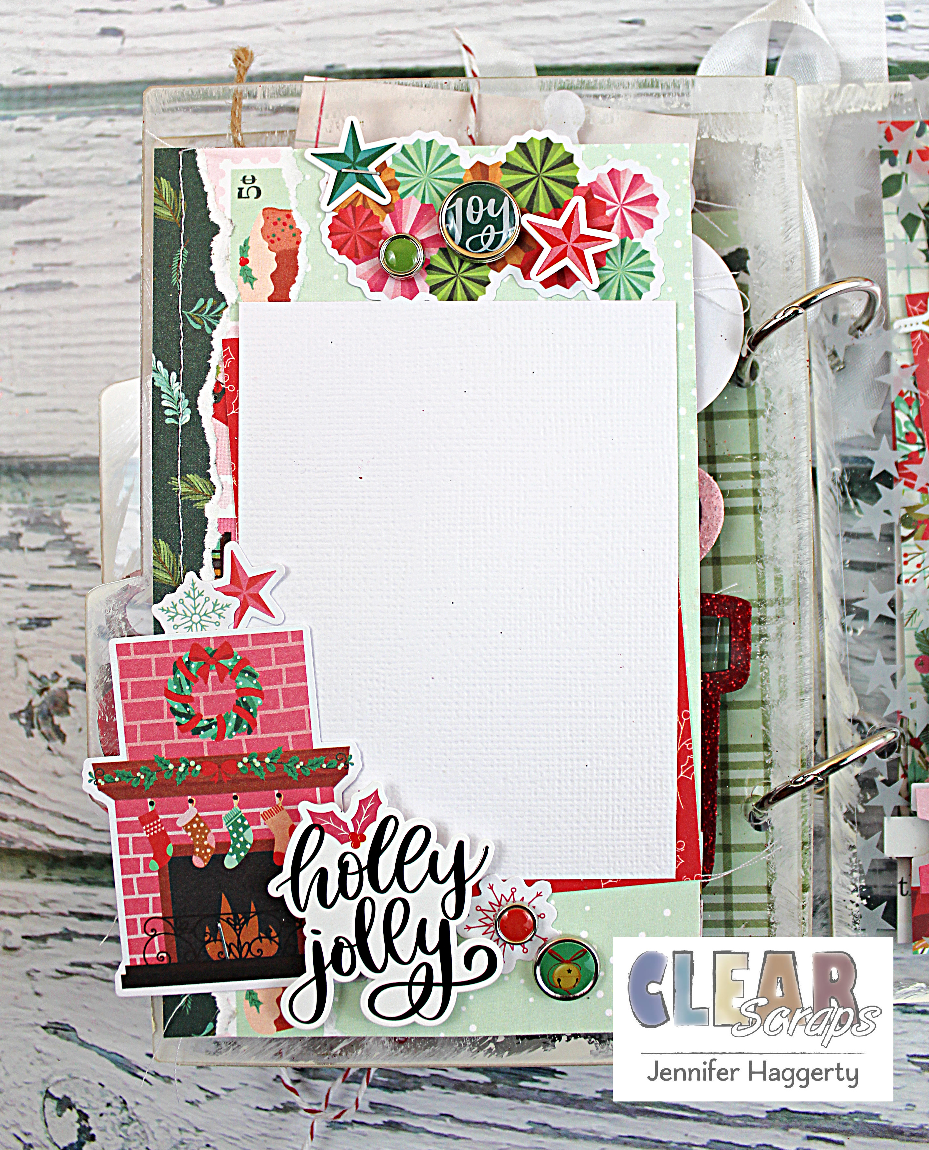 Hello and happy Friday! It's Jennifer to share a fun Christmas mini book I created using using some of the new Chipboard Embellishment Shapes! Every year, I love making a book just for Christmas memories whether it be a "December Daily" of sorts or just something to jot down favorite traditions! I began with the 5×7 Acrylic Tab Album as my base; a great classic! I lightly painted off white chalk paint around the edges of each page to give it a "snowy" effect.