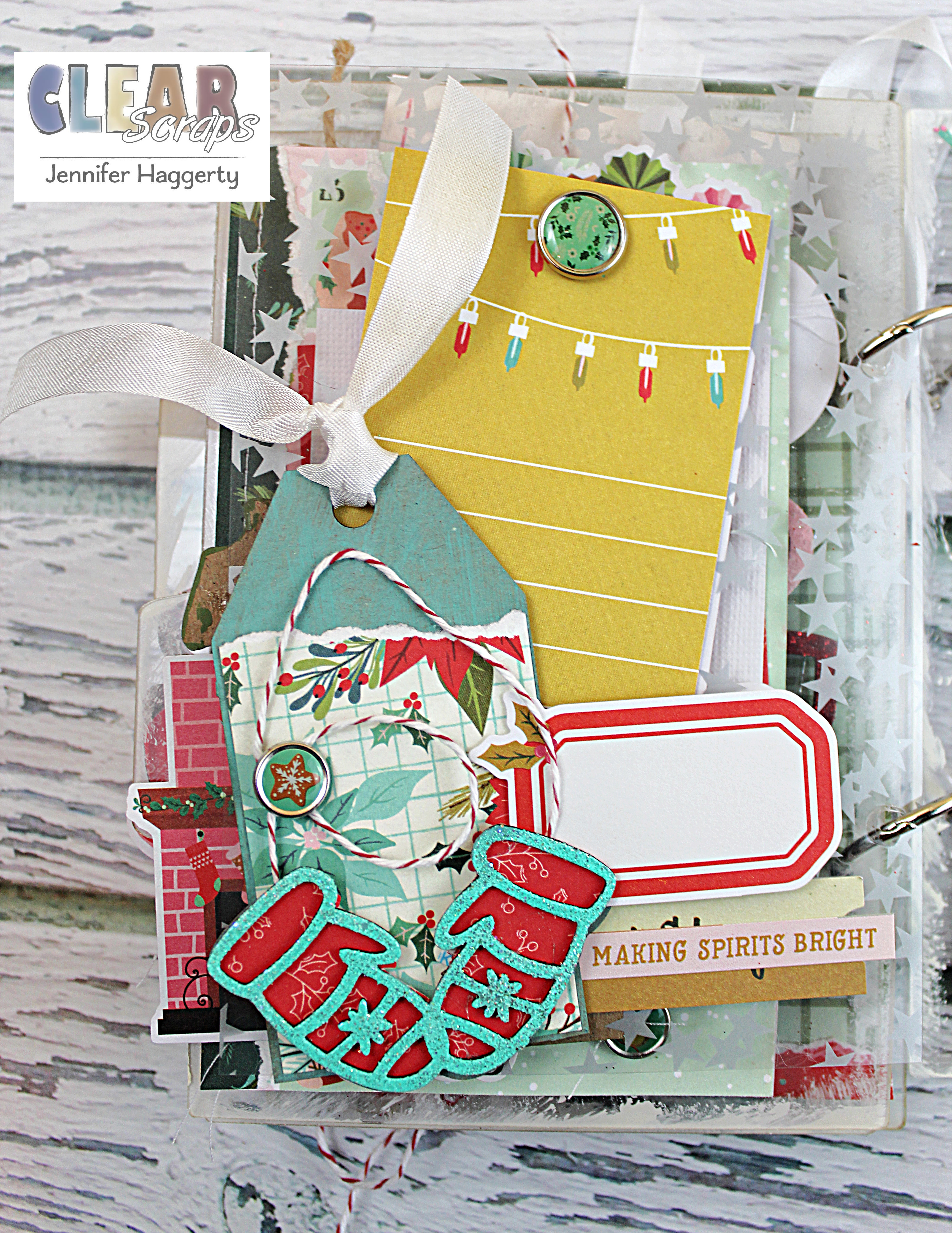 I had found some old silver star overlay paper in my stash and decided to use it as an extra page. I layered fun ephemera around the Tag Holly Chipboard Embellishment Shape as shown.