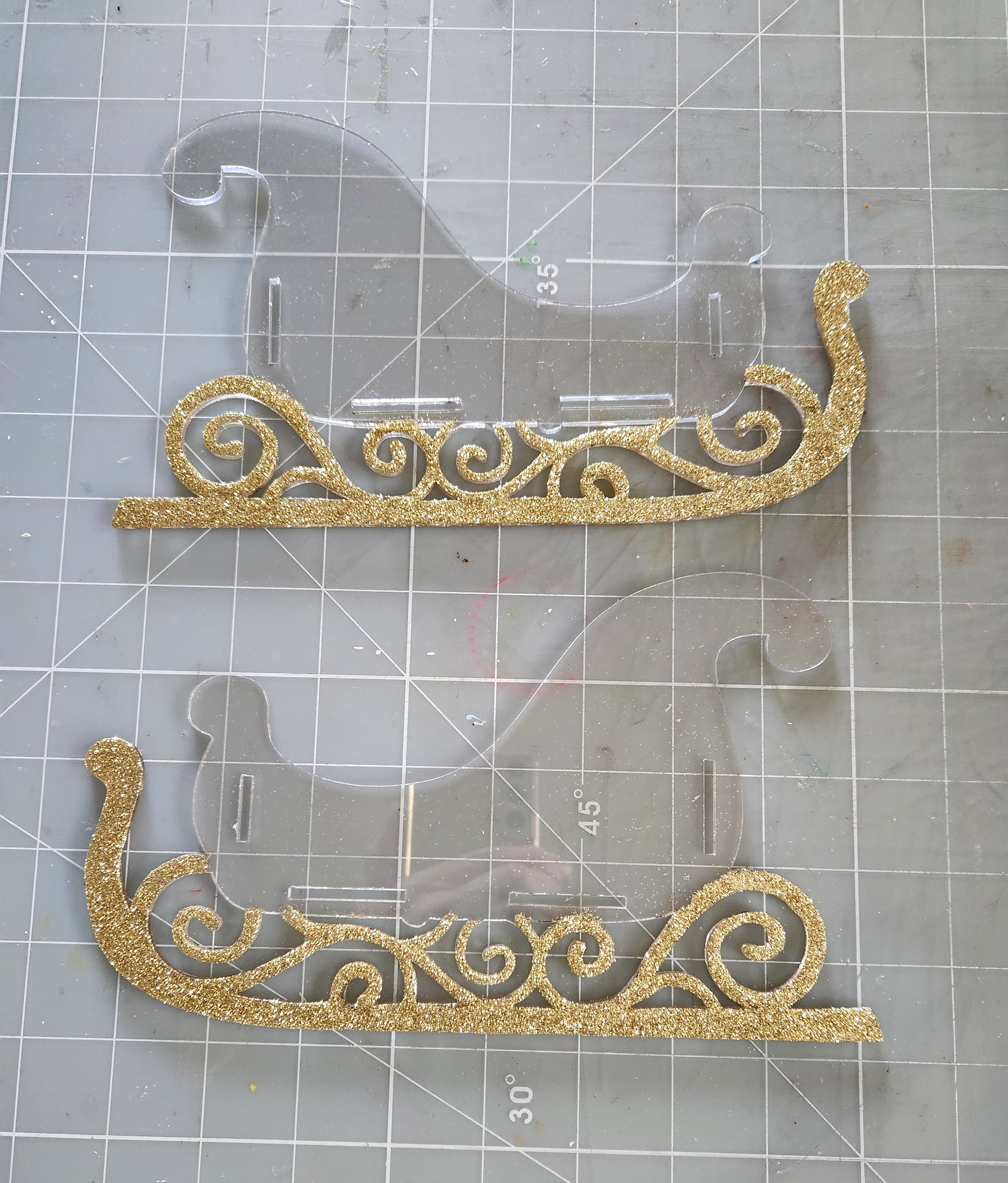I covered the bottom blades and swirls area with some tacky craft glue. Then sprinkled over top some Martha Stewart Florentine gold glitter. Set aside your pieces to dry throughly before proceeding to the next step.