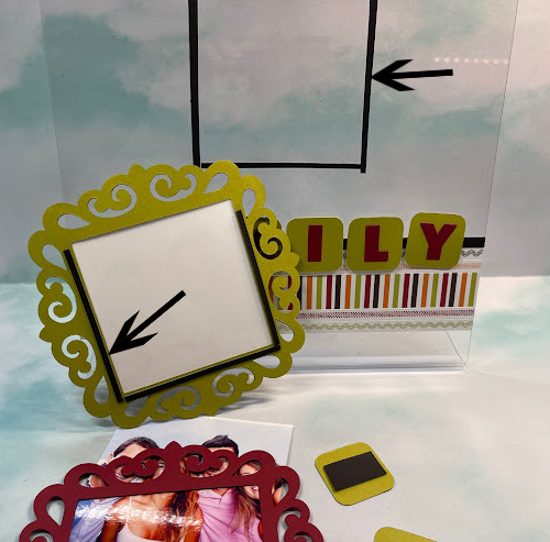 I used a thin magnetic stripe on the back of the frame (shown by the arrow). This magnetic material can be cut easily with scissors. Then a matching piece of magnetic material was glued to the acrylic.