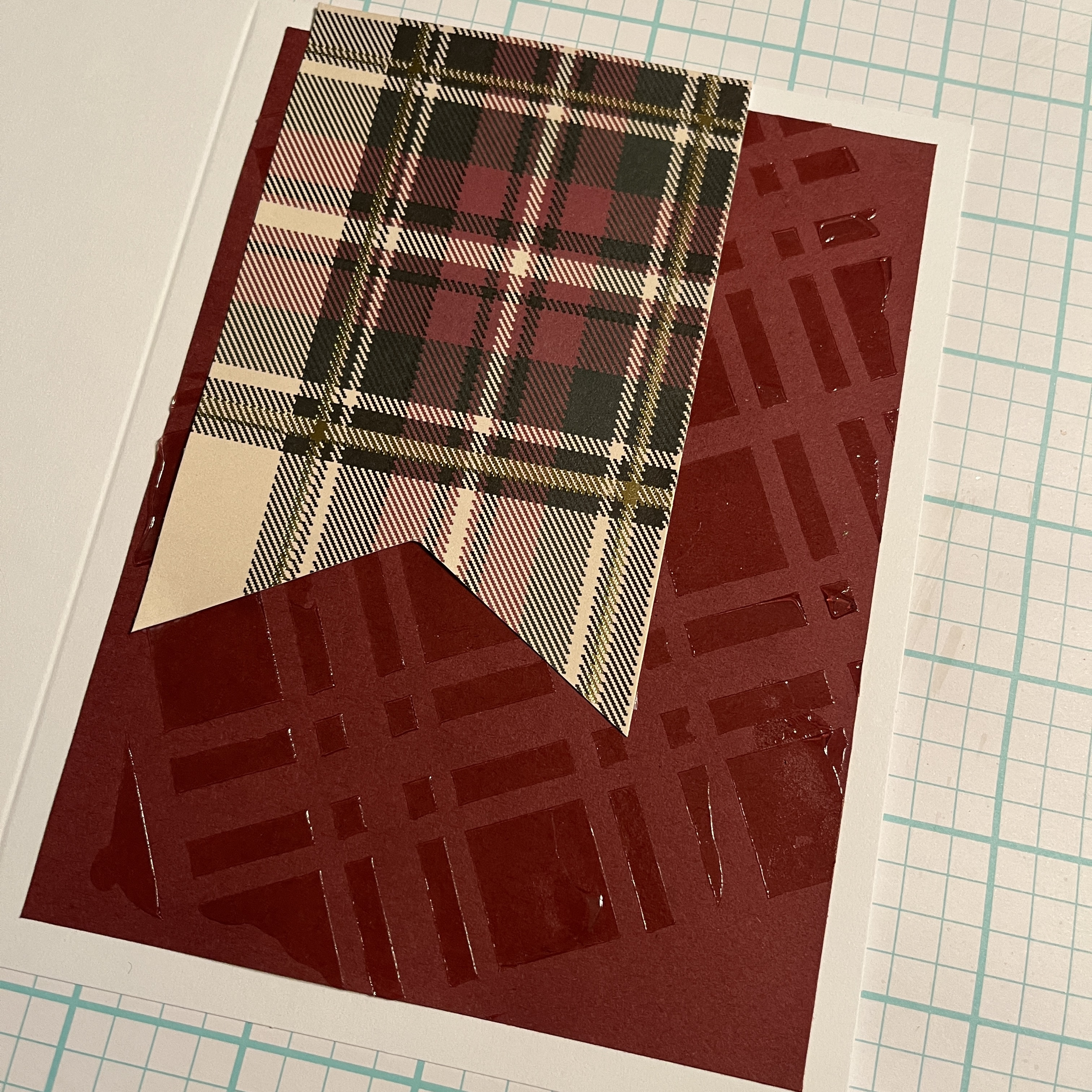 I've started by laying the 6" Plaid Stencil on a sheet of a burgundy card stock, then taking a layer of translucent paste and running it over the stencil. Slowly peel the stencil off the paper, and set aside to dry.