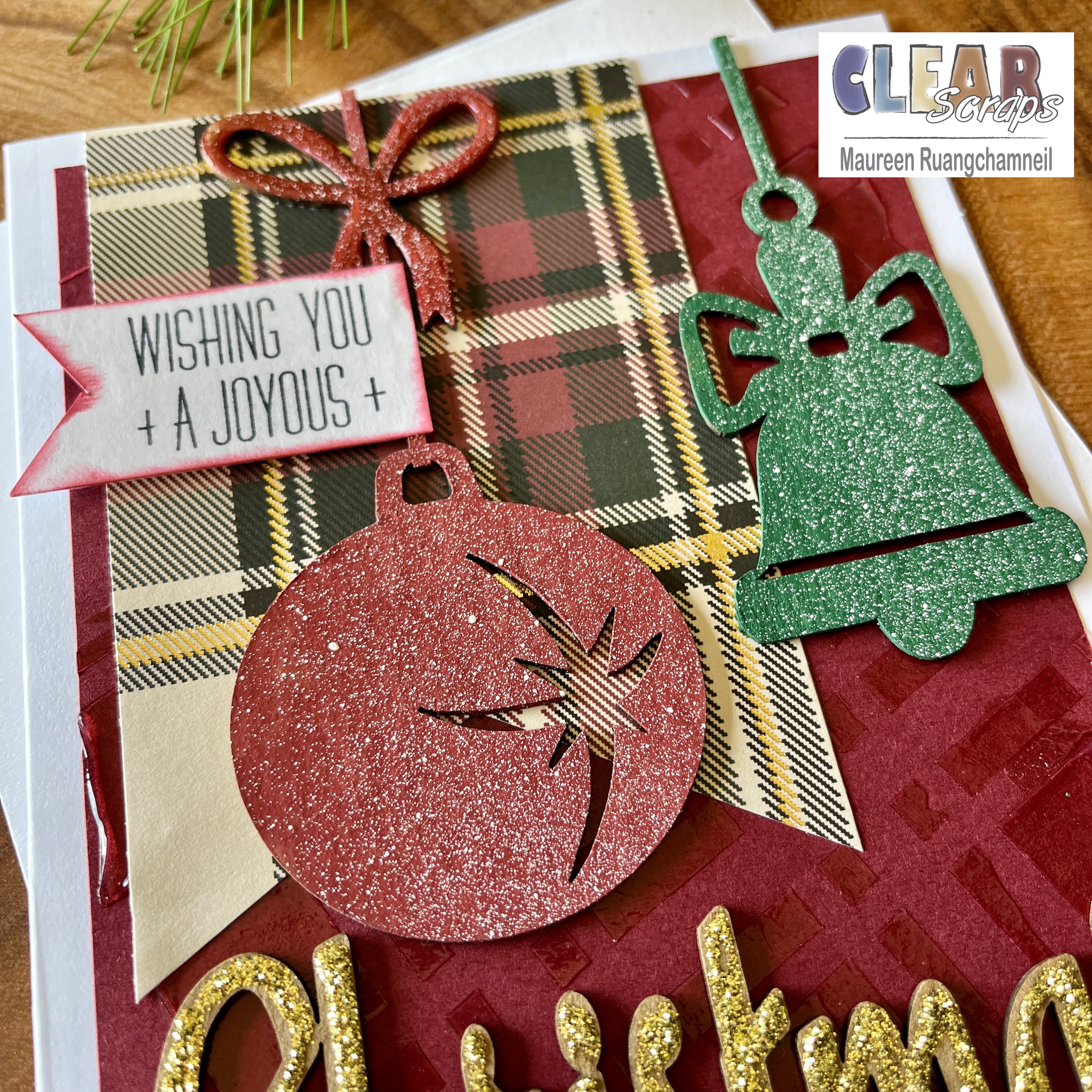 What color schemes are your favorite for Christmas? Typically I enjoy bold and vibrant colors when I craft. However, I decided to branch out a bit with this project and play around with some more antique colors. Hi, it's Maureen with you today! I am sharing a Christmas card that has a classic, vintage look to it and I'm using the Clear Scraps chipboard elements for my focal point.