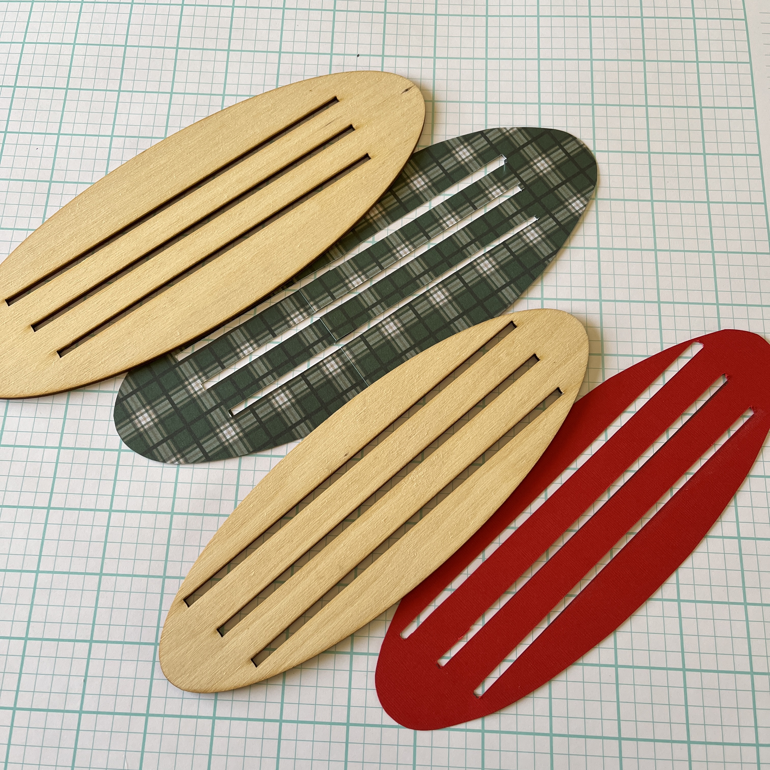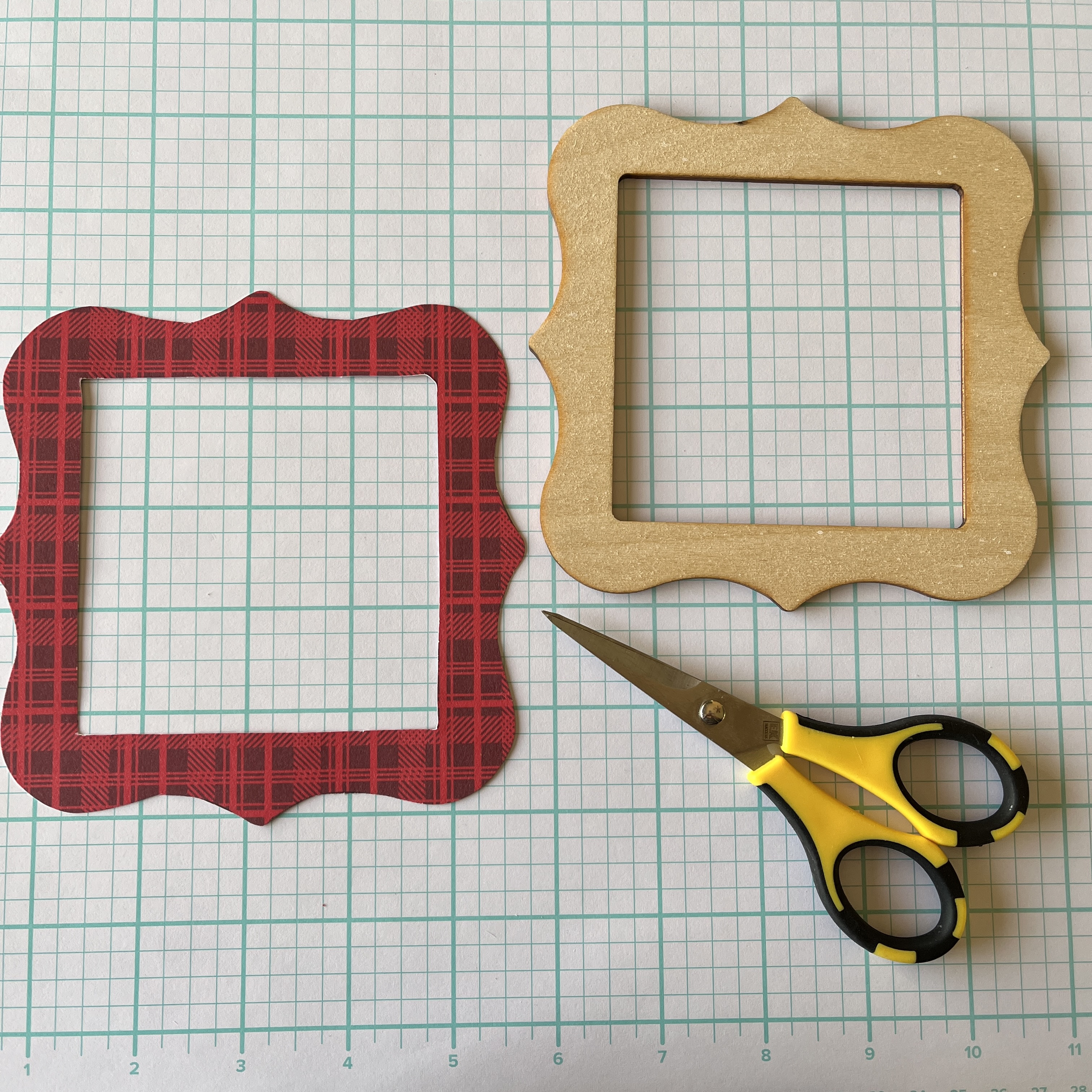Next, I traced the base of the frame in 2 different papers, one plaid and one in red. These are glued on with tacky glue and also glued together. I would also recommend using a hodge podge and filing the edges of the paper first for a longer lasting frame.