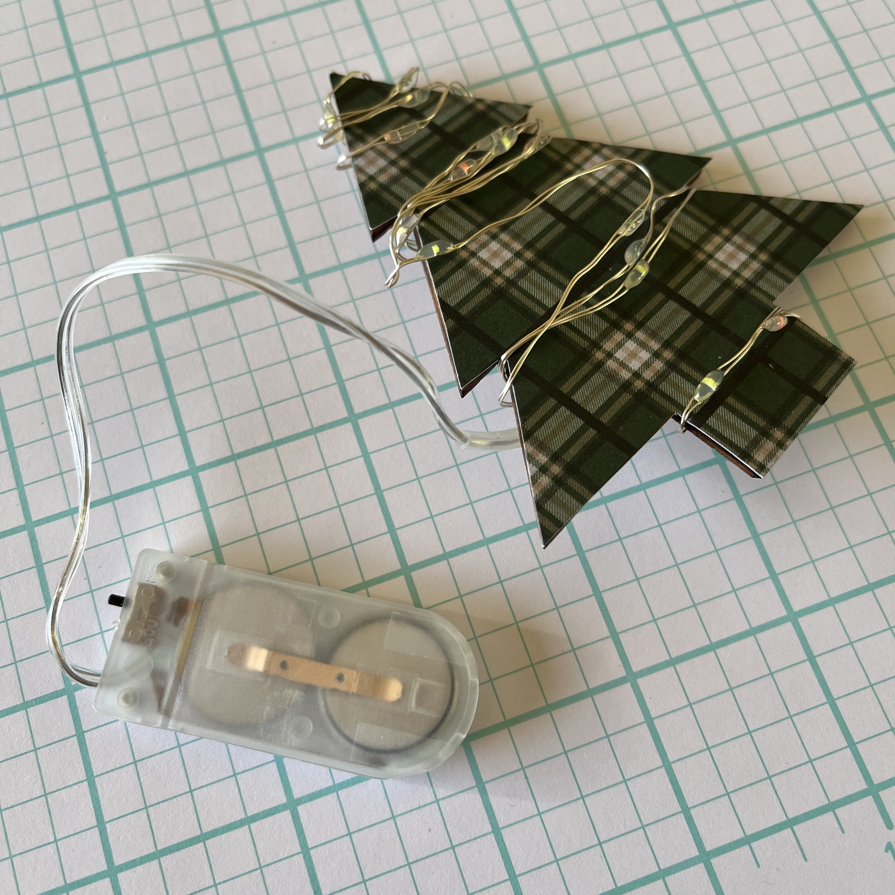 Next up, I took the Christmas tree and added the same plaid paper as the base to the front. In addition, I'm adding some fun mini lights by wrapping it around the tree and tucking the on/off switch behind the frame. This is SUPER fun! This light set is from Tim Holtz, but you can find these online as well.