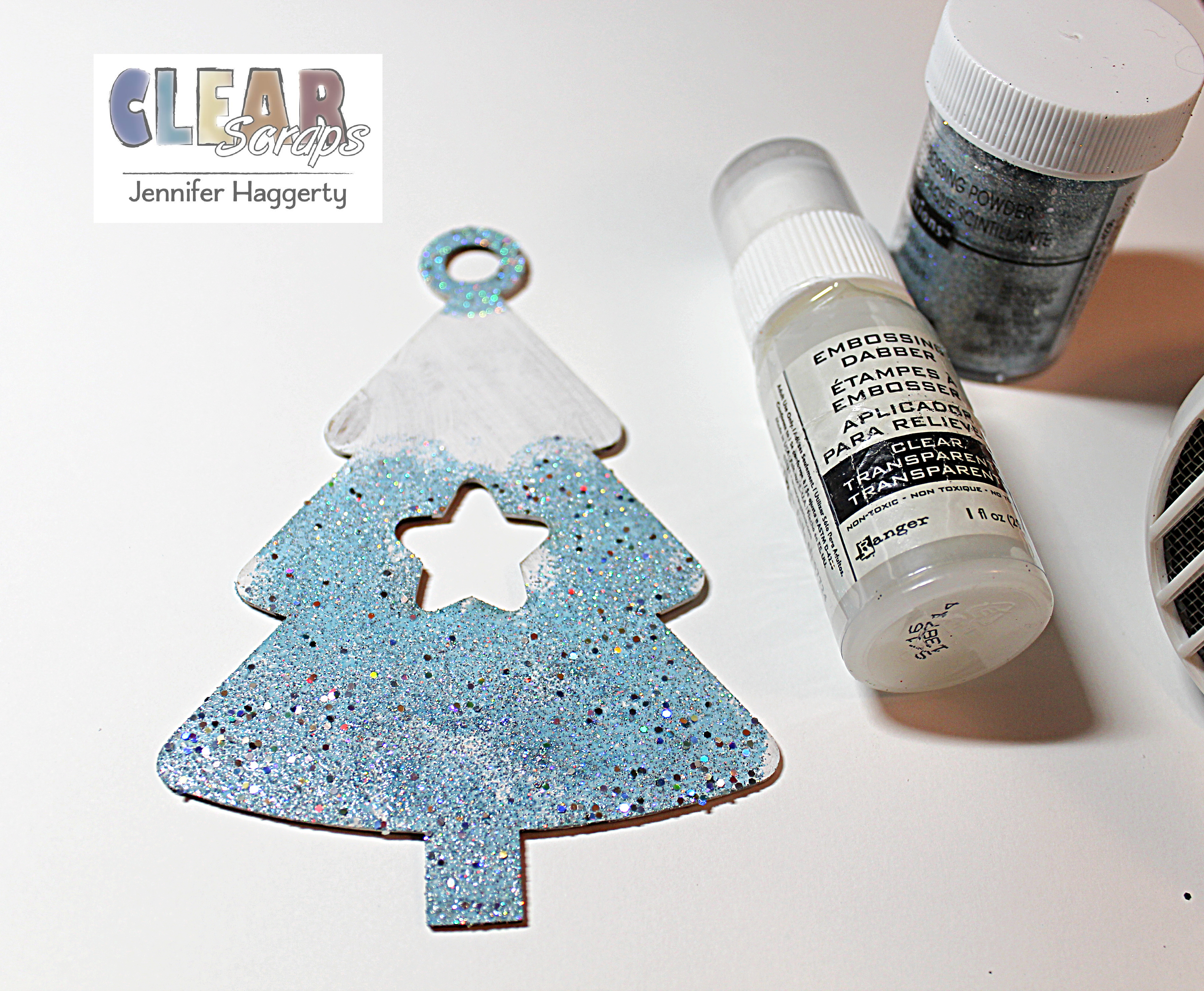 Next, I heat set a pretty light glitter blue embossing powder to the top and bottom portions of the tree as shown. Then using my Beacon Adhesive, I added strips of paper in the "bare' portion and cut away any excess with scissors.