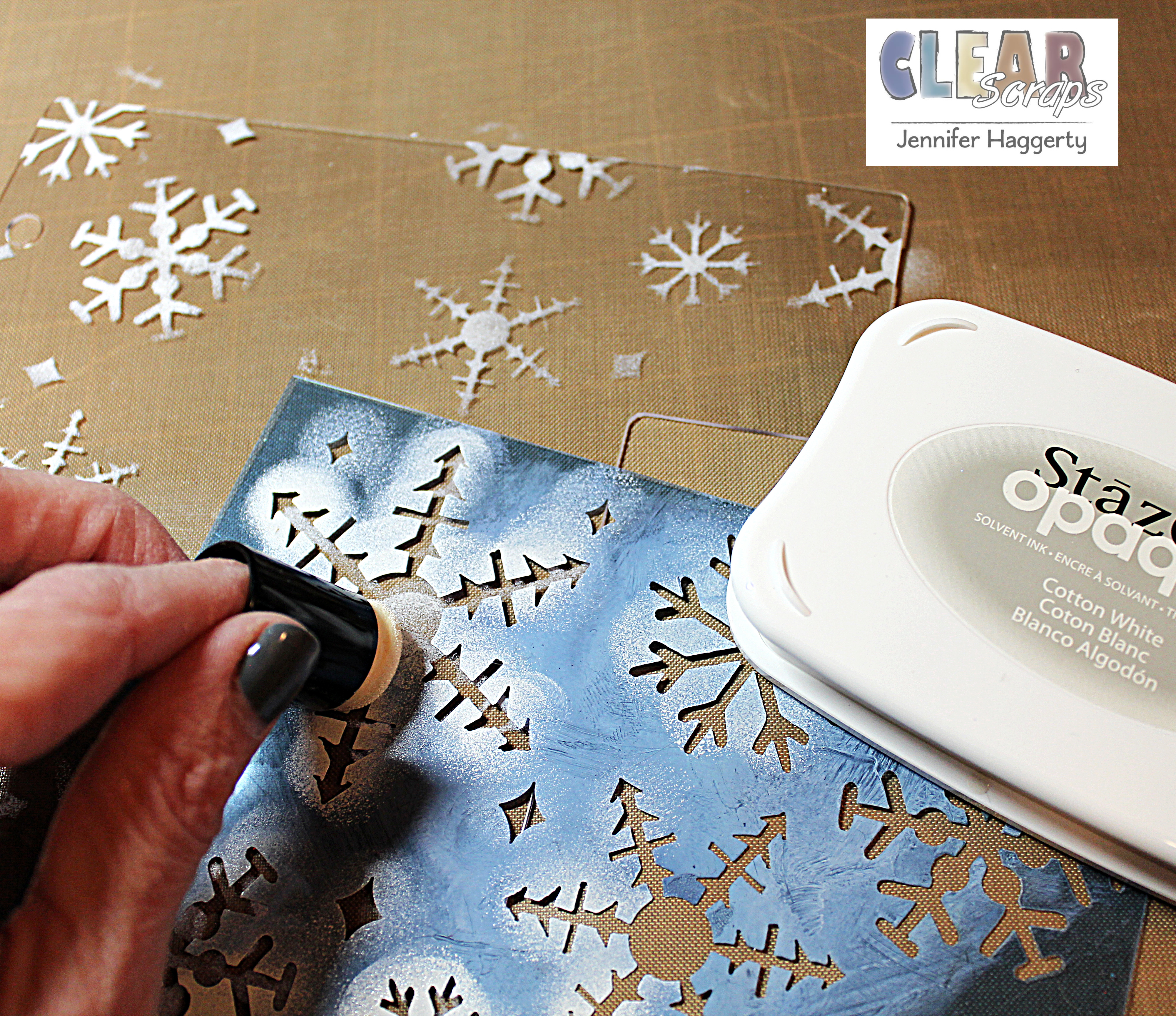 I set aside my Tree to work on the front acrylic cover. Using the 6 Inch Ice Crystals Snowflake Mascil and StazOn Opaque, I lightly daubed the ink onto my acrylic. This is a great technique to use with any of the StazOn colors and Clear Scraps Mascils/Stencils!