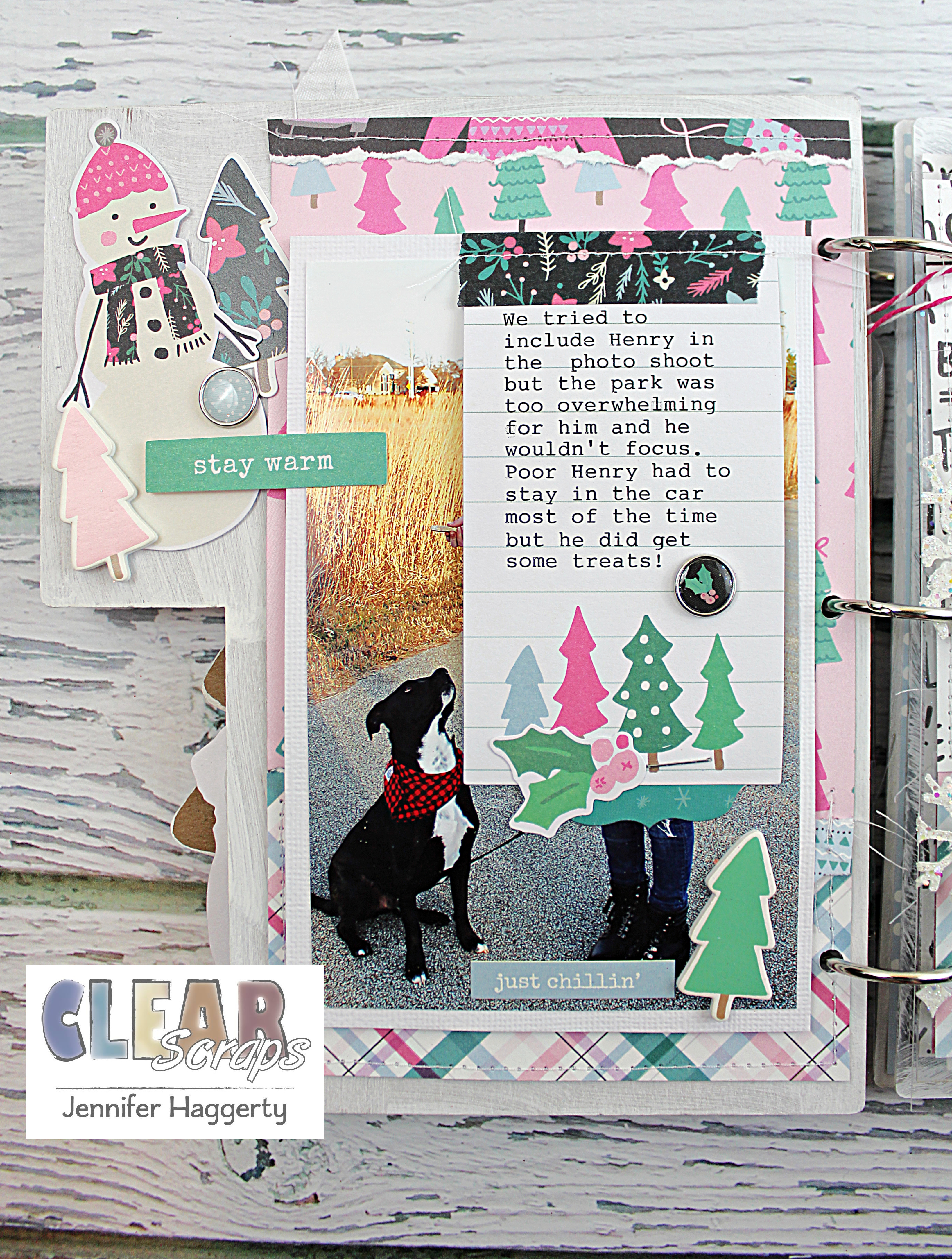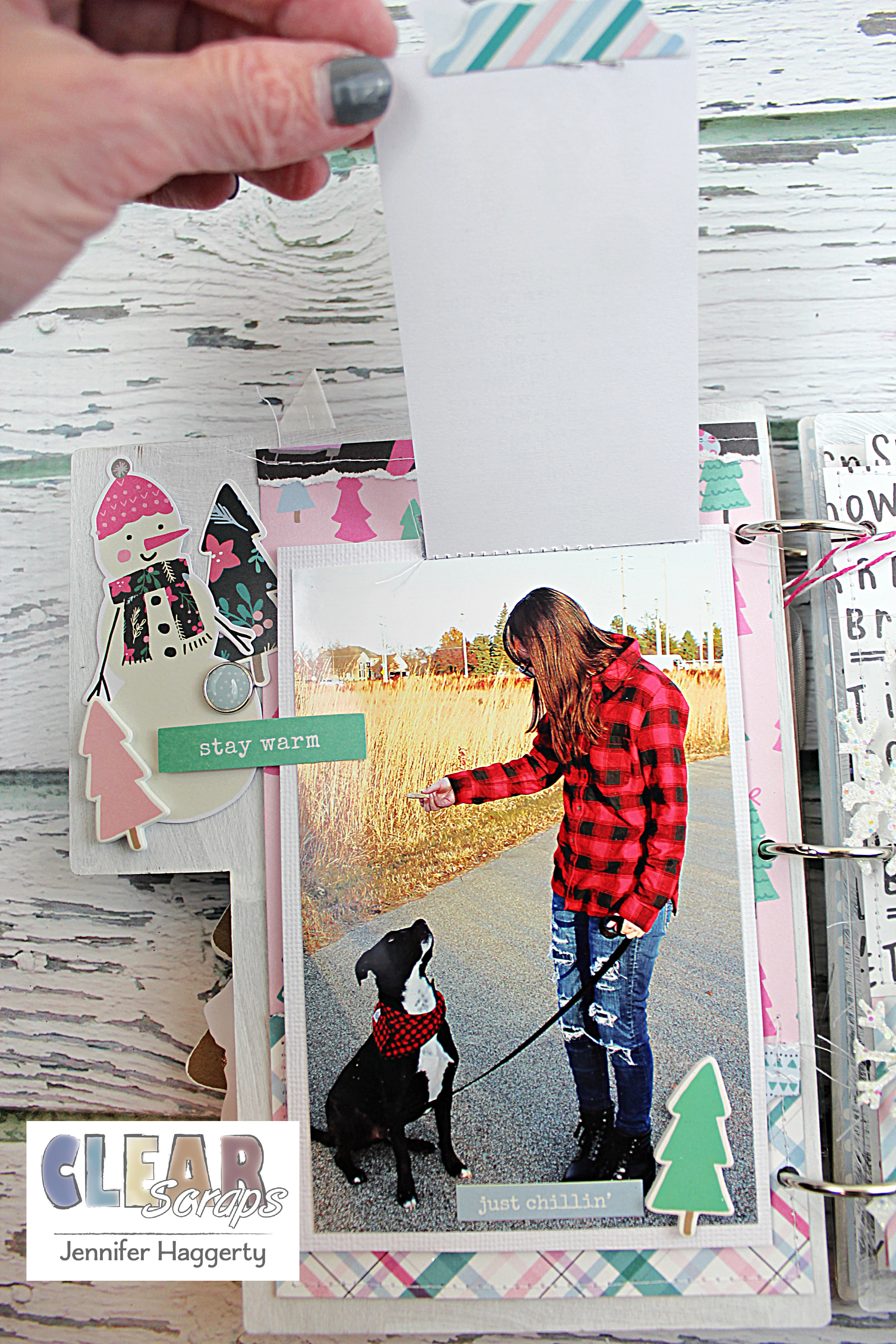 For the last acrylic page, I added some white paint along the edges to give it a "snowy" feel. I then again used my Scor-Pal to create a flap to add extra photos as well as make a fun page with tags and embellishments!