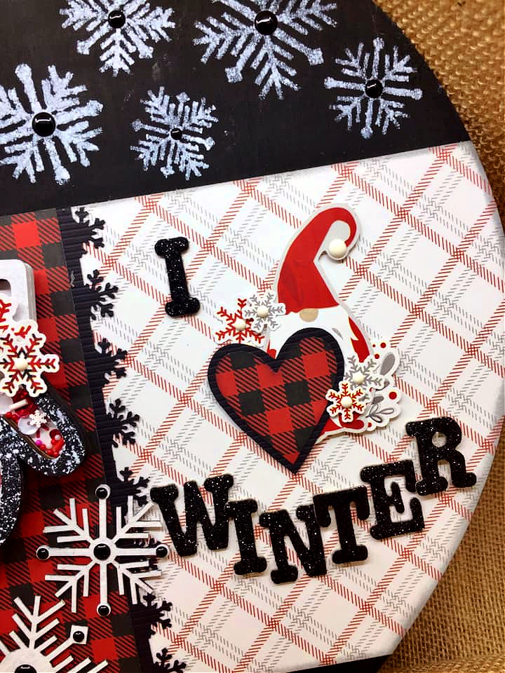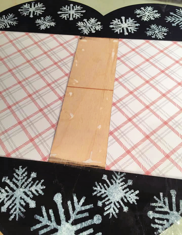 These pieces are so large,pieces are SO large–a 12×12 paper will not cover them. So I started by painting the top and bottom with black acrylic paint, then I used the Clear Scraps 6" Nordic Snowflakes Stencil to add snowflakes with white paint. Then I cut 2 pieces of plaid background paper to cover the center.