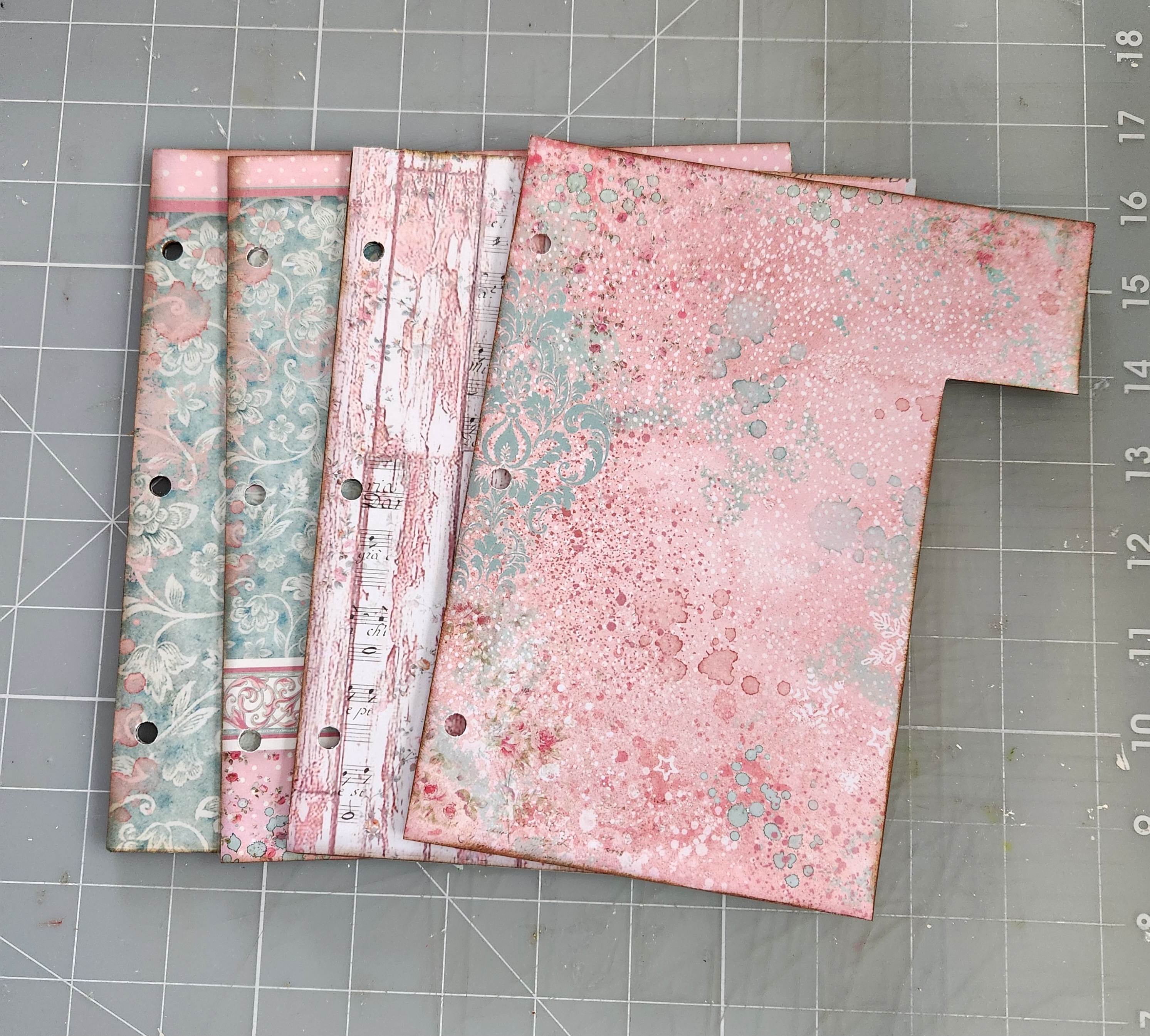 To begin our project, I chose several coordinating papers to cover all the pages in this album. I cut my papers to measure 8 x 6 &1/2 inches. I'll be inking all my papers using Distress Ink Gathered Twigs.