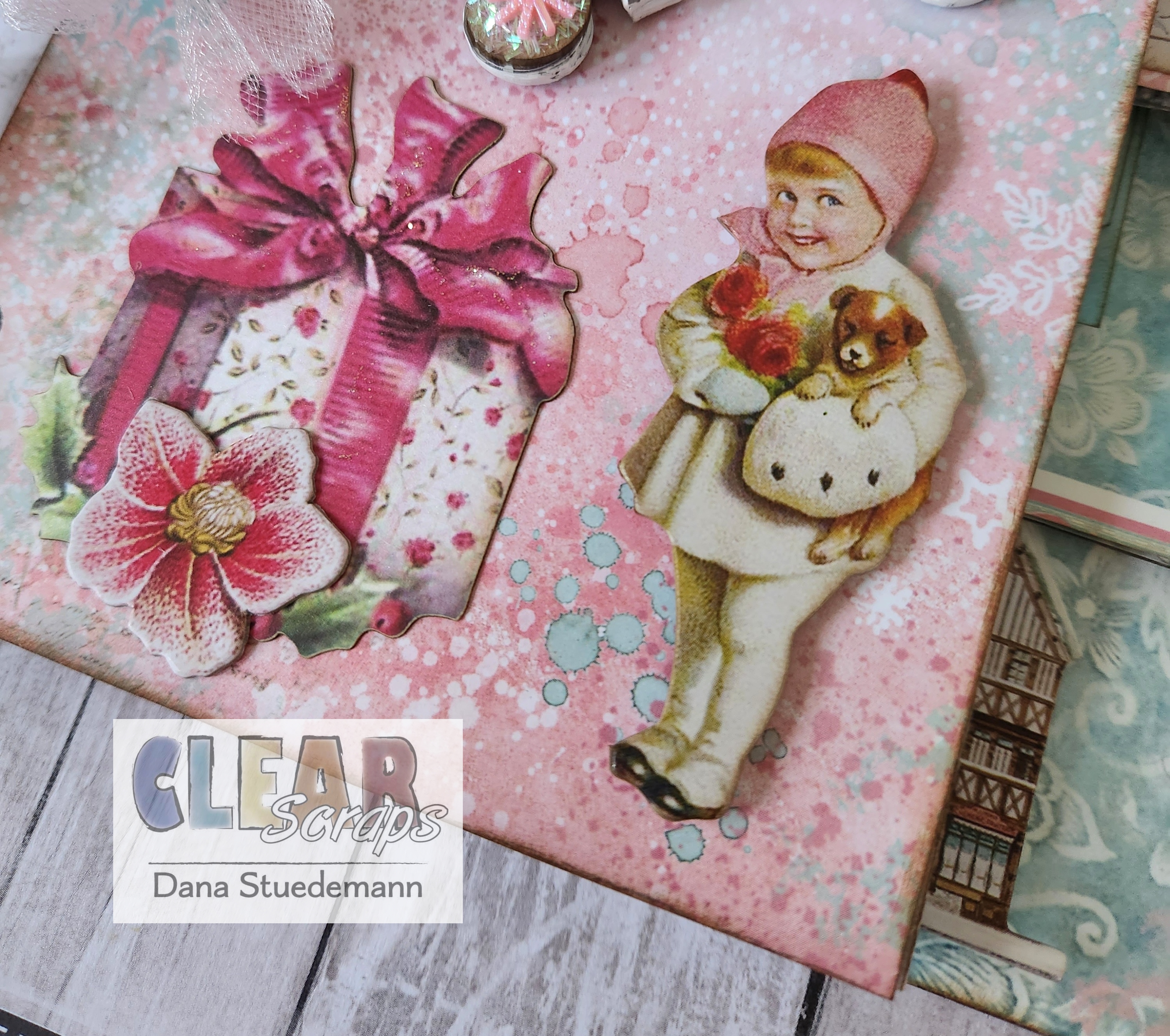Other Supplies Used: paper trimmer, foam dots, foam tape, shaker filler, Martha Stewart Pink Blush and White confetti, paper punch, Distress Ink Gathered Twigs, Stamperia Sweet Winter paper pads 8×8 and 12×12, diecut stickers and matching Ephemera, Starburst gems, blue crystal gem, Snowflake charm, Beacon glue.