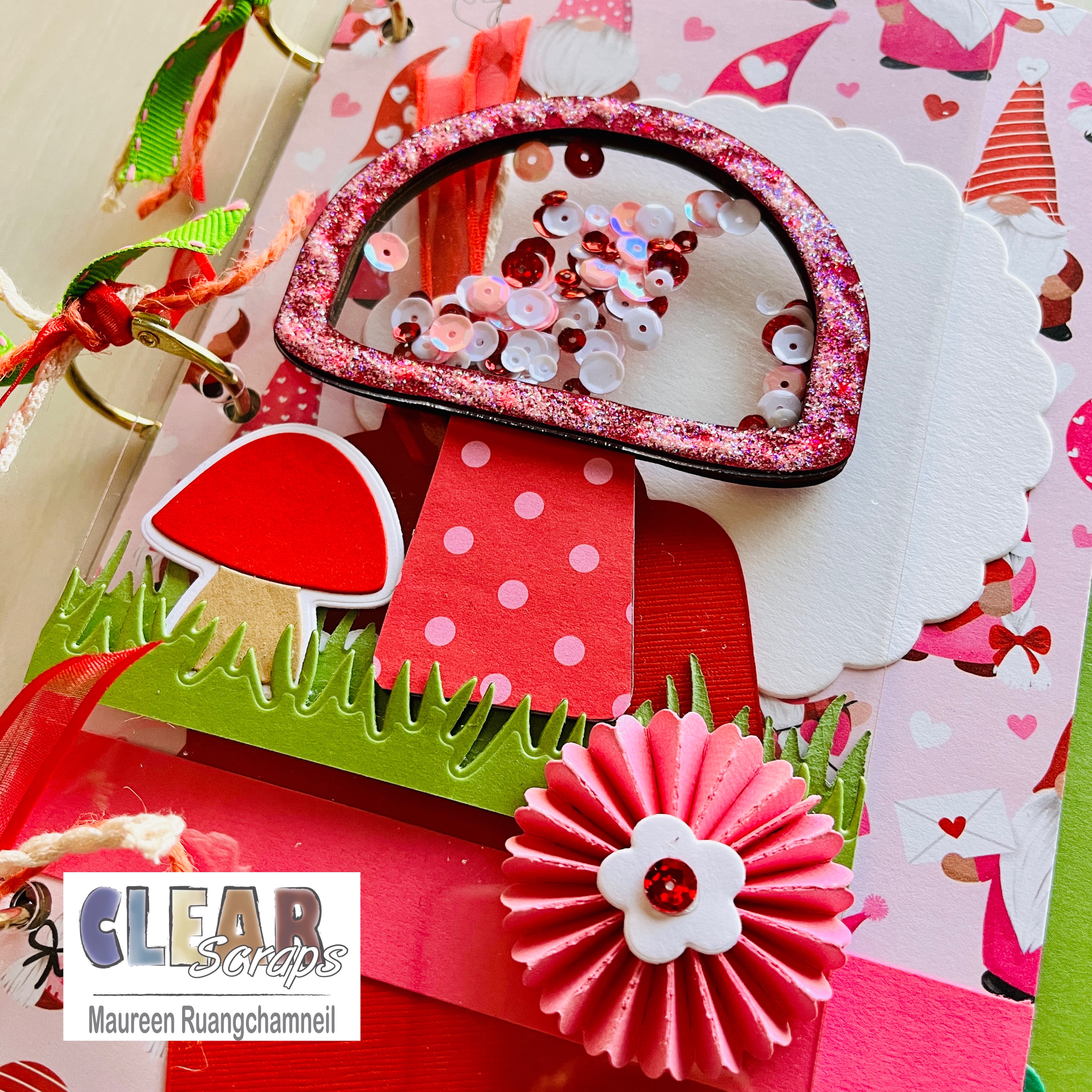 For this project, I just wanted to let loose and choose colors and layouts as I went. I started with the first page and wanted to challenge myself to make both sides of the acrylic pages viewable. So, for this, I decided to add a shaker. I've chosen the Mushroom Mini Shaker, colored 2 sides in pink and cut off the stem. I reapply one stem to the front, covered in patterned paper. This is so colors can be seen on both sides.