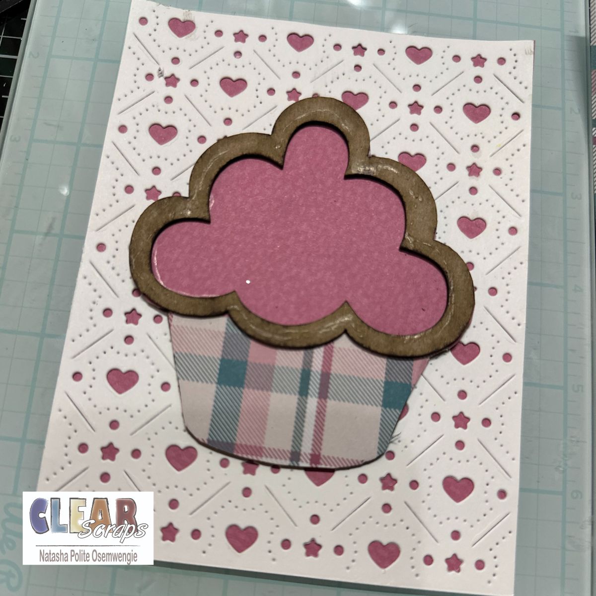 I then adhere the cupcake onto my card base. I chose to use a faux stitched background panel layered on solid cardstock for my card panel. I then centered my cupcake on the panel and adhere.