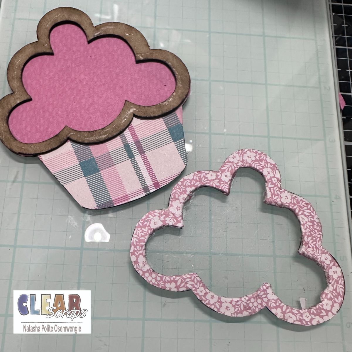 Adhere patterned paper to the back layer of the cupcake. I chose to use two different pages, so the top and bottom of the cupcake would differ. Note that when adding on the paper, be sure to fussy cut around the edges. The top of the cupcake does not have to be perfect on the back layer since the chipboard layers will cover the edges.