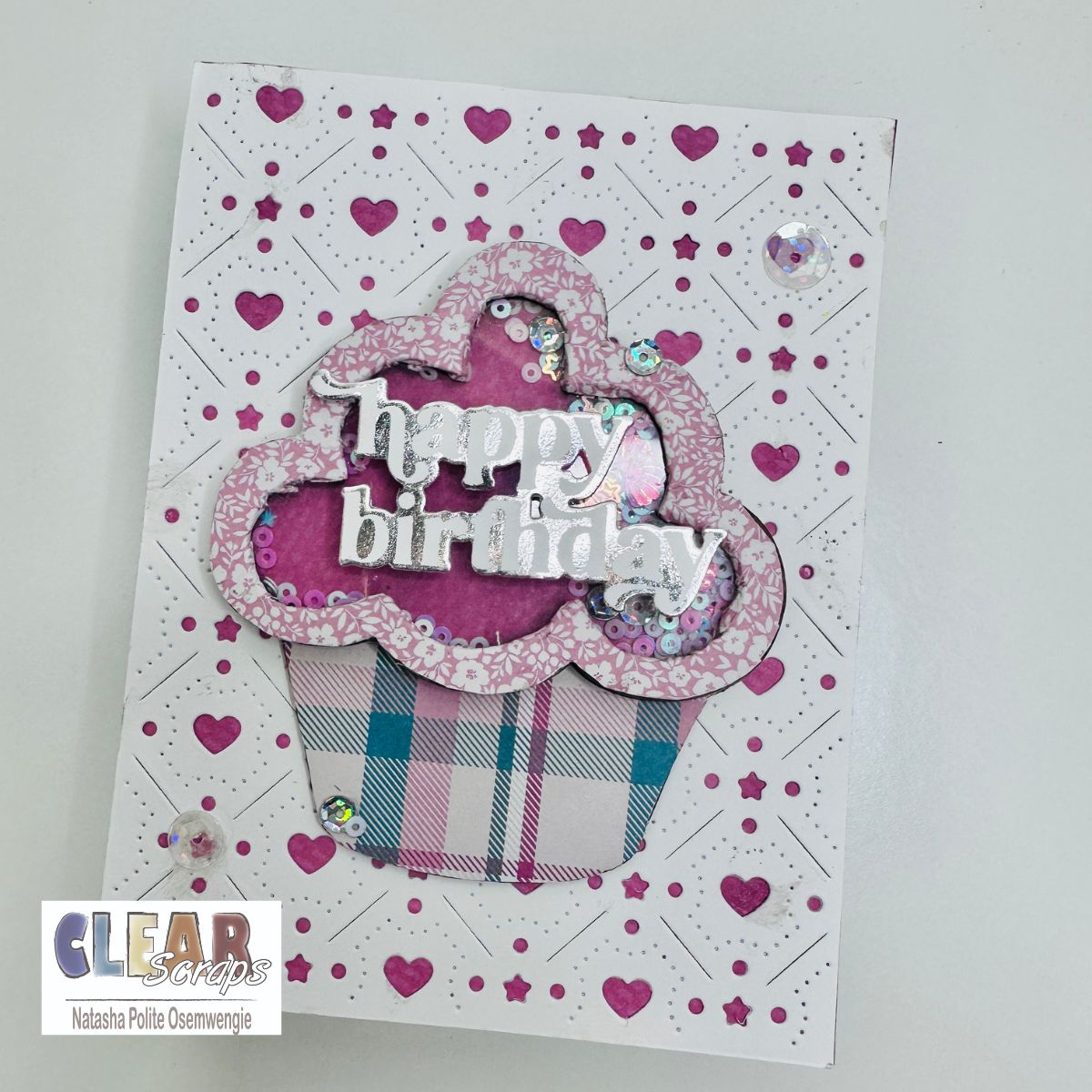 With that dry and in place, I add on the clear layer — removing the protective film, and add my top cupcake layer. From there I simply add a sentiment and embellish with sequins from the shaker mix. Now you have a quick and simple birthday shaker card.