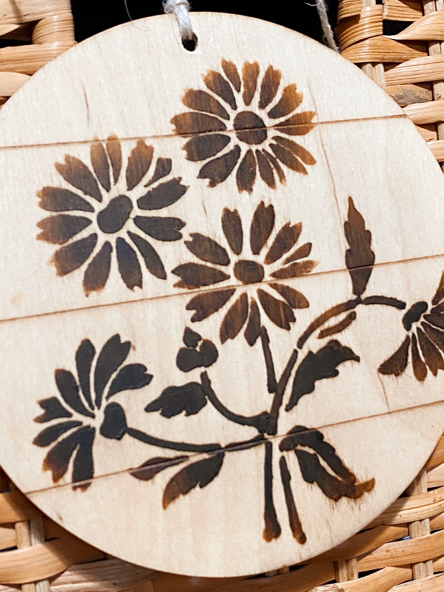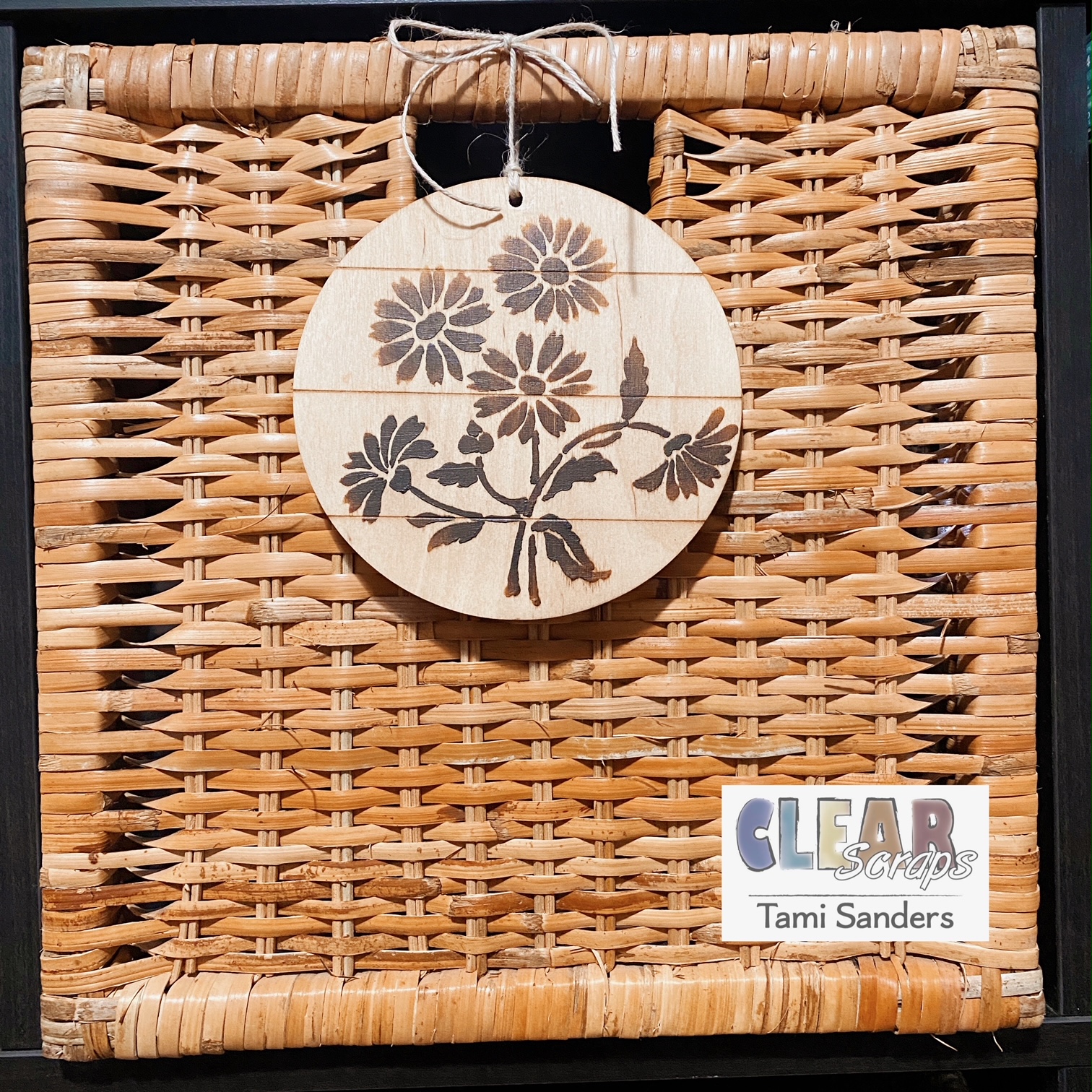 I used the Small Shiplap Circle and Bouquet of Daisies 6 X 6 stencil on this embellishment for a basket.