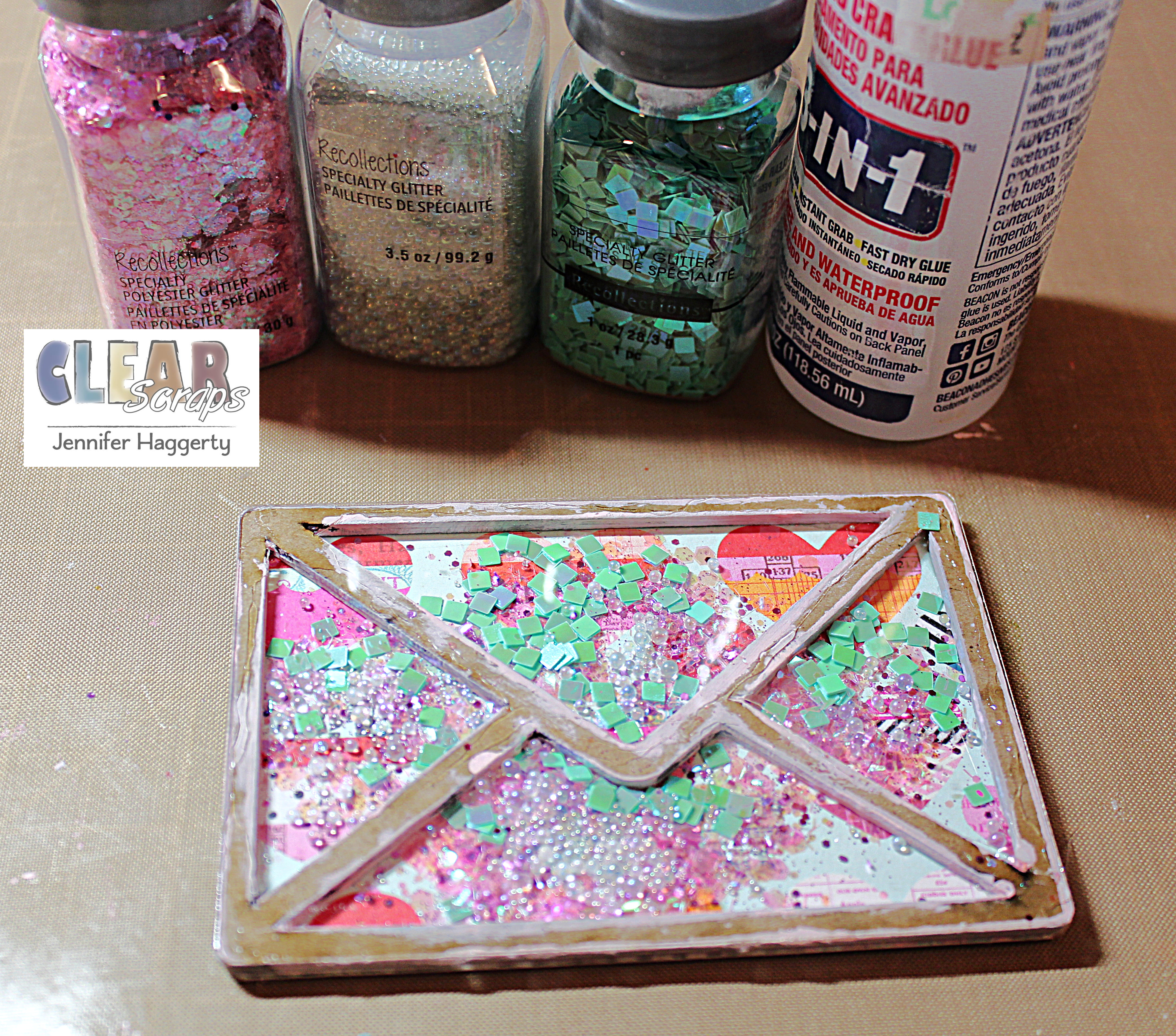 I adhered my two middle chipboard frames and then added my chunky glitter. I chose bright colors that matched my patterned paper. Next I adhered my acrylic overlay.