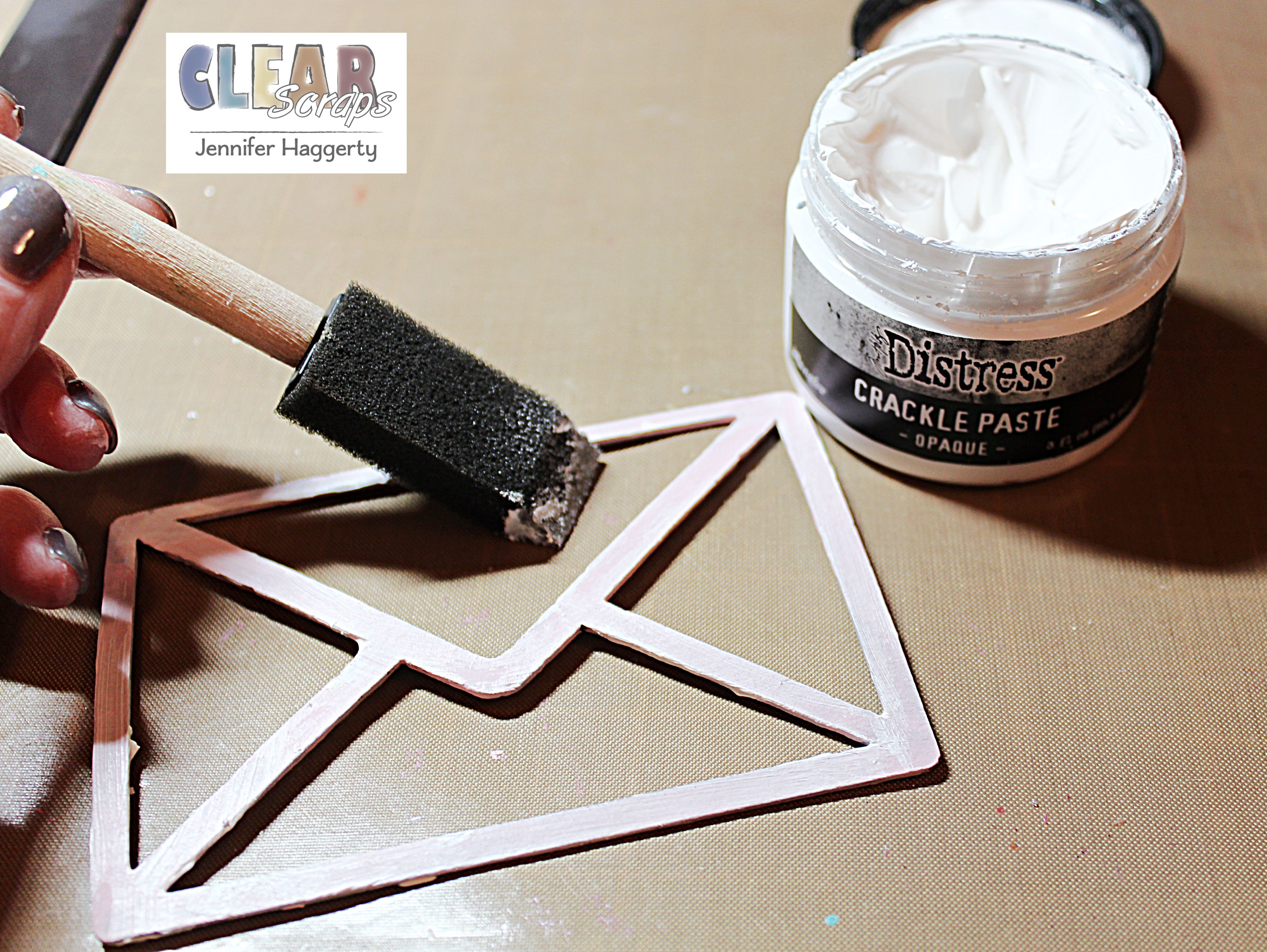 Before adhering my top chipboard frame, I applied a light coat of crackle paste to the paint to give it some dimension. I helped drying time by using my heat tool. Last, I was ready to adhere my top chipboard frame. My entire shaker was affixed to my card using the Beacon Adhesive.