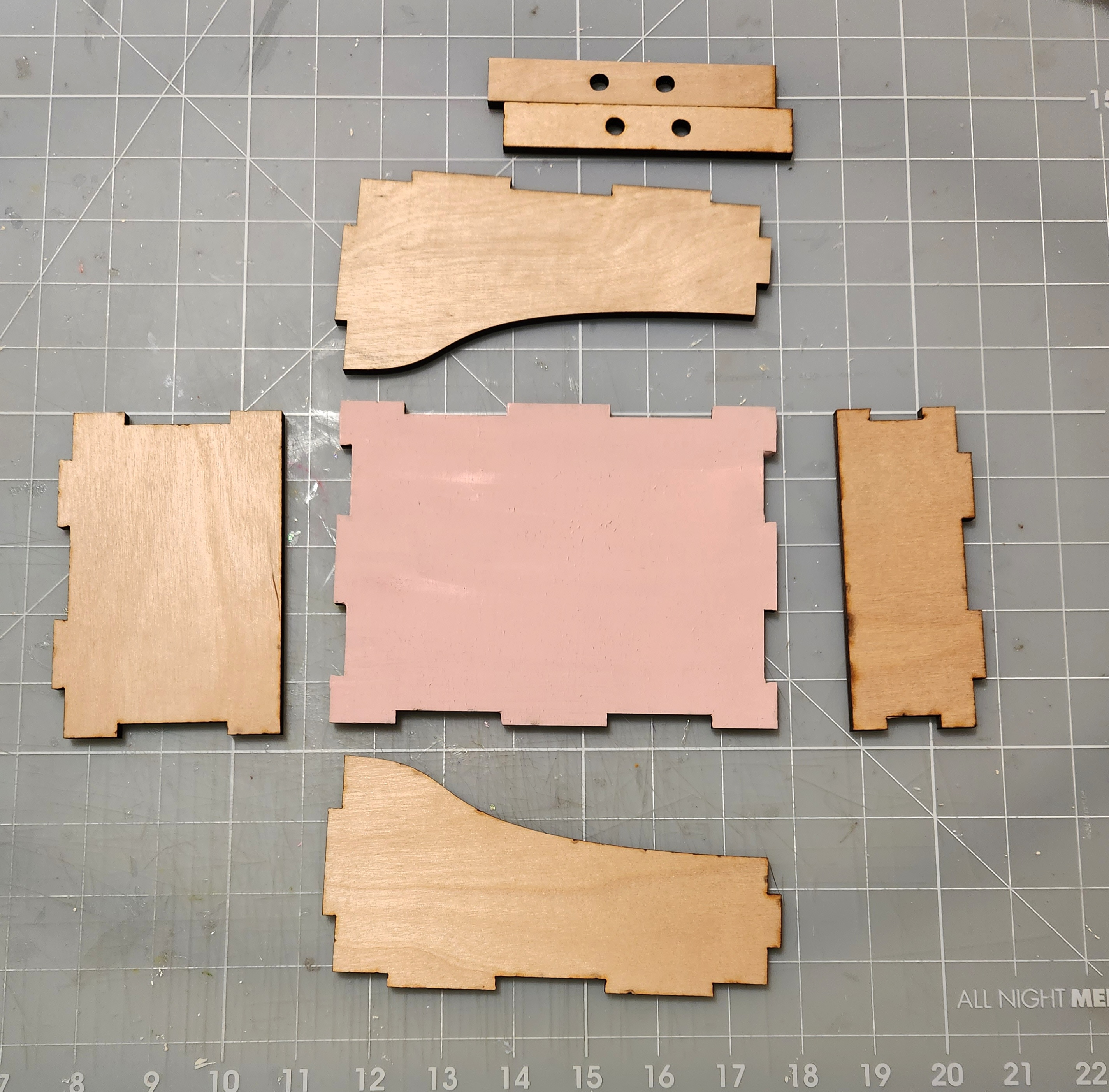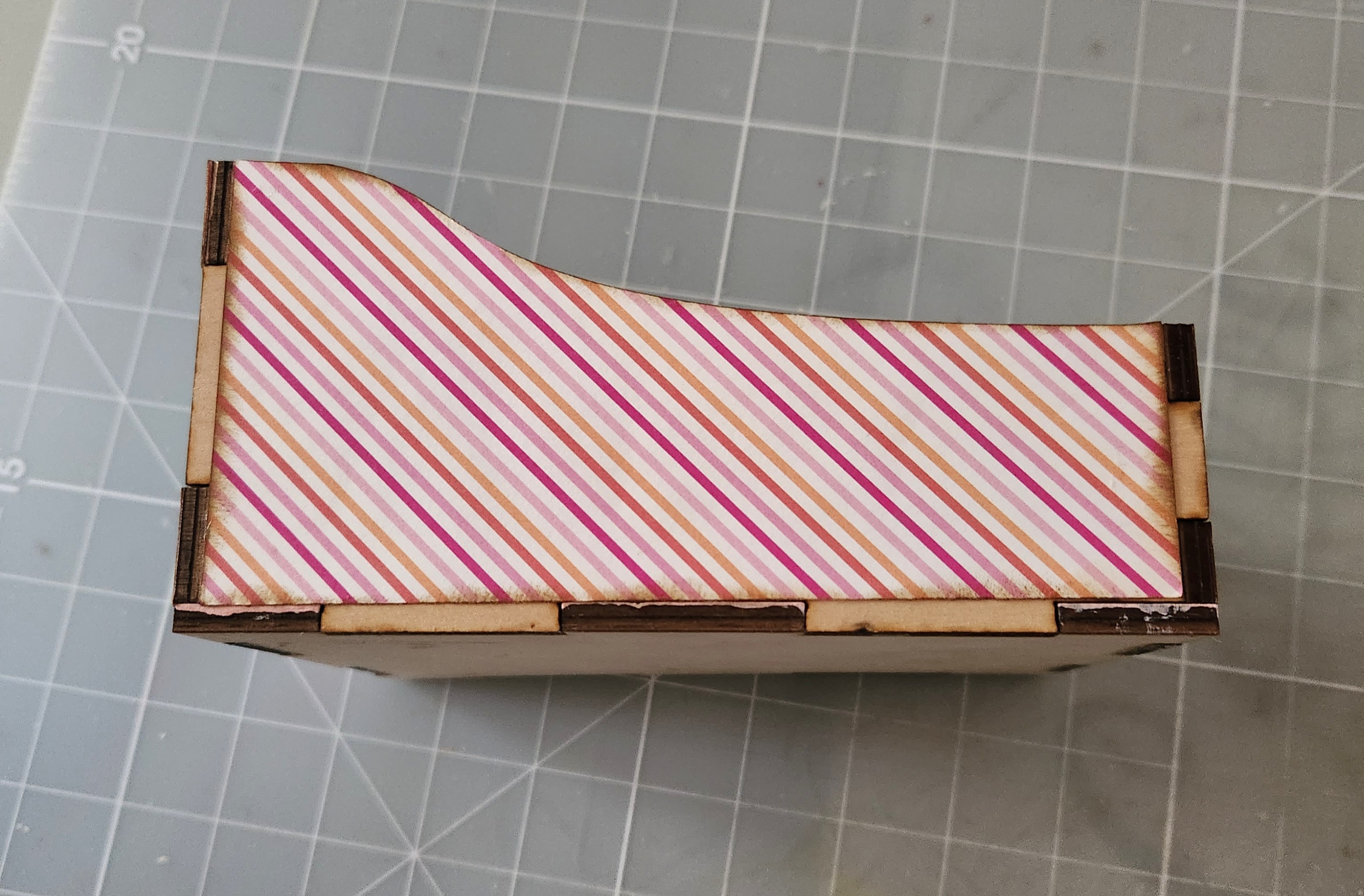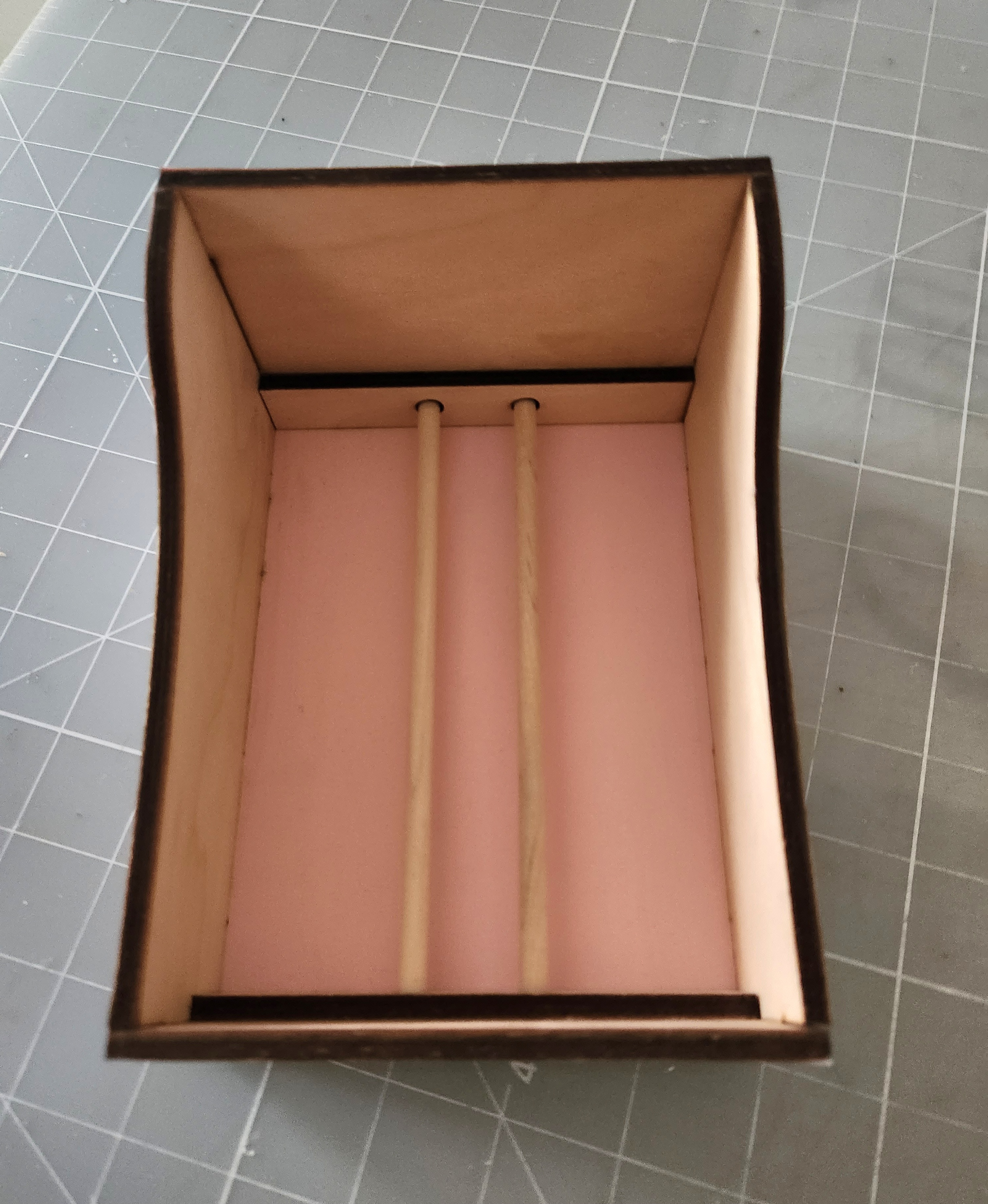Repeat this process for the other side of your box as well as the front piece. Then glue your box together using a strong and permanent glue like Beacon glue. I held my piece in place a few seconds until the glue holds. Repeat for all pieces, making sure you insert both dowels inside your box before gluing the front and back pieces in place. Here's how it will look once your box is assembled.: