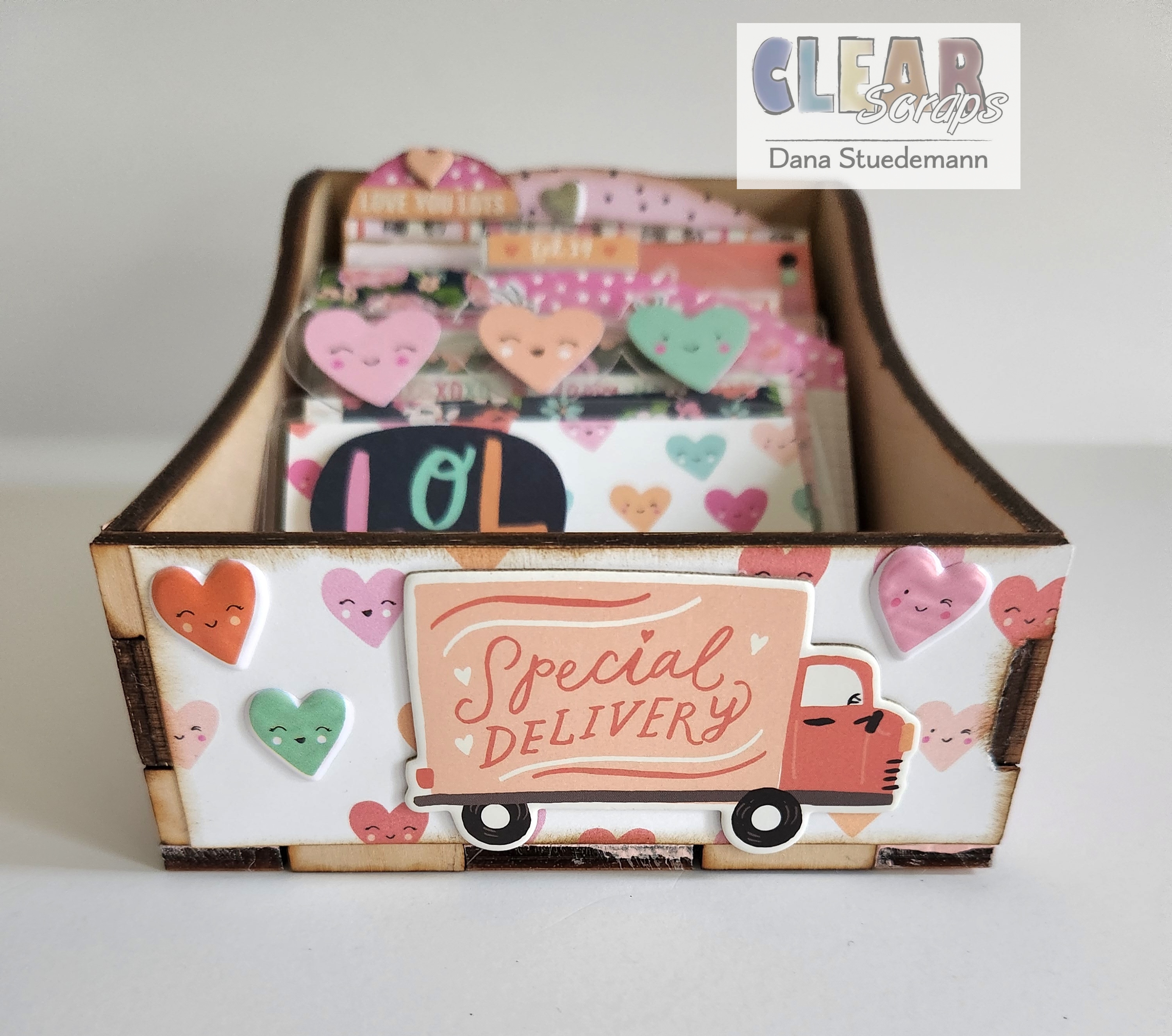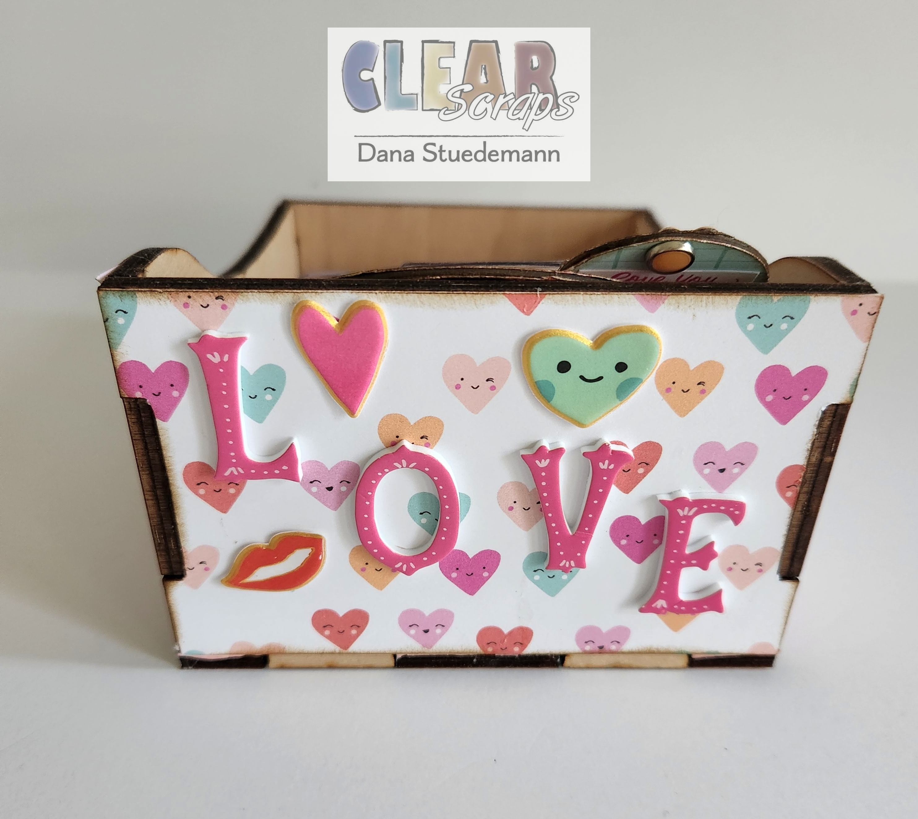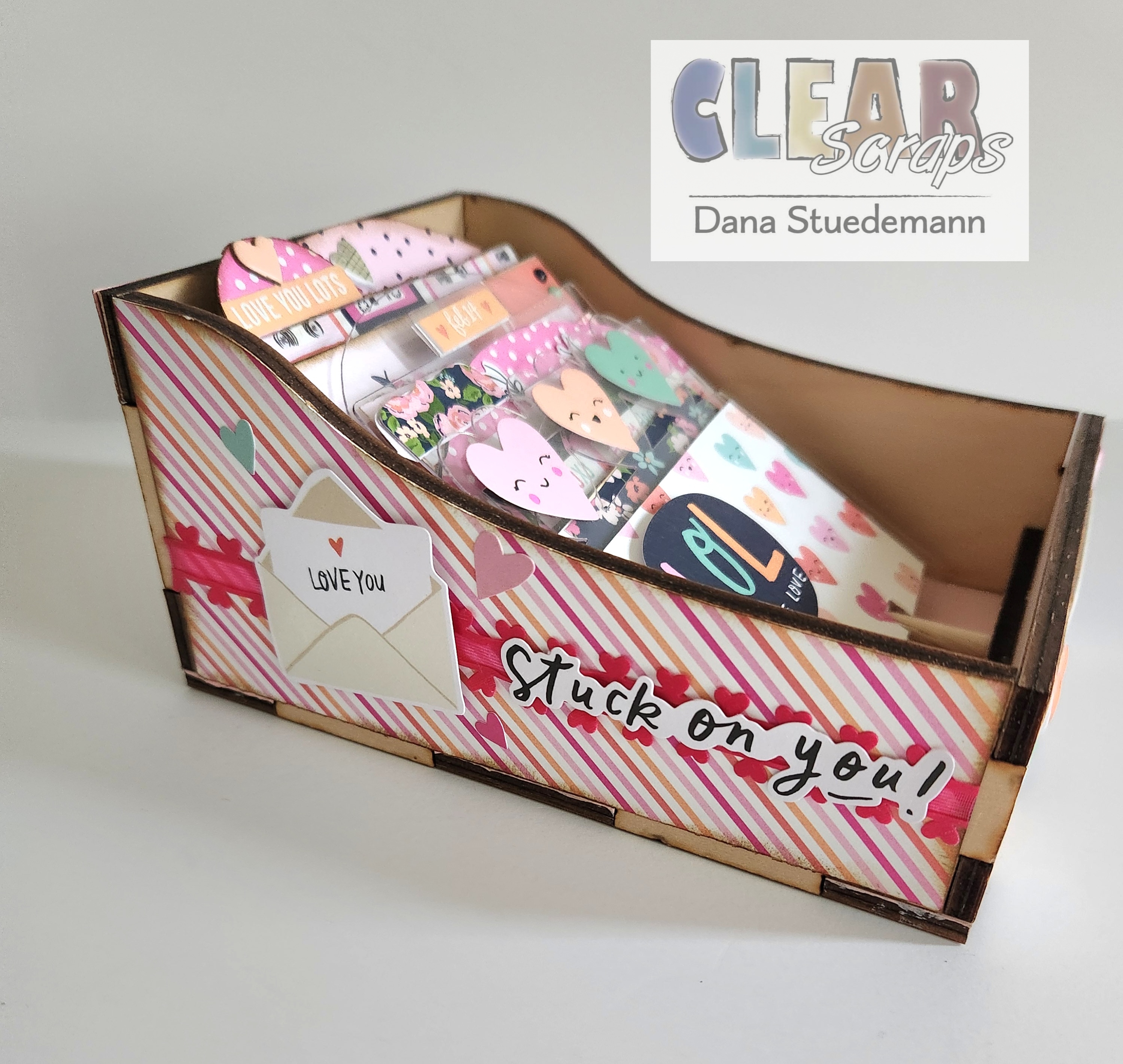 For today's project, I'll be using Clear Scraps High DIY Wood box Click here I'll also be using a variety of different Memory-Dex cards in both acrylic and chipboard. You can mix the cards up anyway you want and according to what style or theme you chose. Since Valentine's Day is coming up, I chose hearts and all things to do with love!