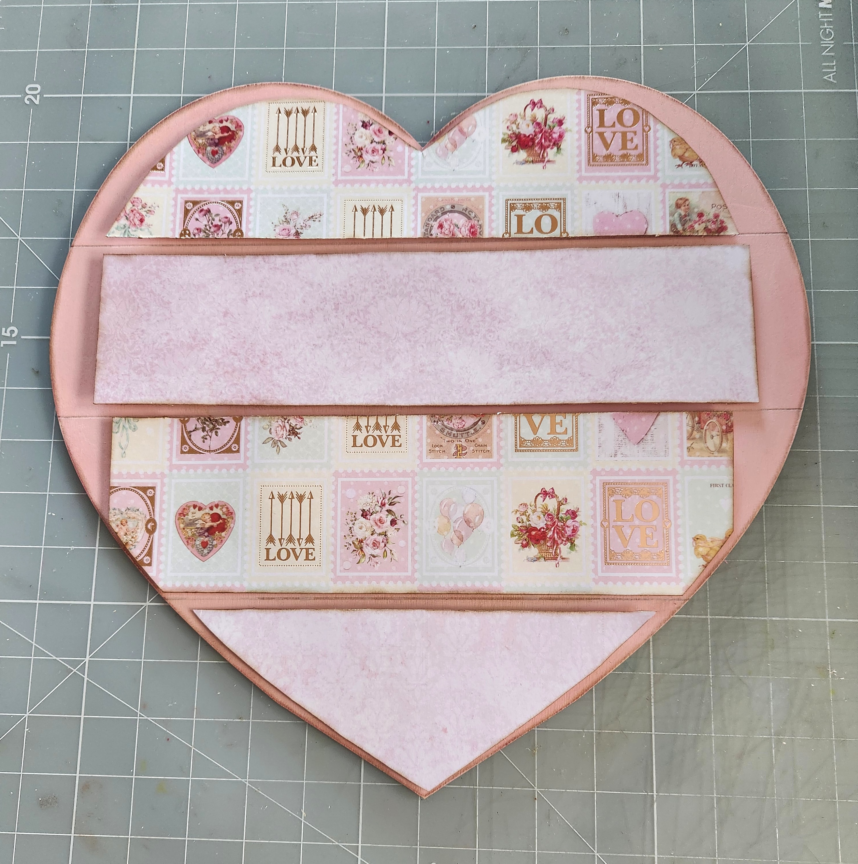 I chose two different coordinating papers from the collection, I traced and cut each piece out. Inked along the edges using Tim Holtz Distress Ink Gathered Twigs. Then I applied foam tape on the back of each piece of paper before adhering to each section of my Shiplap Heart base. Set your heart aside for now.