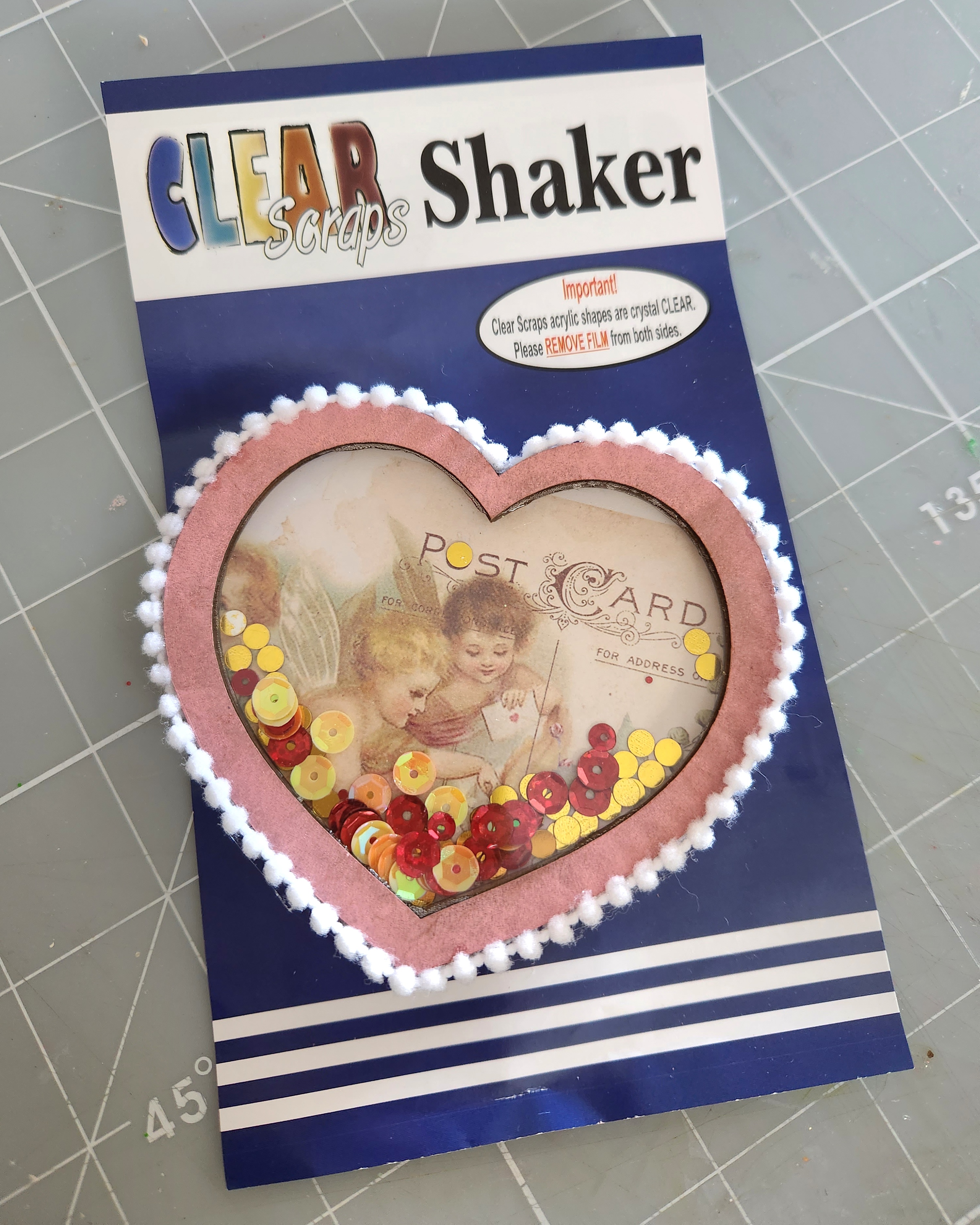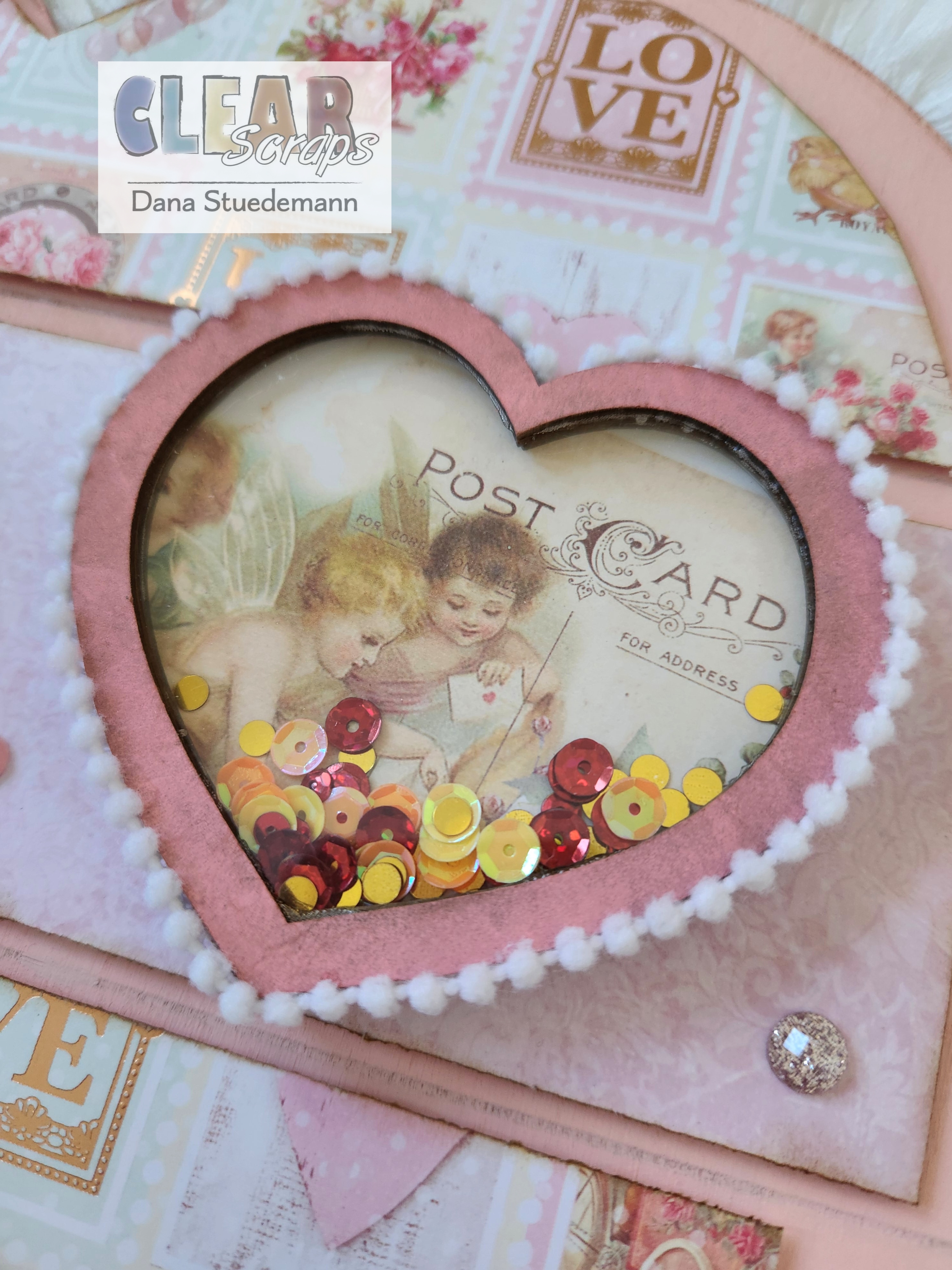 Next glue your next two chipboard pieces in place. Fill your shaker with sequins, glitter, confetti or beads. I chose Clear Scraps Summer sequins Click here now taking your acrylic shaker piece, peel off the protective film from both sides. Then glue in place. Leave undisturbed (no shaking) until throughly dry. Then I glue some white pom pom trim around the edge of my shaker heart!