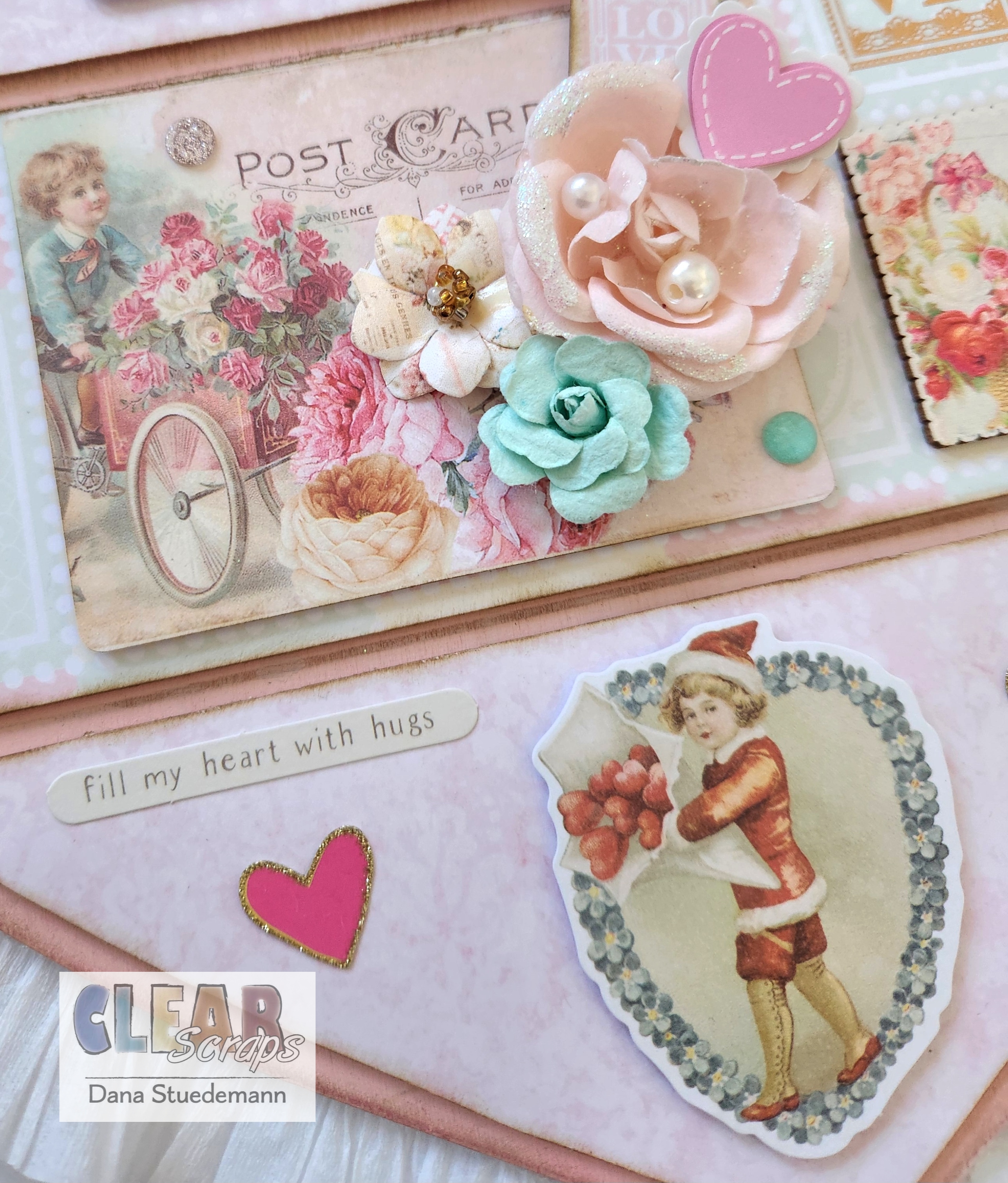 I adhered some wood stickers, Prima flowers, crystals and sticker hearts! Some ephemera pieces I added foam dots to the back before adhering. I love to tuck in some pearls in between my flowers and a few hearts! Here's some closeups!