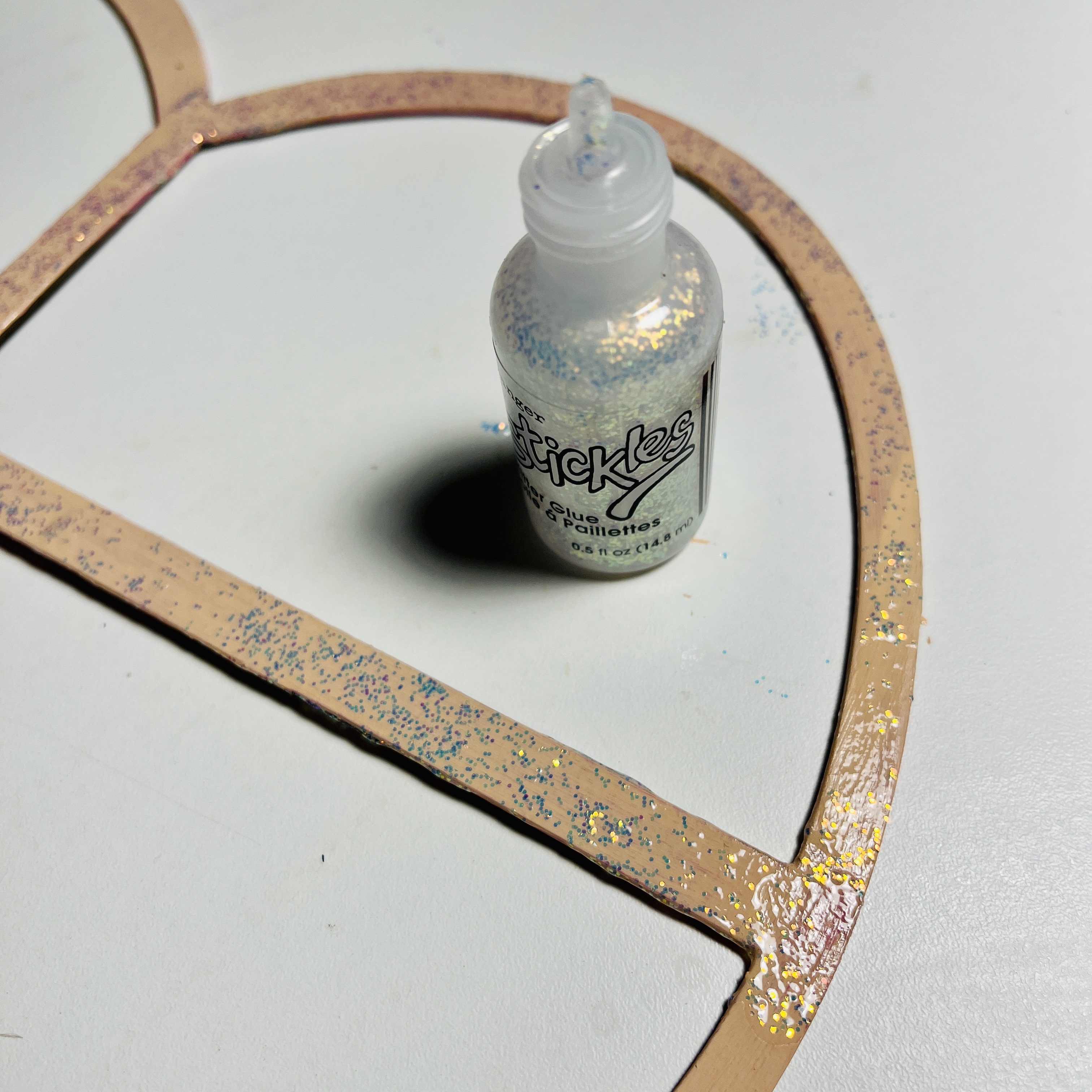 Next, I painted the top of the frame in peach paint and set aside. Once it was dry I added a coat of glitter glue to the top.