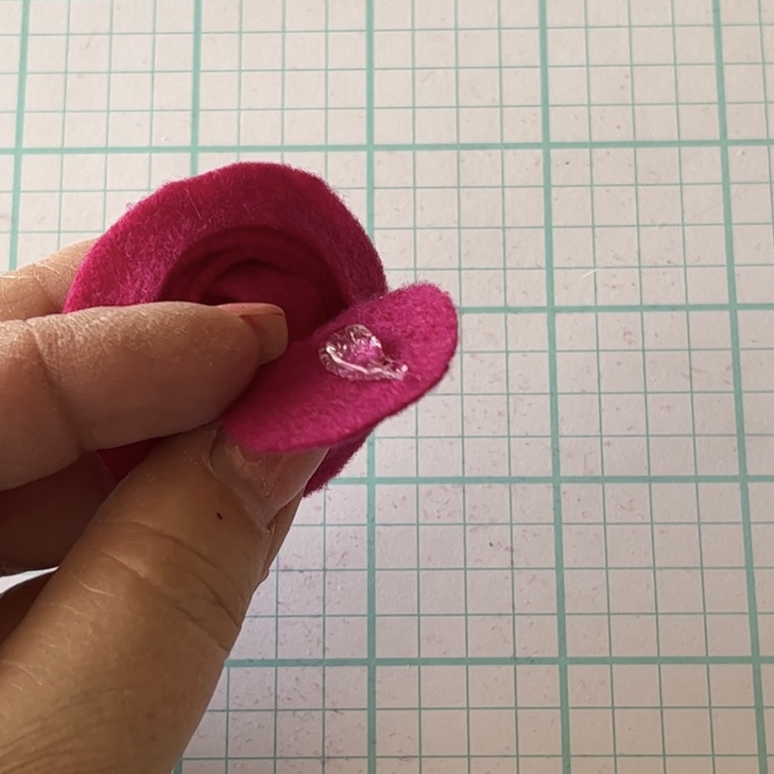 Use some hot glue to glue the center in place, then add a green felt leaf shape (I hand cut mine.).