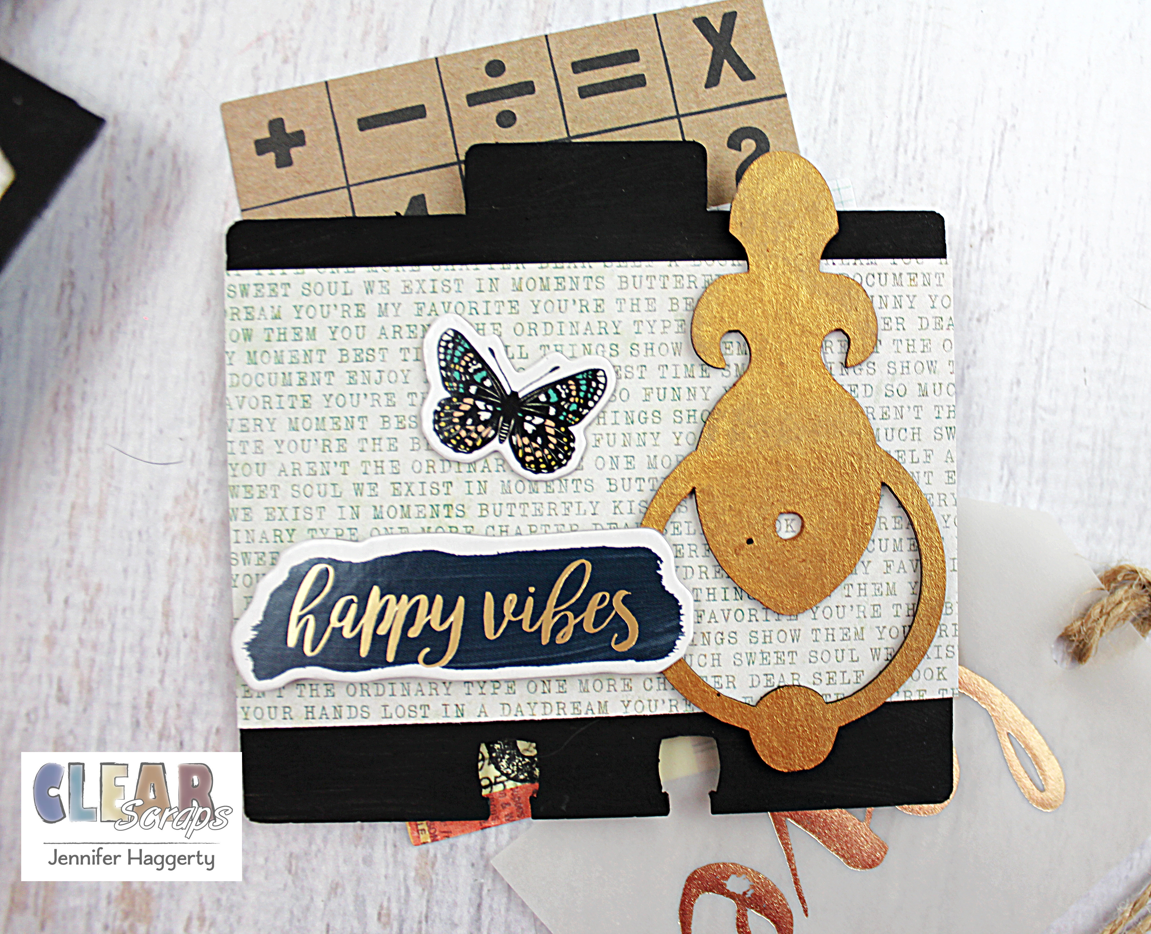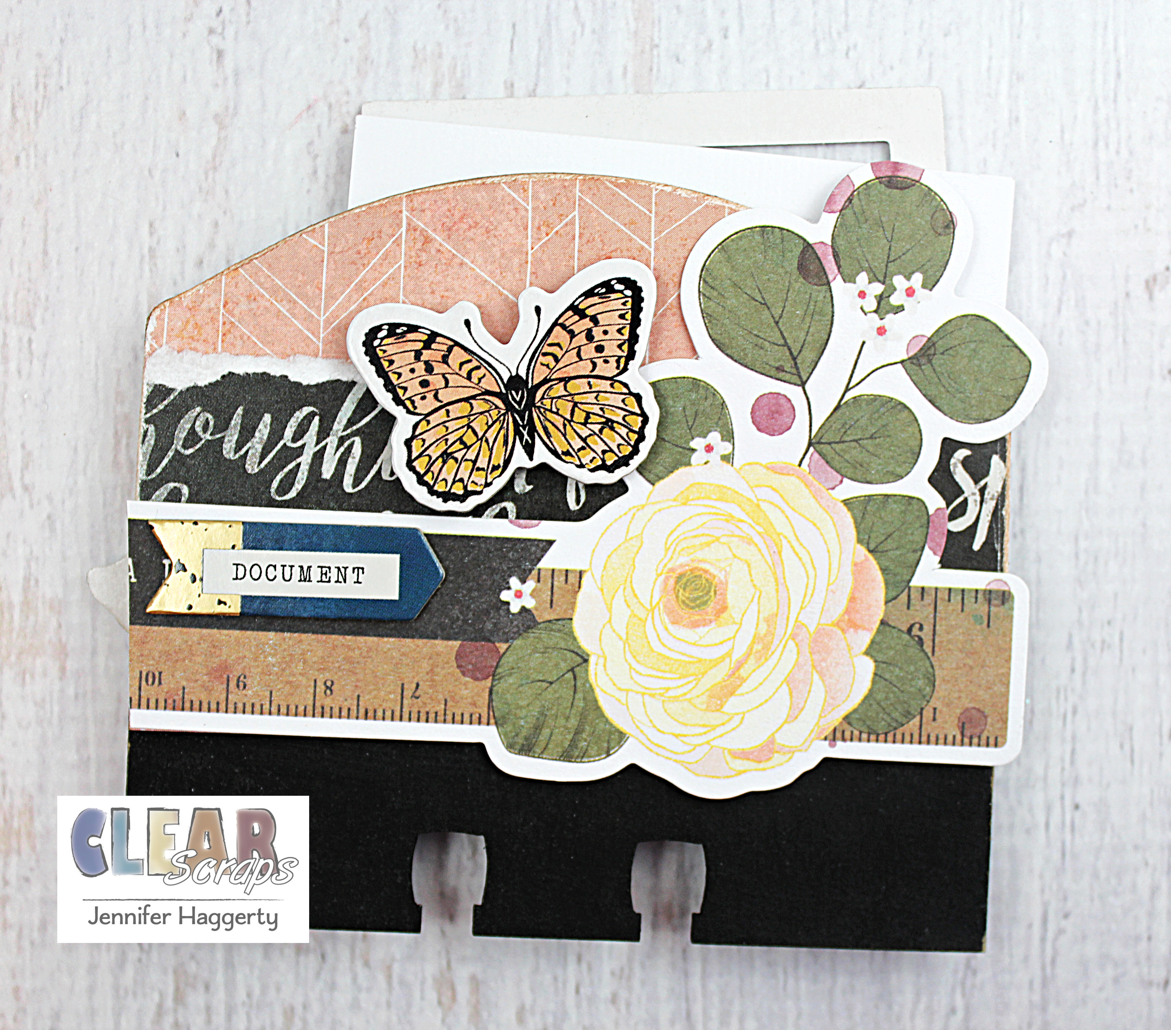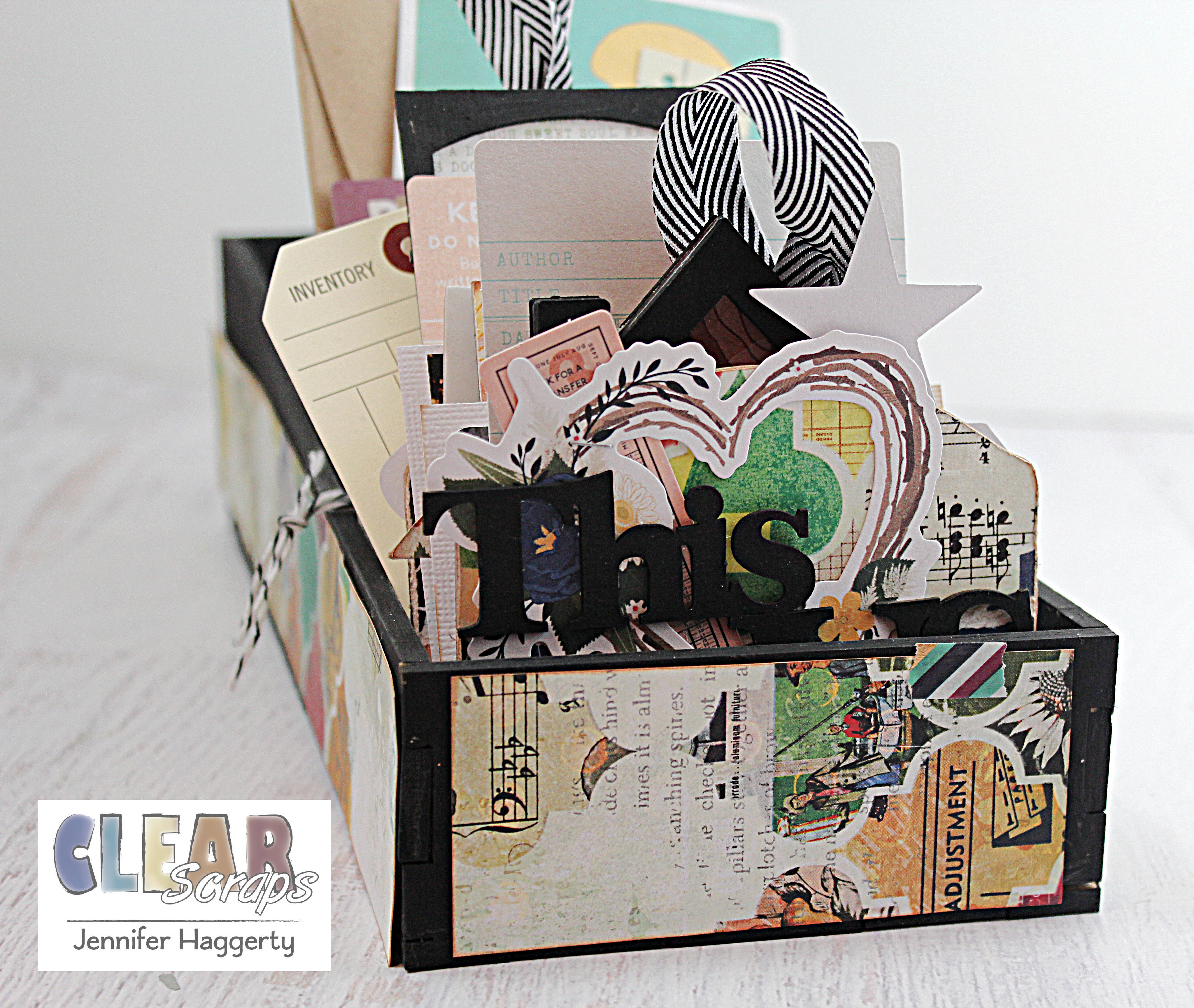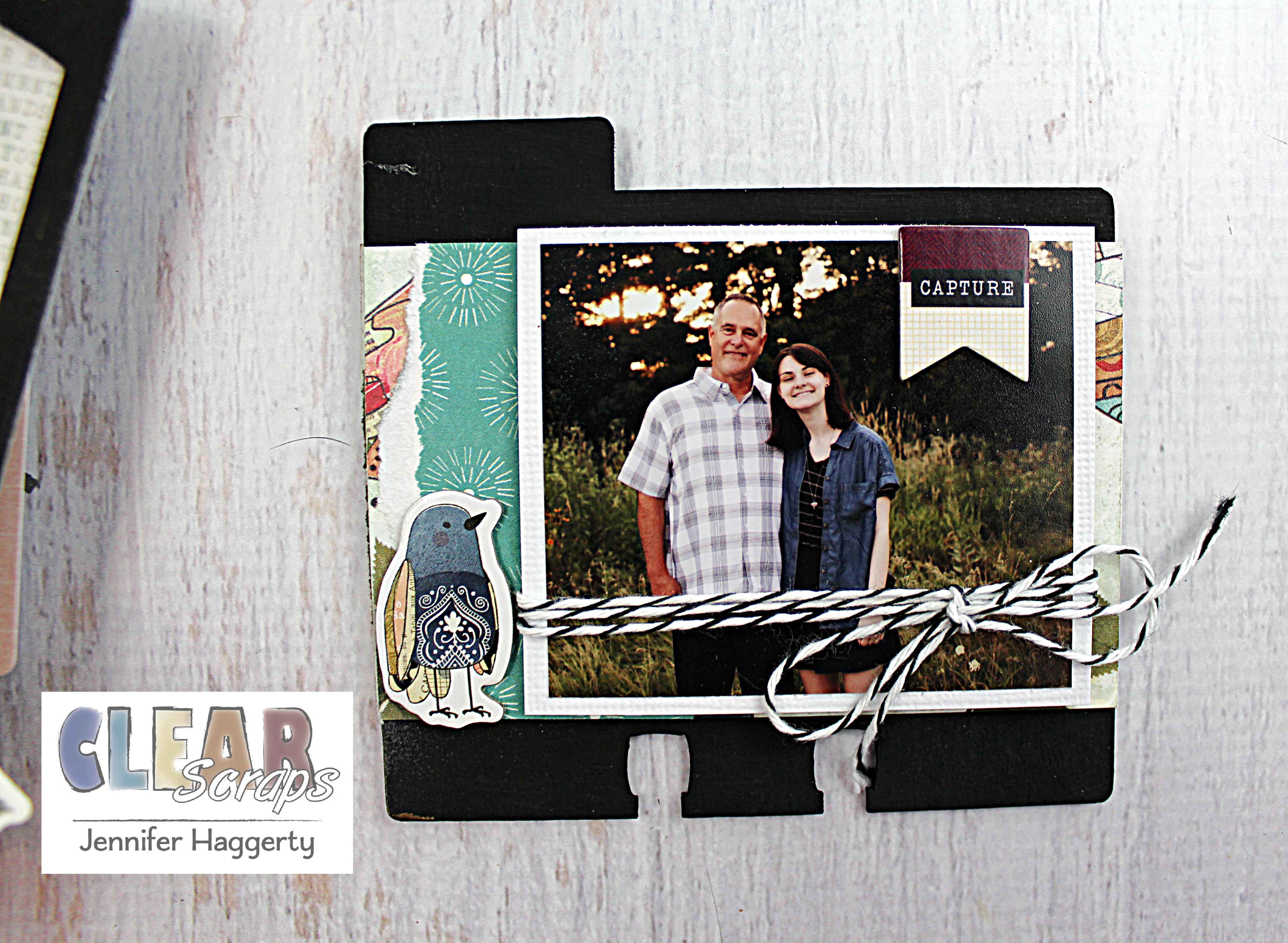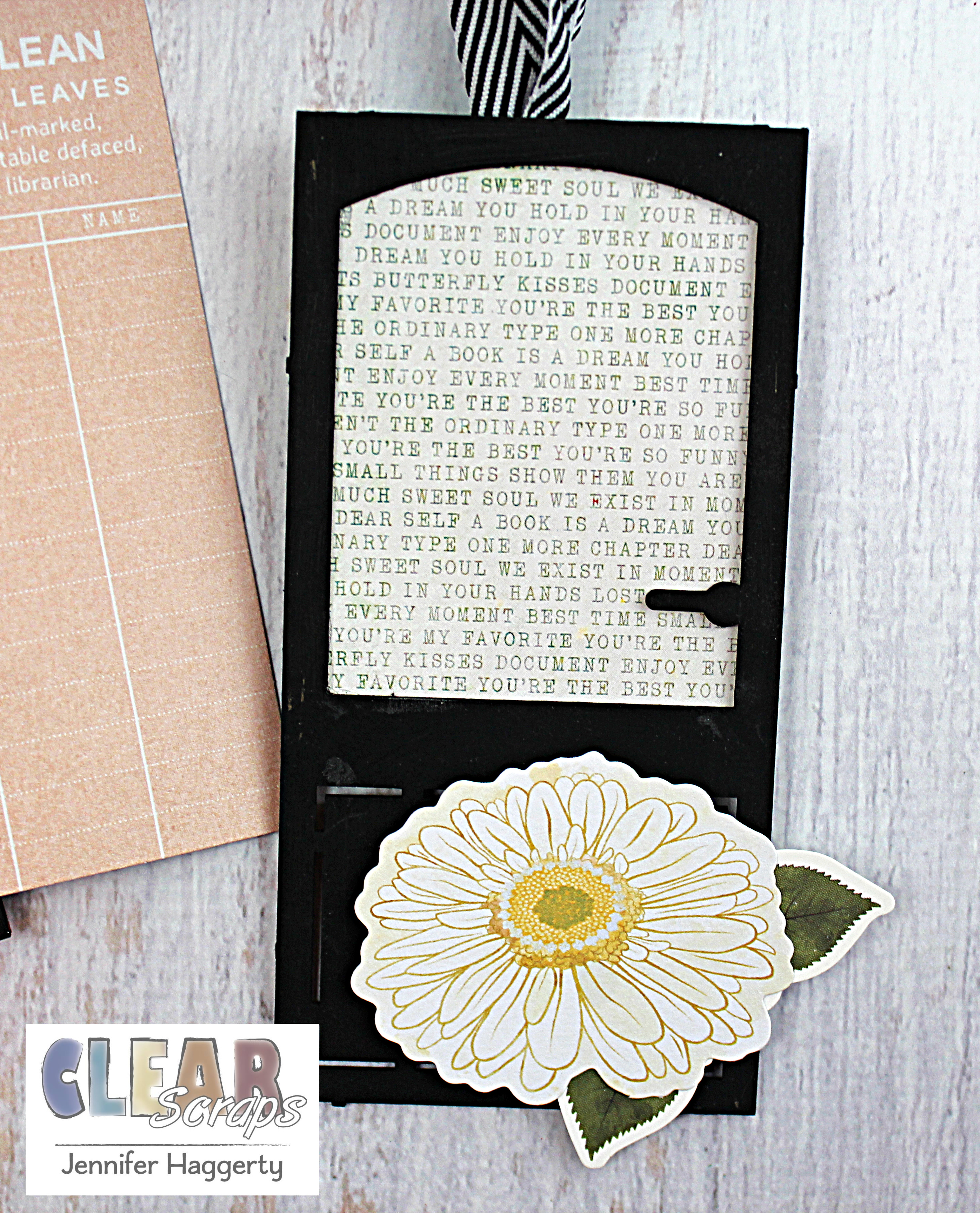 Here it is on the Rounded Chipboard Divider Card which I covered in patterned paper and small embellishments. I love the way the black stands out against the paper!