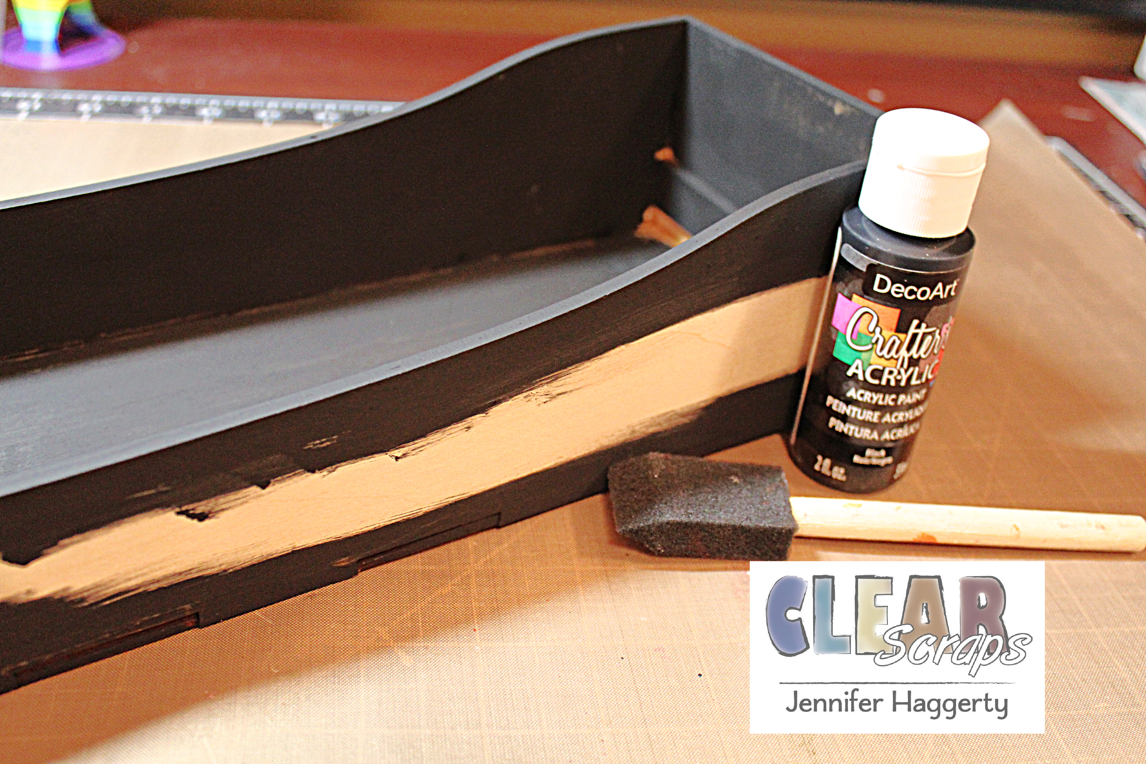 After assembling my DIY Wood Box with wood glue, I painted the sides and inside with black acrylic paint. I left a blank space for where I knew I would be placing patterned paper. Next, with my Beacon Adhesive I applied patterned paper to the front, sides and back of my DIY Wood Box.