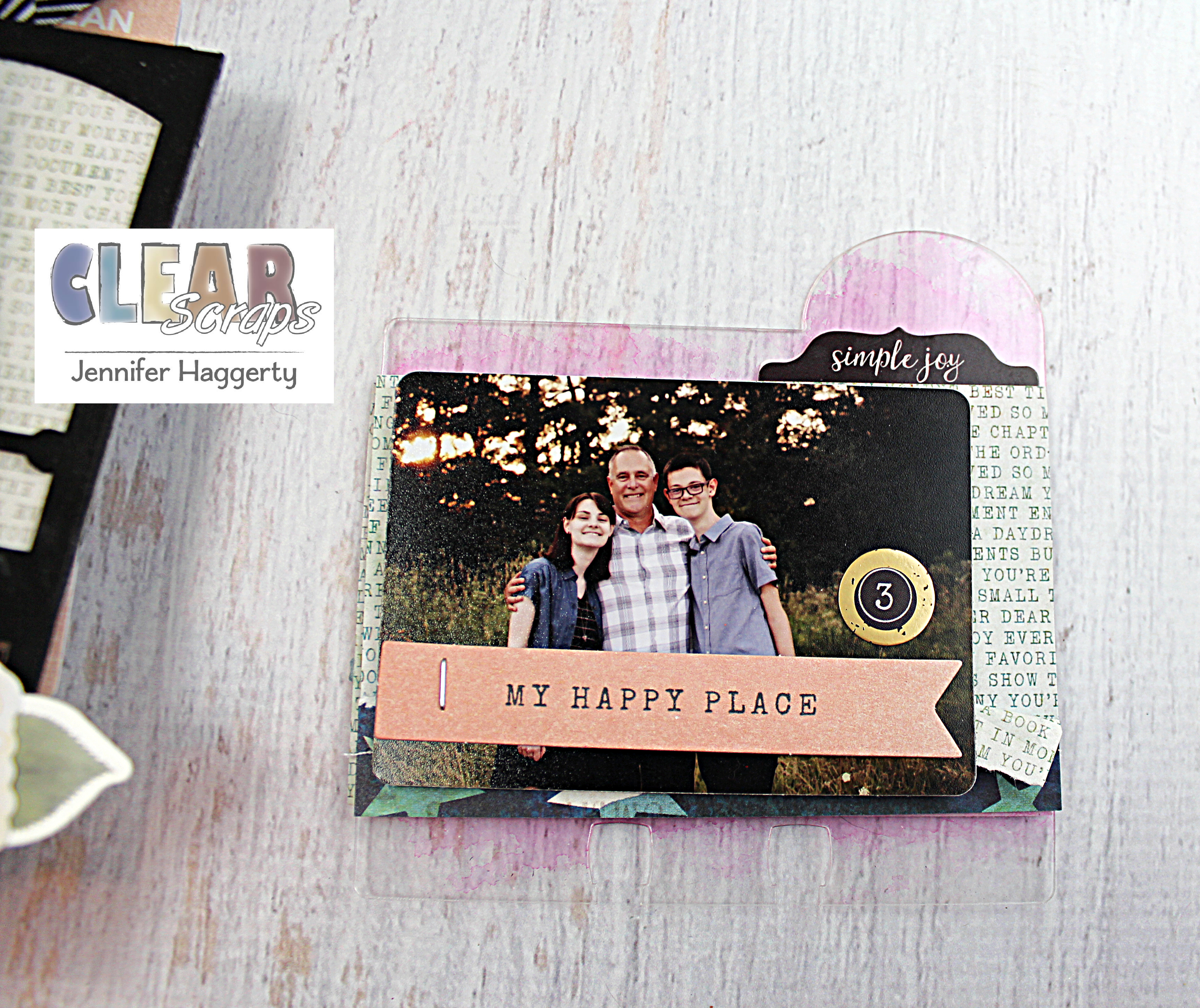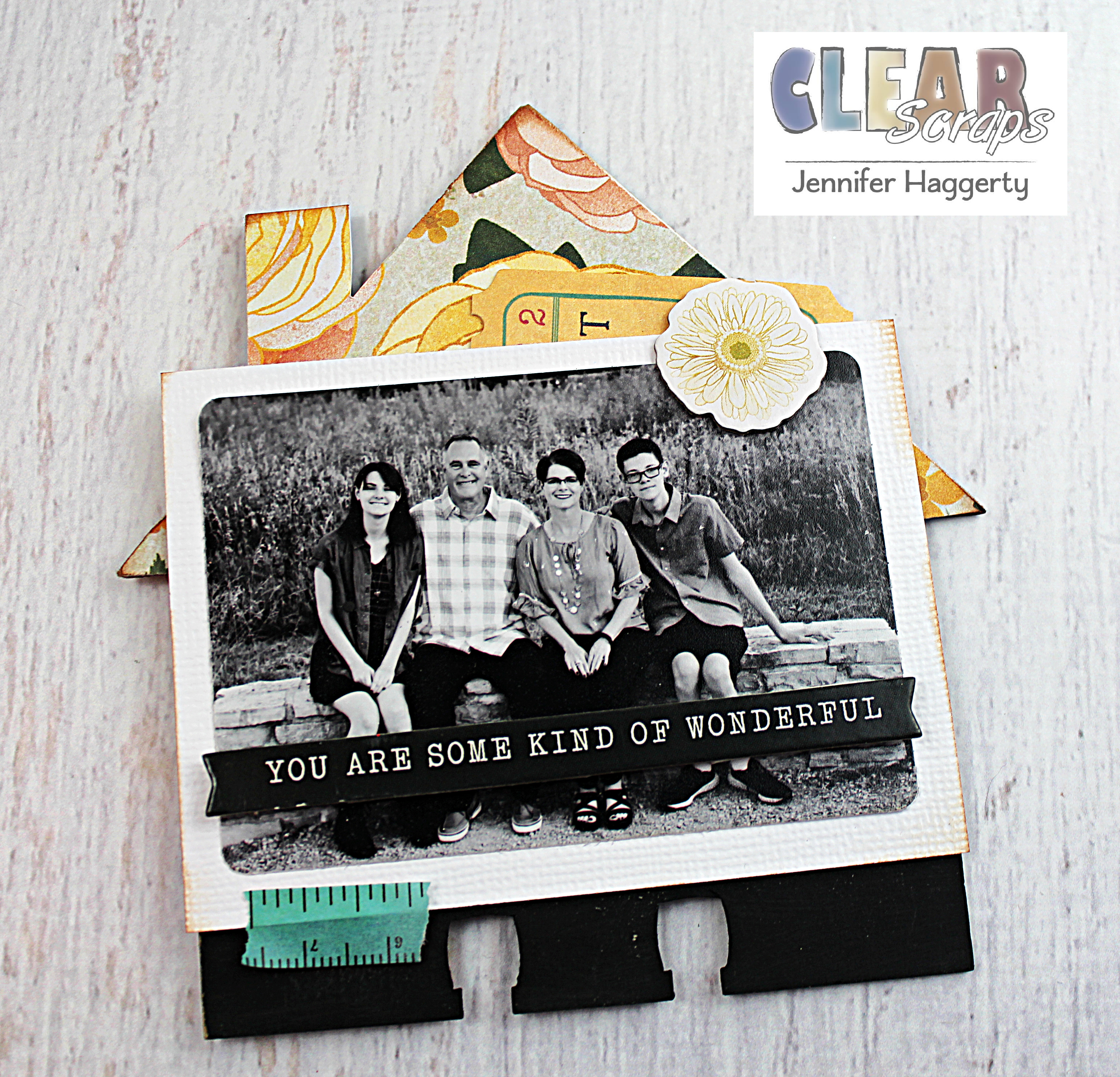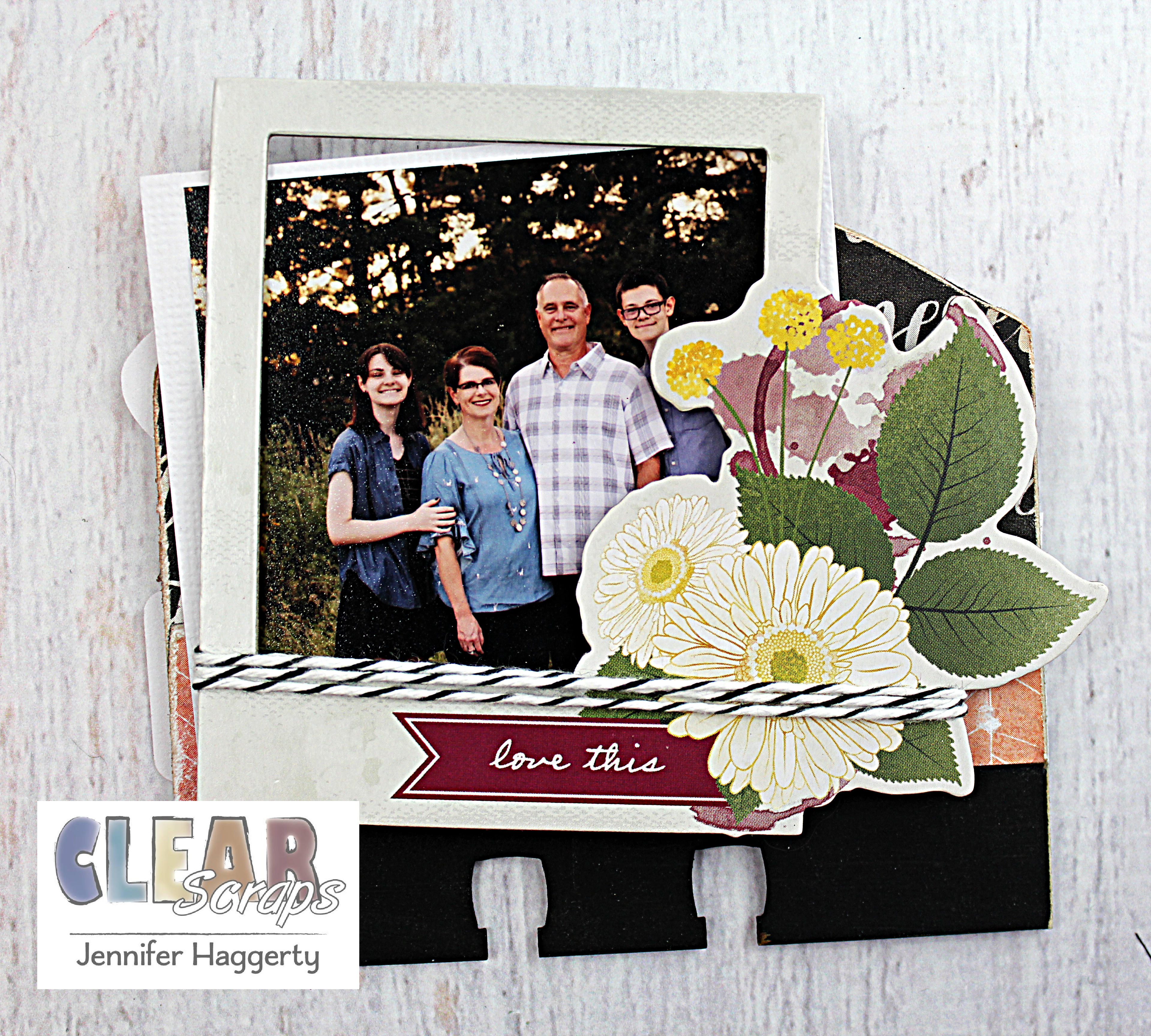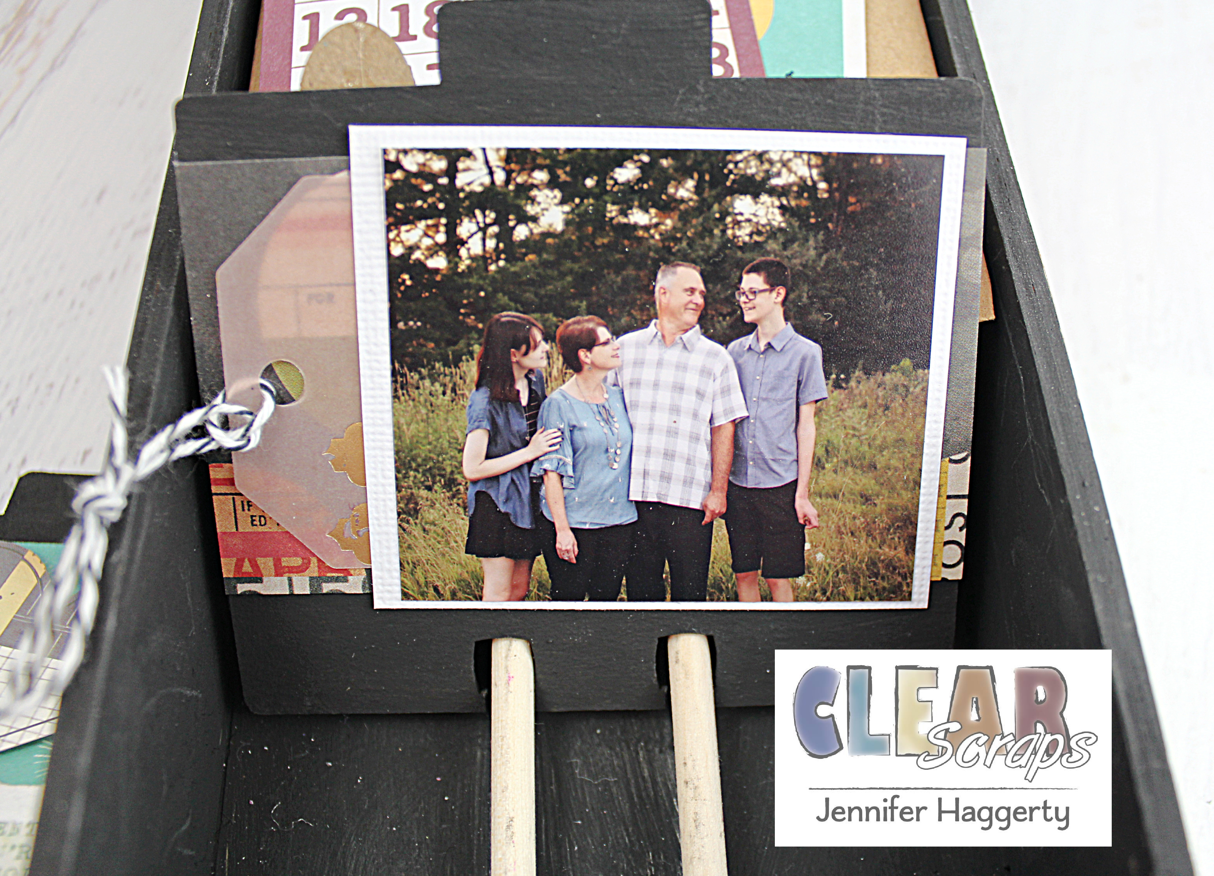 Since my project is about my family, I decided to use the House Chipboard Divider Cards. I simply painted the bottom third with black acrylic paint and covered the top with patterned paper. Most dividers I used a wallet sized photo matted onto white cardstock.