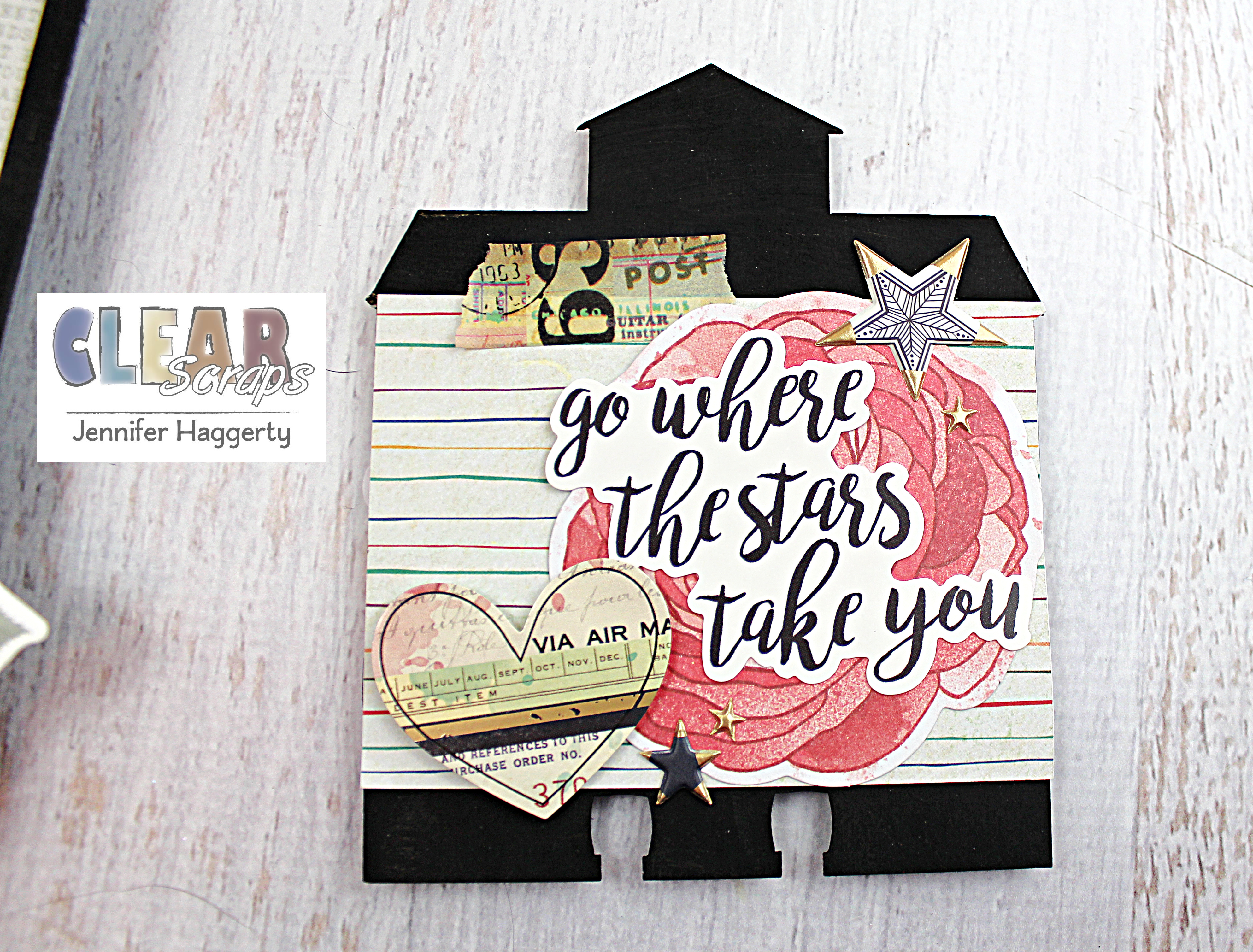 Another cute tuck in! I used the Basic Door Chipboard Embellishment Shape which I painted black and backed the "screen" with patterned paper.