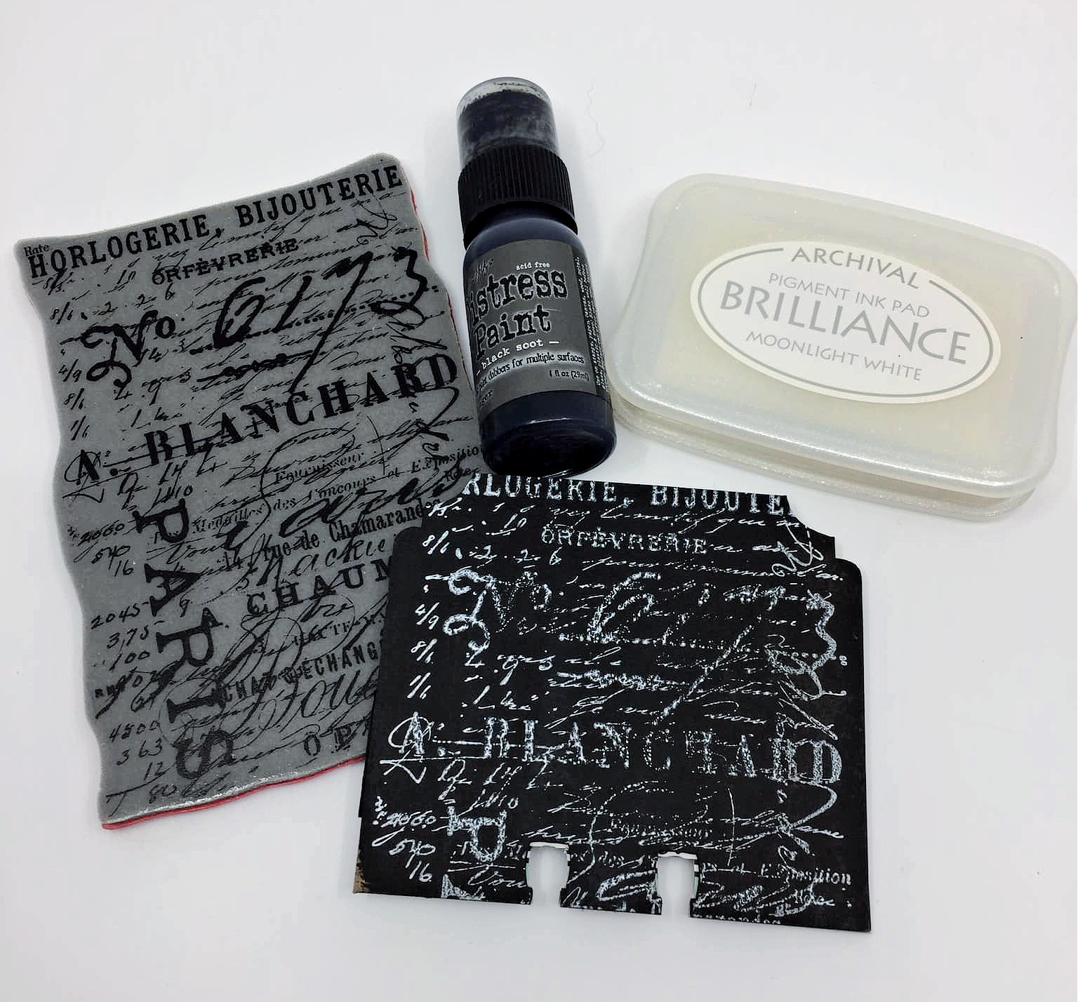 To make the cards for the box, I started by painting the back of the chipboard cards black.