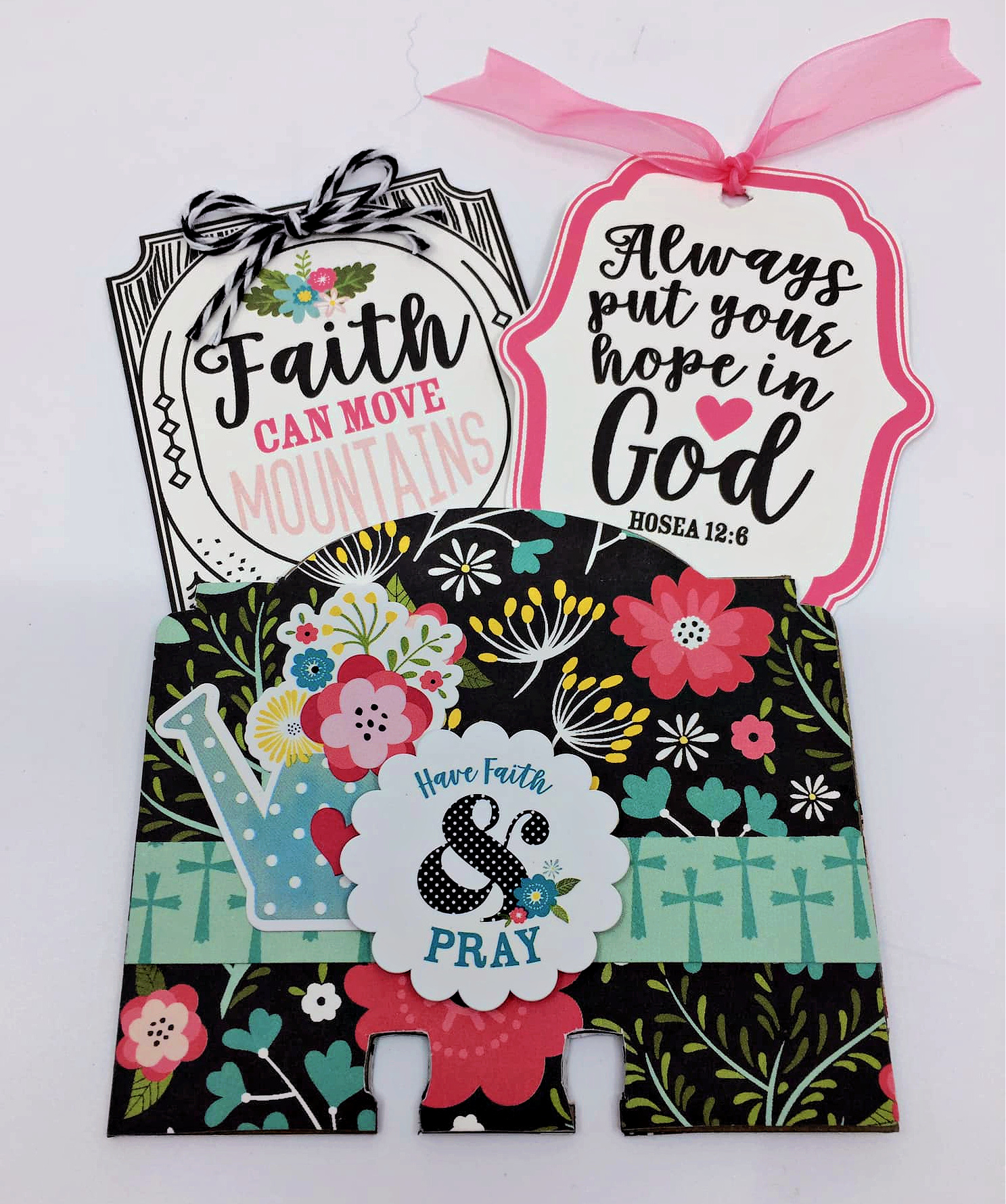 Other: Acrylic paint–white, black, Brilliance ink–Marshmallow White, Echo Park Forward With Faith collection paper and stickers, twine, ribbon, script stamp, foam tape, glue.