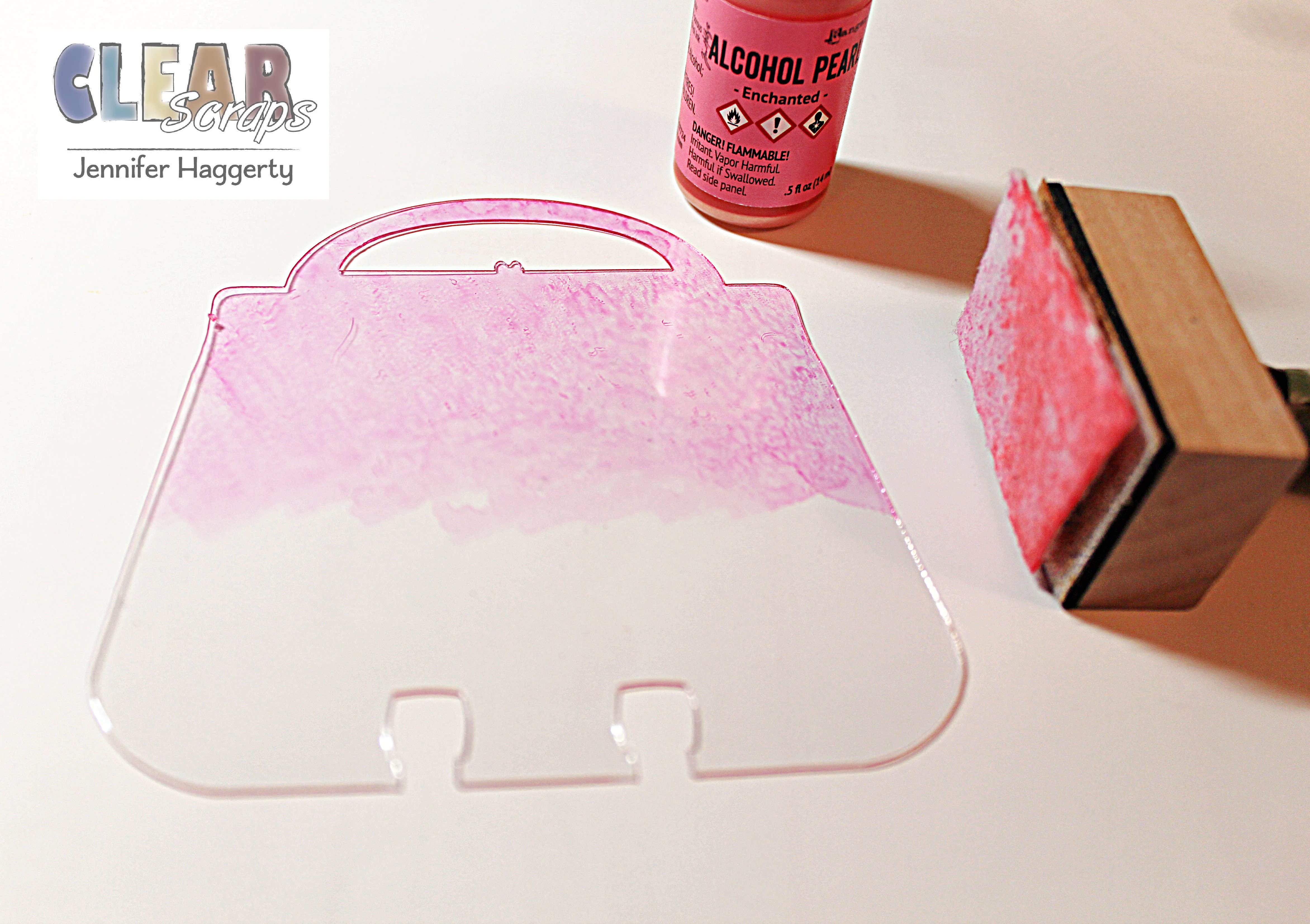 I used a pearlized pink color that looks lovely on the acrylic! Again using my Beacon Adhesive, I adhered patterned paper to the bottom portion of my card. I trimmed off excess paper with scissors and an x-acto knife followed by using my sanding tool.