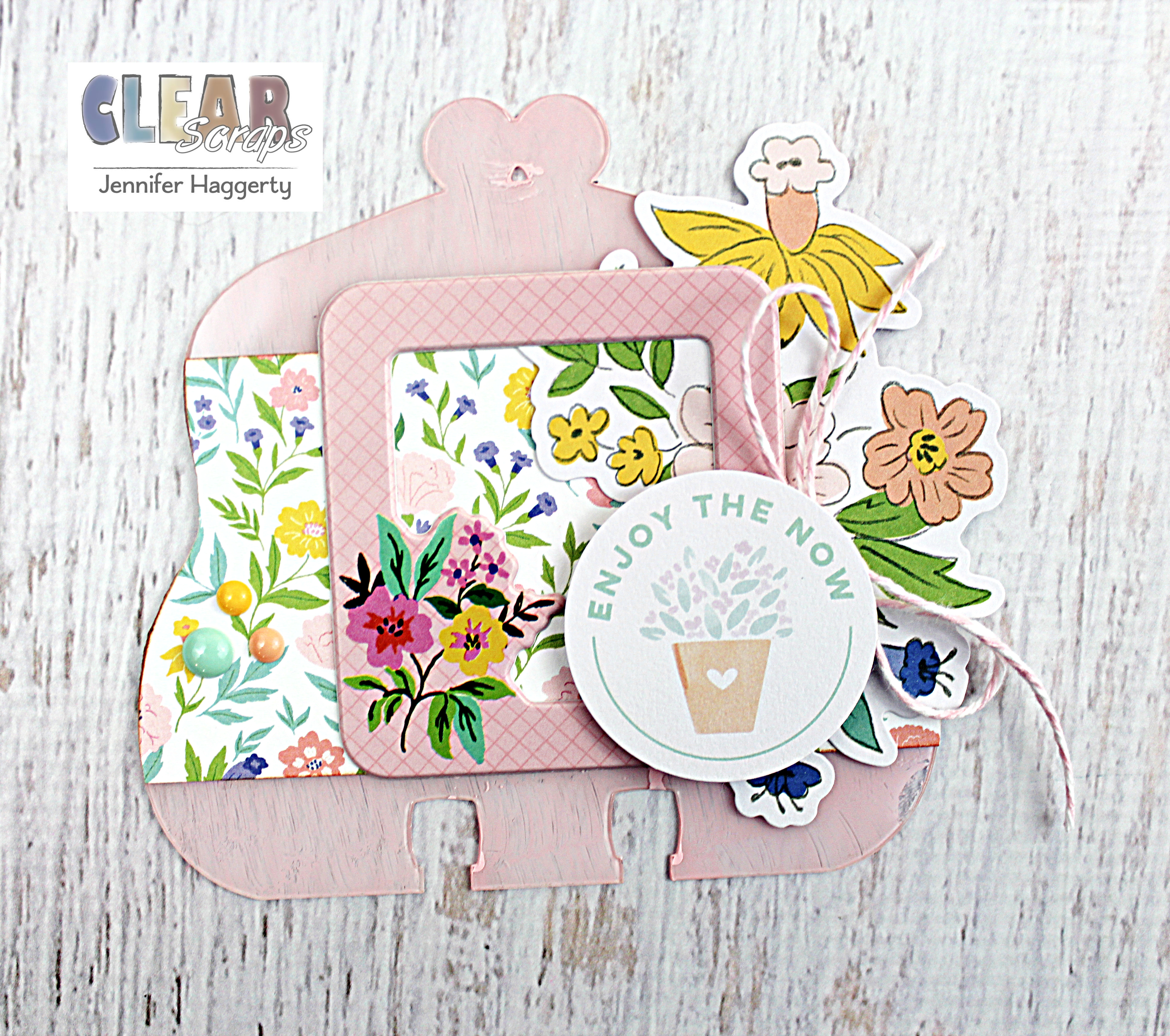 Additional products used: patterned paper, die cut shapes, stickers, epoxy frame, enamel dots: Pinkfresh Studios; alcohol ink: Ranger; paint: FolkArt; bakers twine: Whisker Graphics, adhesive: Beacon, Scrapbook.com, Tombow; sewing machine: Janome; misc: thread, x-acto knife, sanding tool, seam binding.