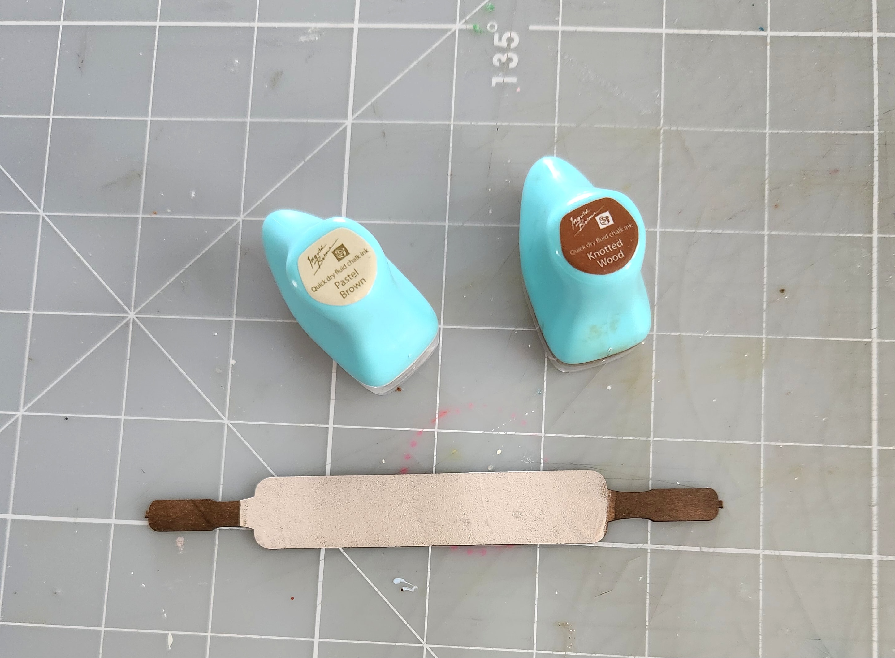 Take you Chipboard Baking Embellishment piece and cut away the rolling pin from the frame. You can save the other embellishments for future projects. Using some Prima Ingrid Bergman Chalk Ink Knotted Wood and Pastel Brown, I applied the Chalk onto the chipboard handles and rolling pin.